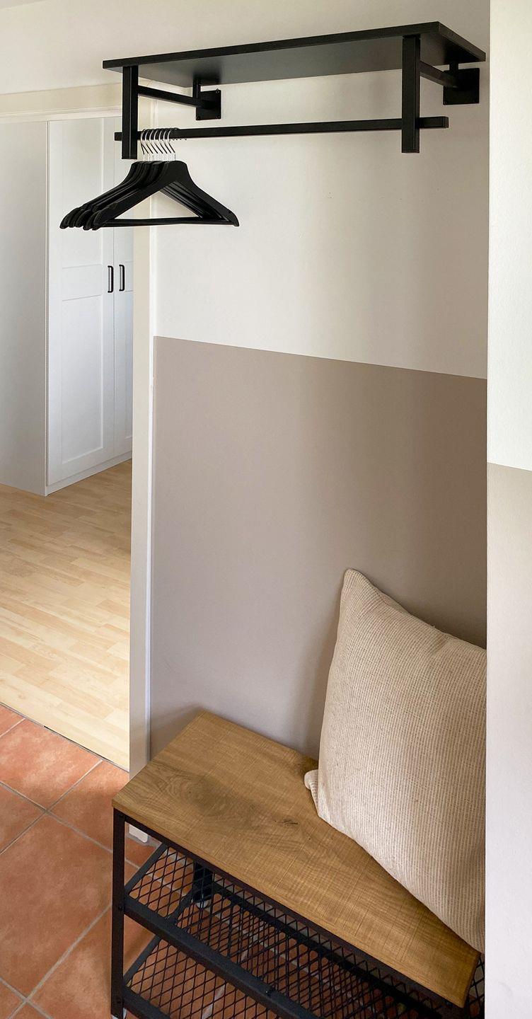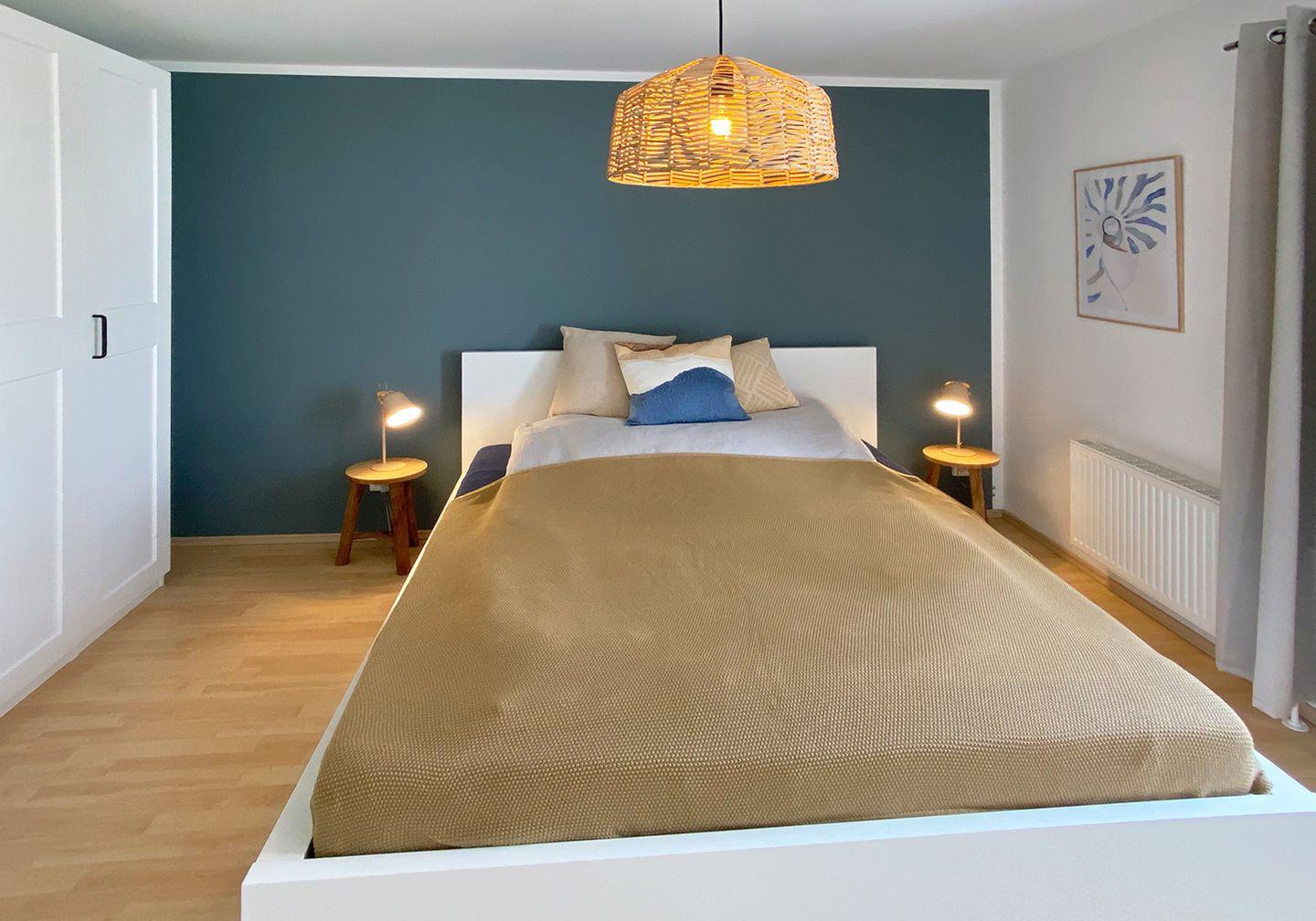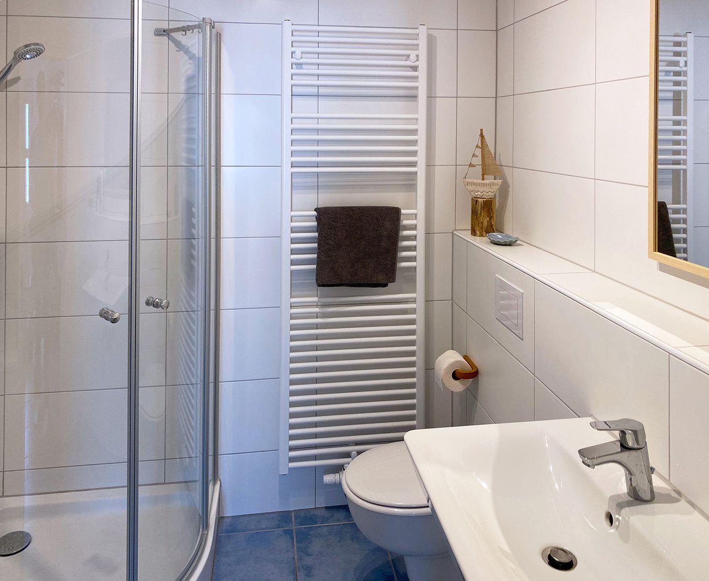 Ein modernes Duschbad mit WC, Waschbecken und Waschmaschine rundet den Wohnbereich ab. Das Schlafzimmer ist mit einem Doppelbett (160 x 200 cm, durchgehende Matratze) und einem Kleiderschrank ausgestattet. Zusätzlich gibt es eine Schlafkoje mit einem Bodenbett (120 x 200 cm), ideal für ein Kleinkind oder eine dritte Person. Ein Hochstuhl für kleine Gäste ist ebenfalls vorhanden. Fliegenschutzgitter sorgen für angenehmen Schlaf, auch bei offenen Fenstern. Die Wohnung verfügt außerdem über einen Fahrradschuppen und einen PKW-Stellplatz.