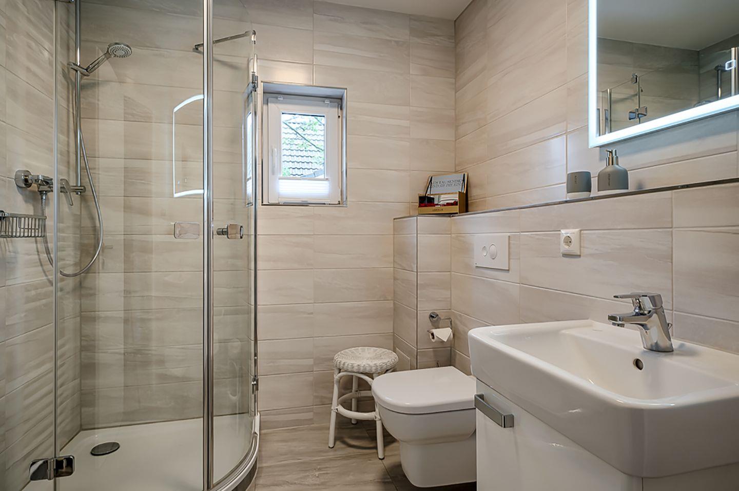 Ein modernes Duschbad mit WC und Waschbecken befindet sich ebenfalls im ersten Stock.