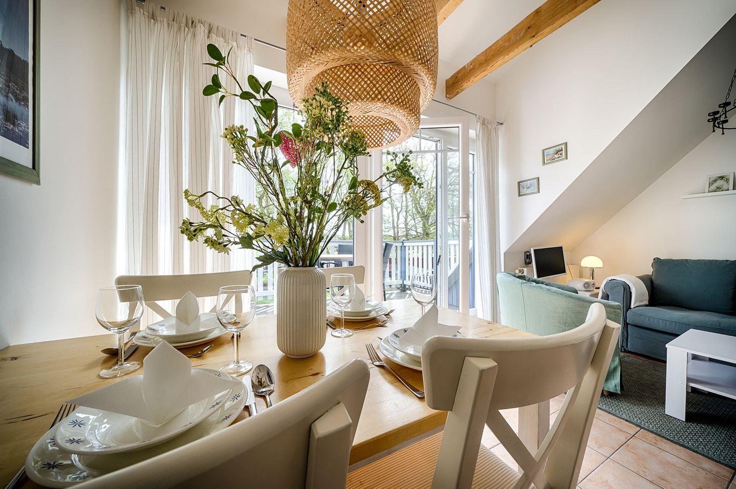 Diese charmante Ferienwohnung im Ortskern von Prerow ist der perfekte Rückzugsort für Familien oder Paare, die Ruhe und Komfort suchen. Mit etwa 57 m² verteilt auf zwei Etagen (OG und DG) bietet sie Platz für bis zu 4 Personen und ein Kleinkind (bis 3 Jahre). Im ersten Stock befindet sich der gemütliche Wohnbereich mit einer bequemen Sitzgarnitur, ideal zum Entspannen nach einem erlebnisreichen Tag. Ein kleiner Flachbild-TV und ein Radio sorgen für Unterhaltung, während der Essbereich für fünf Personen genug Platz für