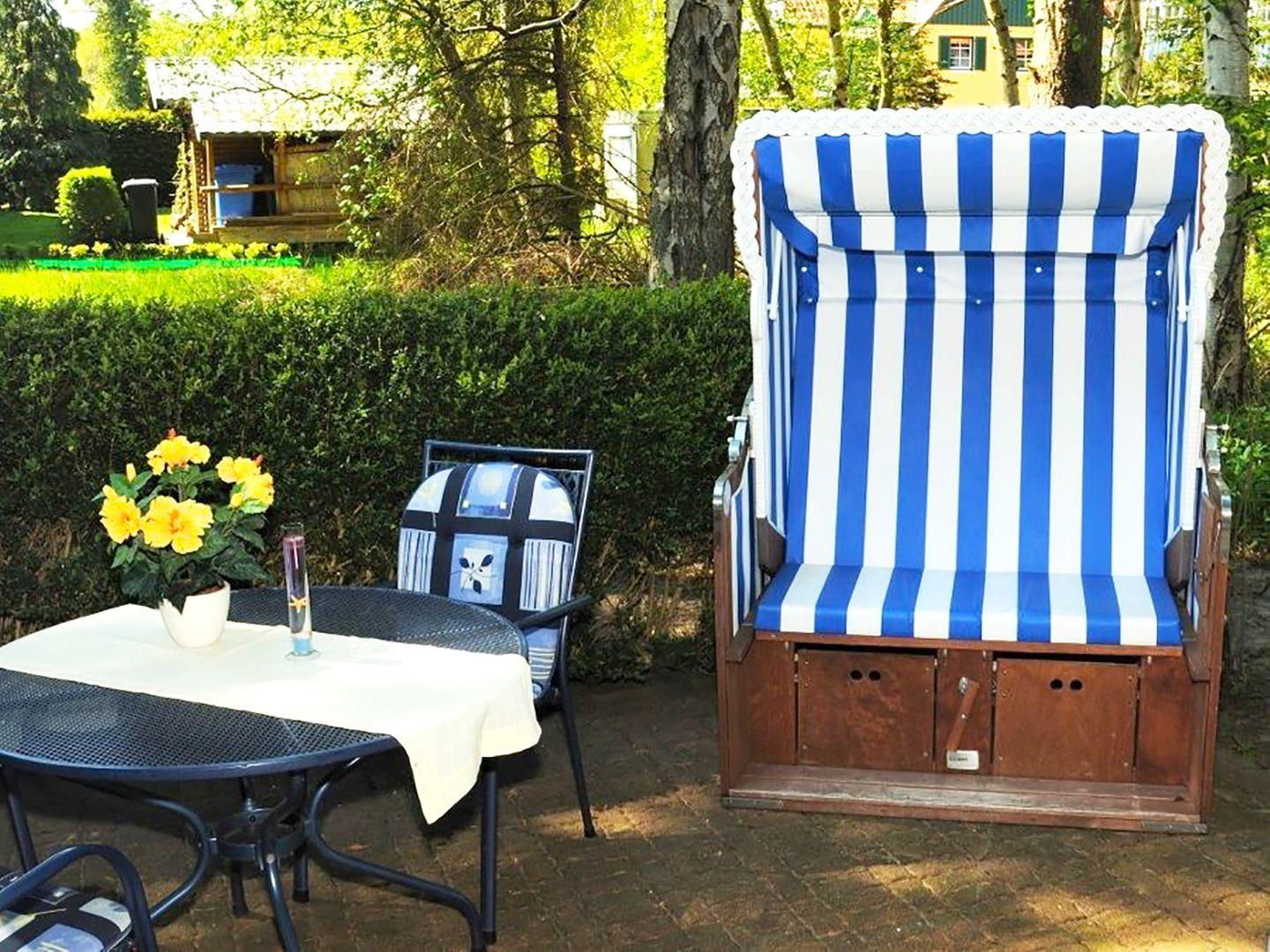Ferienwohnung für 2P + K in ruhiger Lage, Parkplatz, WLAN, Terrasse, Strandkorb