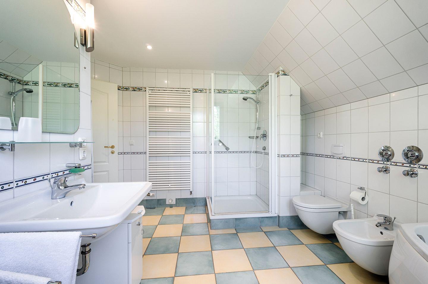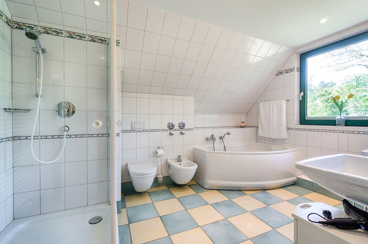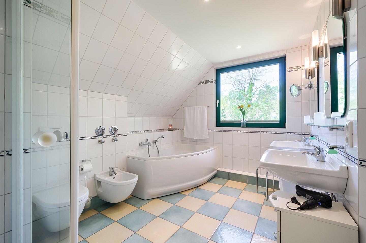 Das großzügige Tageslichtbad bietet sowohl eine Badewanne als auch eine Dusche, ein WC, Bidet und zwei Waschbecken.