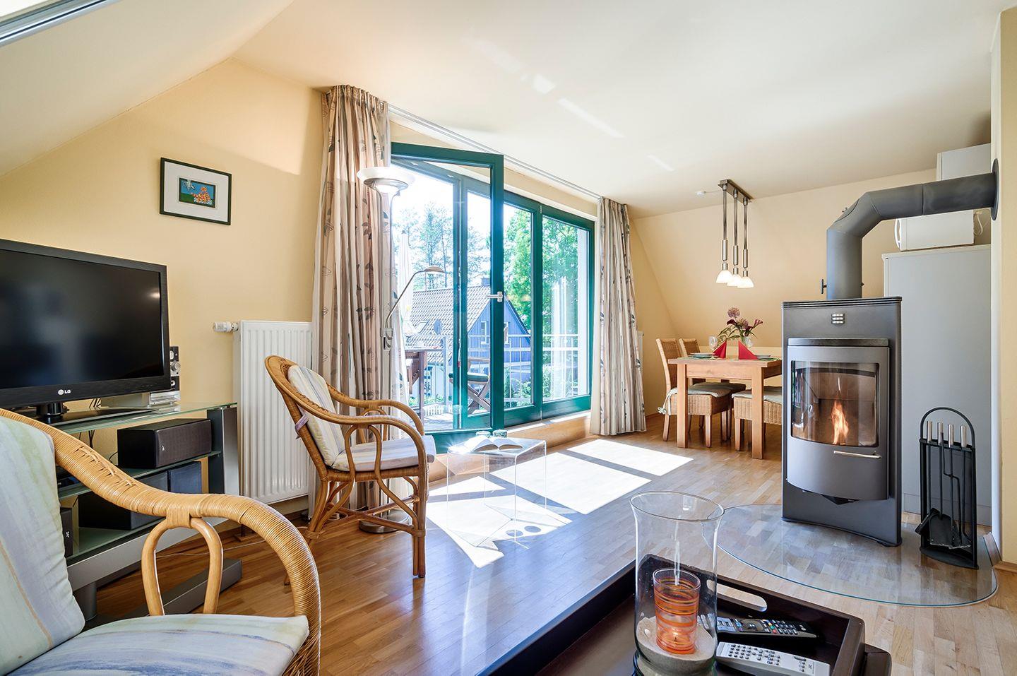 Die gemütliche Ferienwohnung bietet auf ca. 55 m² Wohnfläche Platz für bis zu 3 Personen. Sie befindet sich im Obergeschoss und umfasst einen einladenden Wohnbereich mit einem Schlafsofa mit Federkernauflage (140 x 200 cm), Kaminofen, Radio, CD-Player und Sat-TV sowie einem Essbereich für vier Personen. Die offene Küche ist gut ausgestattet mit einem Kühlschrank mit Gefrierfach, Cerankochfeld, Backofen, Geschirrspüler, Kaffeemaschine und Mikrowelle.