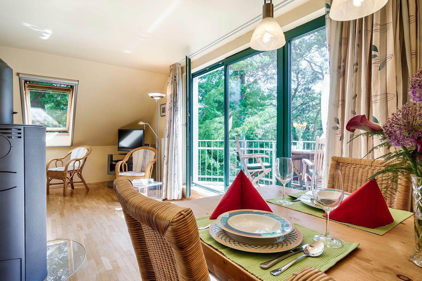 Ferienwohnung bis 3 Personen | ca. 55 m² Wohnfläche | OG | Wohnbereich mit Sitzgarnitur (Schlafsofa mit Federkernauflage 140 x 200 cm), Kaminofen, Radio, CD-Player, Sat-TV, Essbereich für vier Personen, offene Küche (Kühlschrank m. Gefrierfach, Cerankochfeld, Backofen, Geschirrspüler, Kaffeemaschine, Mikrowelle), Tageslichtbad mit Badewanne, Dusche, WC, Bidet und 2 Waschbecken, 1 Schlafzimmer mit Doppelbett (180 x 200 cm), Reisebett (ohne Bettzeug) und Hochstuhl vorhanden, Fliegenschutzgitter, Fahrradschuppen, ein PKW-Stellplatz (Carport), möblierter Südbalkon, Bettwäsche kann für 12 € und Handtücher für 8 € pro Person gemietet werden, Nichtraucherhaus, Haustiere sind nicht gestattet, kostenfreies WLAN vorhanden