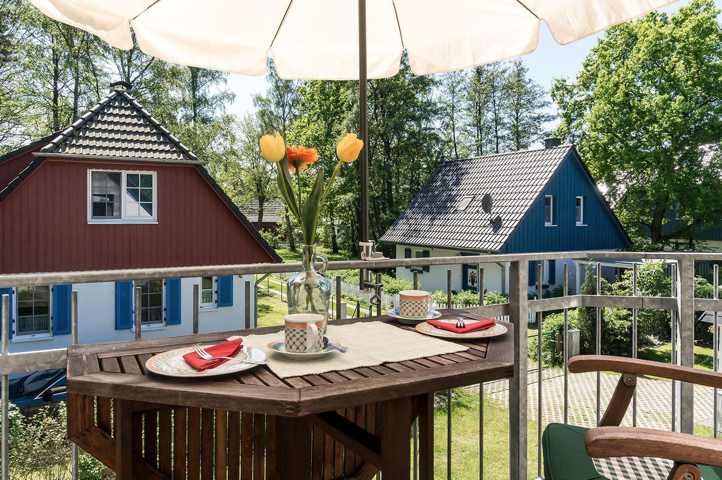 Der möblierte Südbalkon lädt zum Entspannen ein. Zur weiteren Ausstattung gehören Fliegenschutzgitter, ein Fahrradschuppen sowie ein PKW-Stellplatz im Carport. Die Ferienwohnung befindet sich in einem Nichtraucherhaus. Haustiere sind nicht gestattet. Kostenfreies WLAN ist vorhanden.