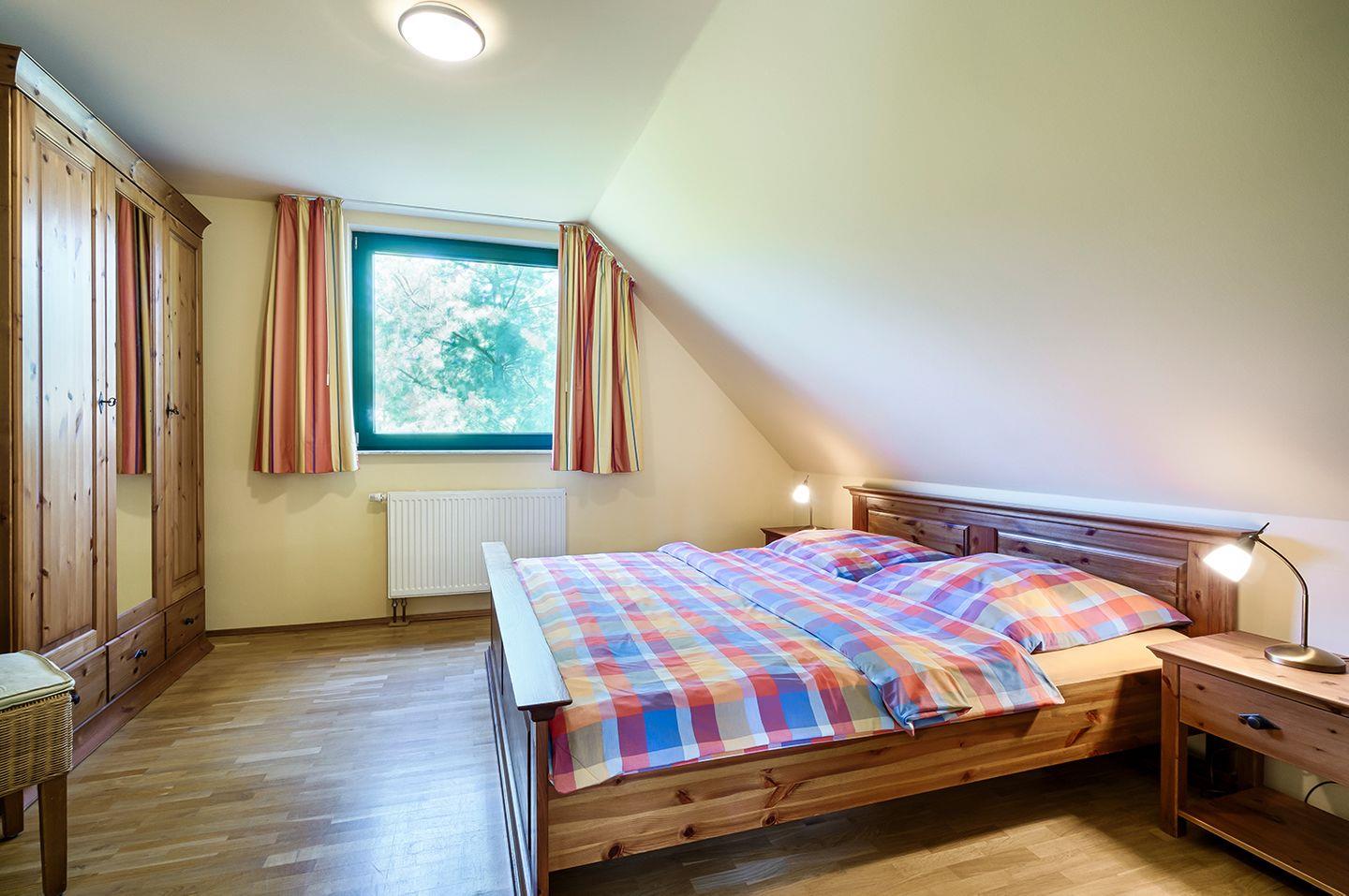 Ein Schlafzimmer mit einem komfortablen Doppelbett (180 x 200 cm) sorgt für erholsame Nächte. Für Kleinkinder stehen ein Reisebett (ohne Bettzeug) und ein Hochstuhl zur Verfügung.
