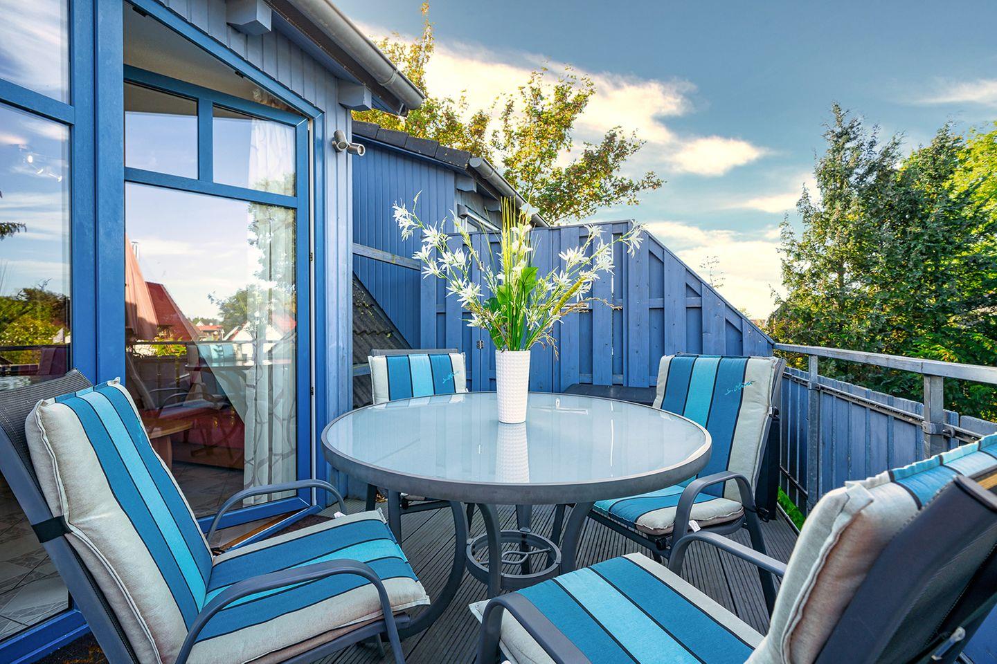Ferienwohnung im Ortskern von Prerow, geeignet für 4 Personen + Kleinkind (bis 3 Jahre) | ca. 54 m² Wohnfläche | OG und DG | Im OG Wohnbereich mit Sofa, Sessel, Radio und Sat-TV, Essbereich für vier Personen, offene Küche (Kühlschrank m. Gefrierfach, Cerankochfeld, Backofen, Geschirrspüler, Kaffeemaschine, Toaster, Wasserkocher, Mikrowelle), ein Schlafzimmer mit Doppelbett (180 x 200 cm), Duschbad mit WC und Waschbecken, im DG 1 Schlafzimmer mit Doppelbett (180 x 200 cm), Fliegenschutzgitter, Fahrradschuppen, ein PKW-Stellplatz, möblierter Nord-West-Balkon, separate Sauna zur gemeinschaftlichen Nutzung im Haus (Wertmarken; 10 € für ca. 3 Stunden), Bettwäsche kann für 12 € und Handtücher für 8 € pro Person gemietet werden, Nichtraucherwohnung, Haustiere sind nicht gestattet, kostenfreier Internetzugang über HOTSPLOTS, gemeinschaftlicher Grillplatz im Garten