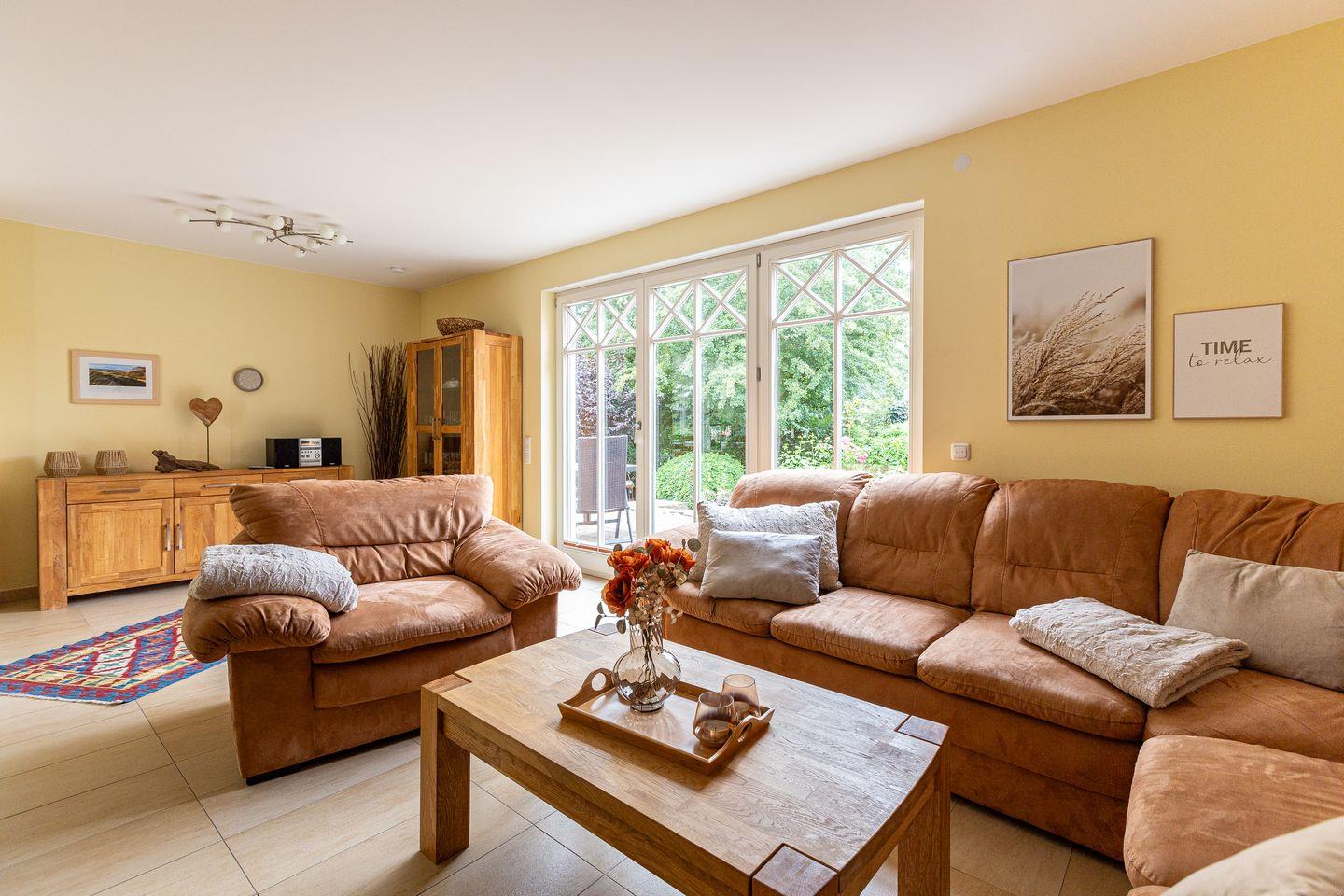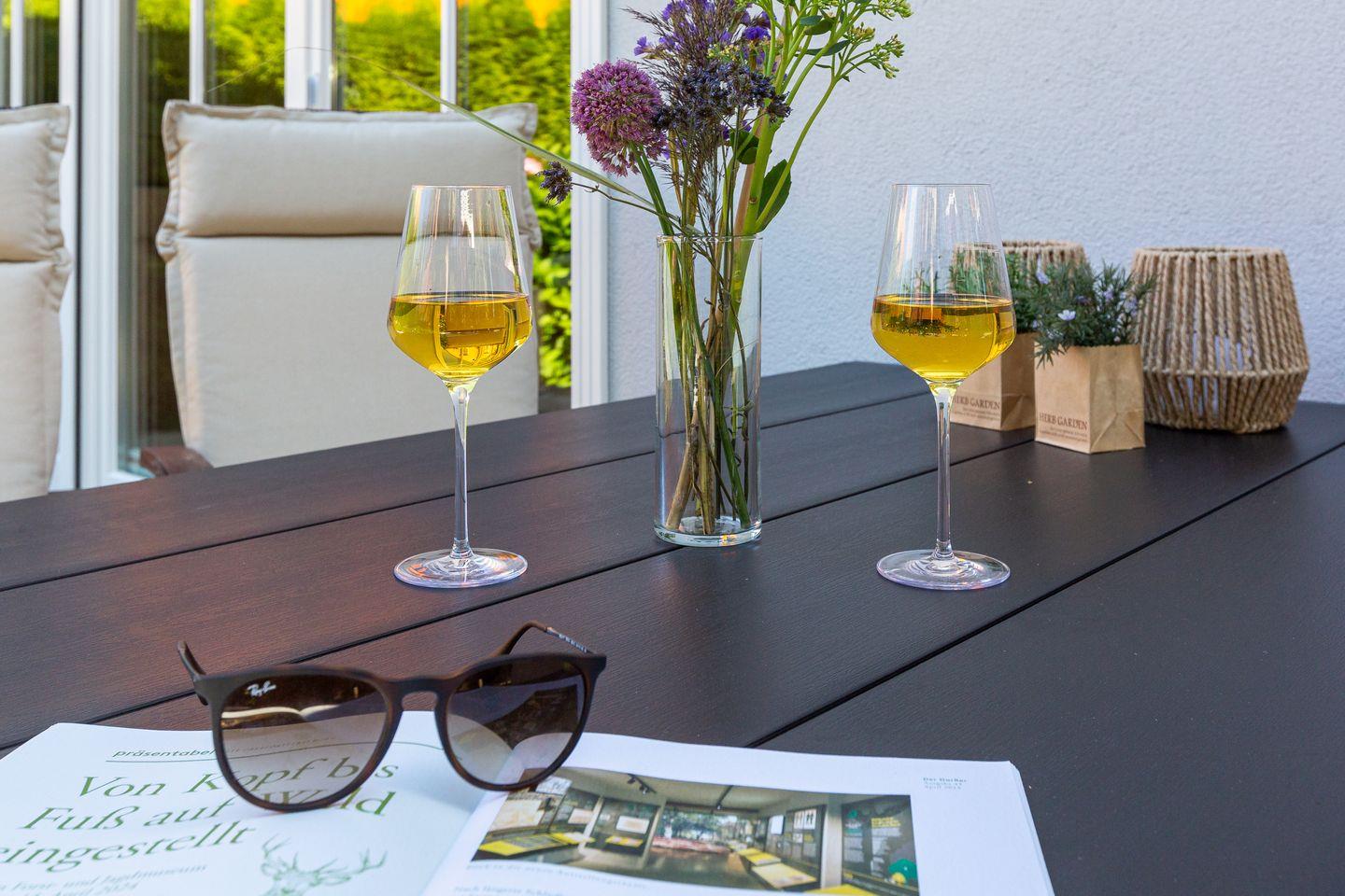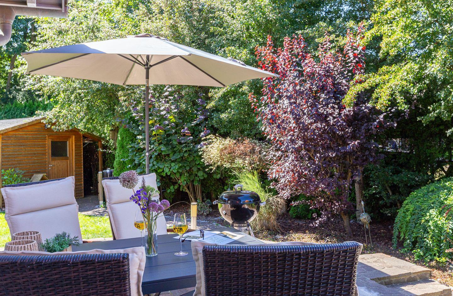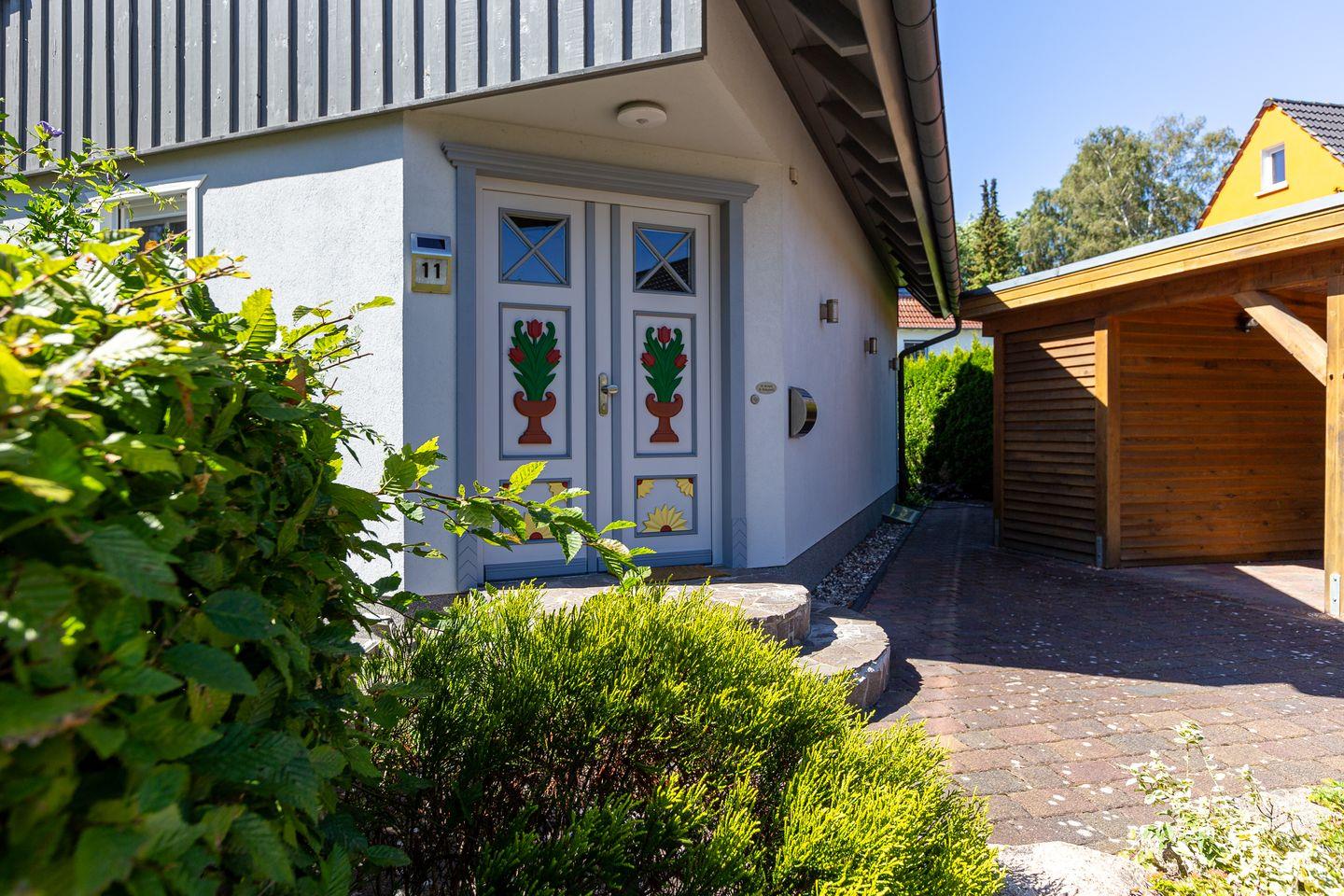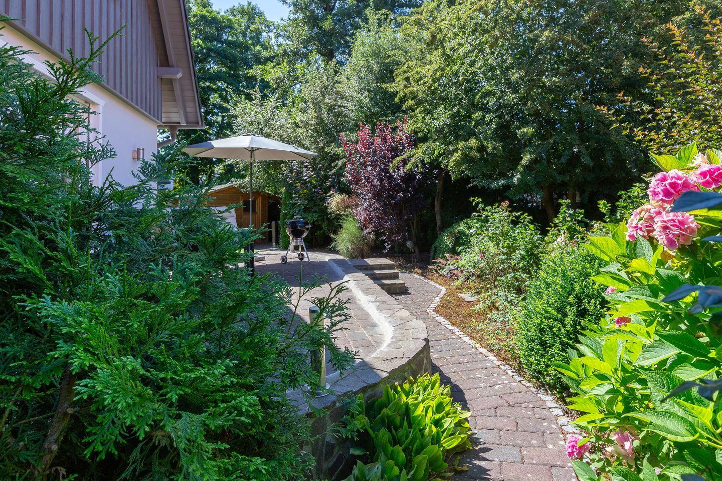 Viel Platz zum Entfalten bietet auch der herrliche Außenbereich mit seiner großen Steinterrasse und dem schön angelegten Garten samt Grillmöglichkeit. Zum Ferienhaus gehören ein Carport und eine zusätzliche Parkmöglichkeit.