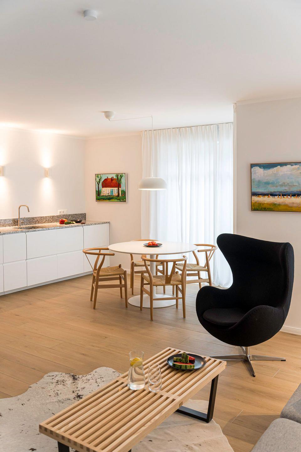 Die Ostseeregion Fischland-Darß-Zingst ist eng verbunden mit Kunst und Künstlern: Die Malerin Ulrike Hansen stellt im Haus Bilder von der Ostsee aus und überträgt auf den Betrachter etwas von der Faszination der wunderbaren Orte nahe am Meer. Das SEEHAUS Prerow, eine großzügige Doppelhaushälfte mit Sauna und Kamin, besticht durch seine puristische Ausstattung, die modernes Design und Gemütlichkeit perfekt kombiniert. Das Haus ist auf einen Urlaub von vier plus zwei Personen ausgerichtet. Der lichtdurchflutete Wohn-/Koch- und Essbereich mit bodentiefen Fenstern zum Garten und zur Terrasse sorgt für eine einladende Atmosphäre. Ein Highlight ist die 100 jährige Eiche auf dem Grundstück. Abende vor dem Kamin mit Musik aus einer hochwertigen Soundbox laden zu entspannten Stunden ein. Die moderne Küche ist perfekt ausgestattet und bietet alles für gemeinsame Kochabende mit Familie oder Freunden. Drei gemütliche Schlafzimmer (2 Doppelbetten; 180 x 200 cm, 2 Einzelbetten; 90 x 200 cm im Spitzboden) bieten ausreichend Platz und Ruhe. Zwei Bäder sorgen mit hochwertiger Ausstattung für Wohlfühlmomente. Nach langen Strandspaziergängen kann man in der Sauna entspannen. Die Terrasse am Haus und ein weiterer Sitzplatz im sonnigen Garten laden zum Verweilen ein. Ein abschließbarer Fahrradraum und zwei PKW-Stellplätze stehen zur Verfügung. Kostenloses WLAN rundet das Angebot ab. Das SEEHAUS Prerow liegt in absolut ruhiger Ortslage und ist ein idealer Ausgangspunkt für Wanderungen und Naturbeobachtungen im Nationalpark Vorpommersche Boddenlandschaft, Ausflüge zur Neuen Seebrücke in Prerow oder entspannte Strandspaziergänge. Eine Vielzahl an Freizeitaktivitäten wie Fahrradtouren, Segeln, Surfen, Kanu- oder Kajakfahren, Ausstellungen,