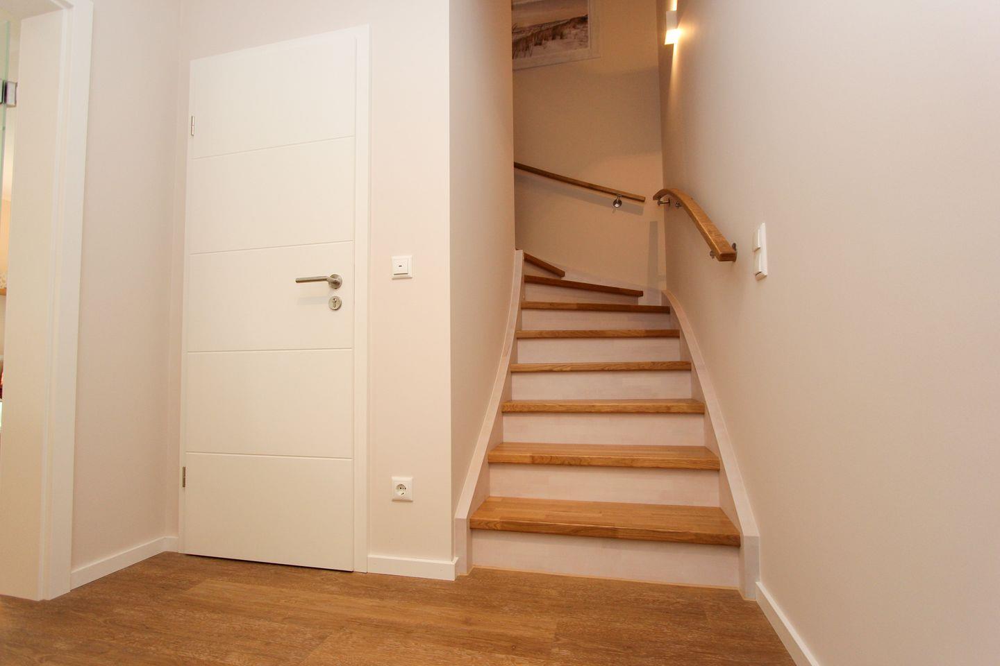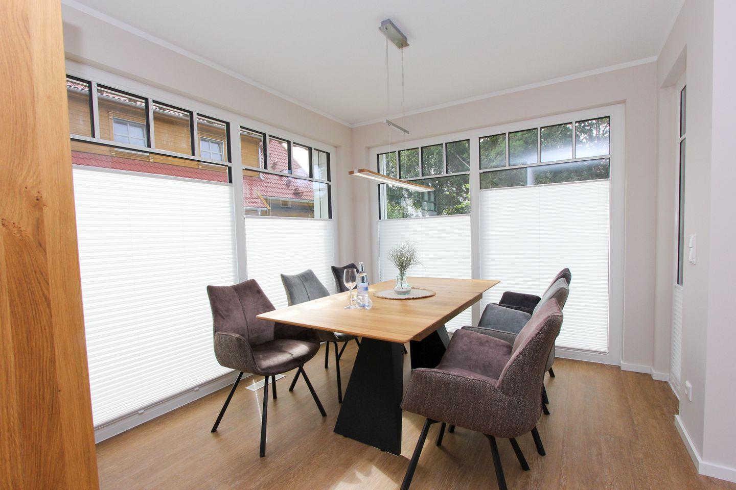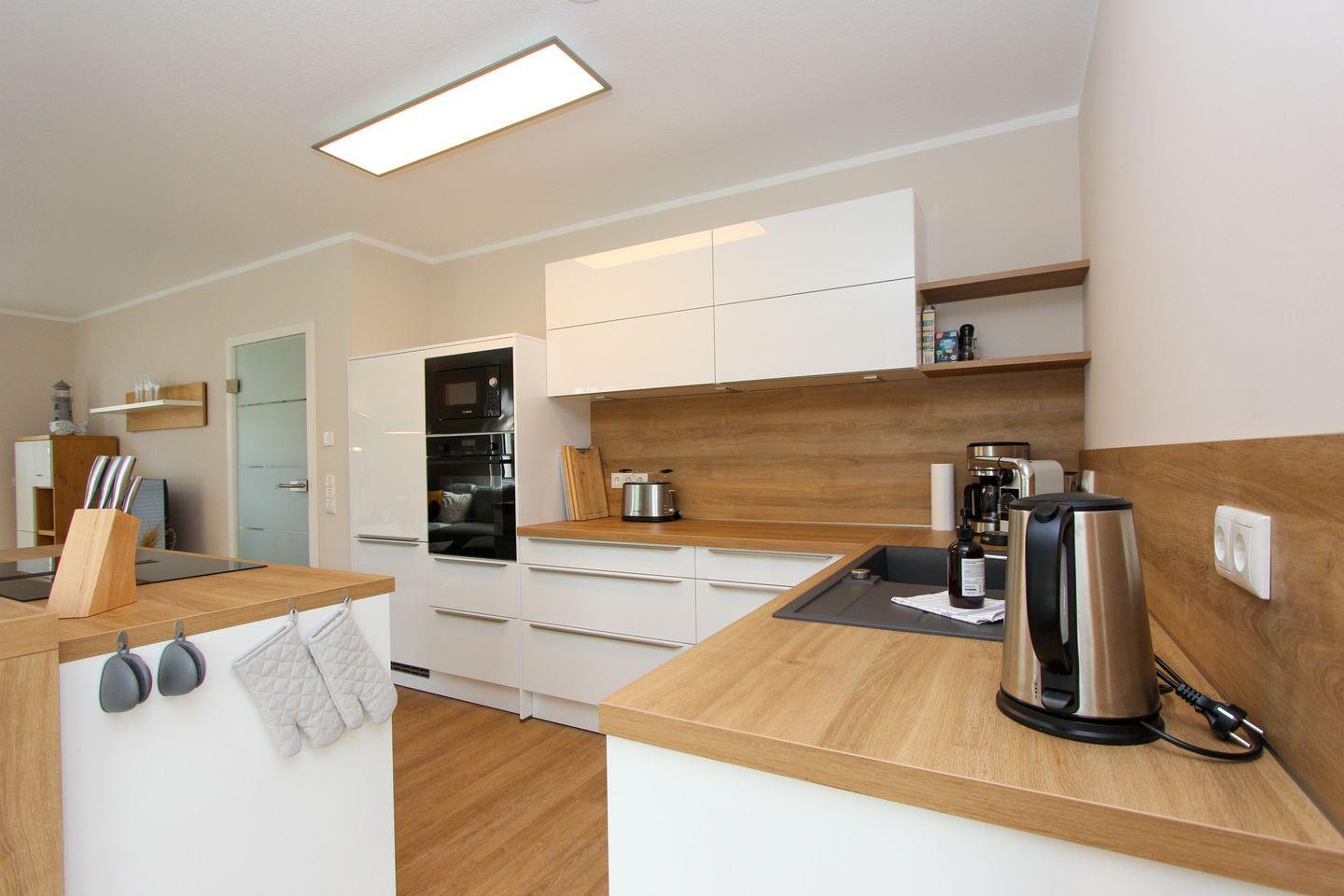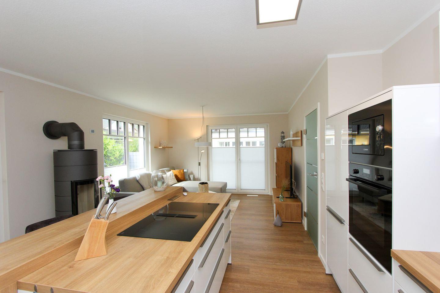 Das elegante Wohnzimmer bietet ein behagliches Ambiente, ergänzt durch einen Kaminofen, der besonders an kühleren Abenden für wohlige Wärme sorgt. Große Fenster lassen viel Tageslicht in die Räume. Die offene Küche grenzt unmittelbar an den Wohnbereich an und ist hervorragend ausgestattet – dazu zählen ein Kaffeemaschine (Filtermaschine und Kapselmaschine von Nespresso) und Wasserkocher, Mikrowelle, Toaster, Spülmaschine und umfangreiche Küchenutensilien. Am großen Esstisch können Sie gemeinsam Ihre Mahlzeiten genießen.