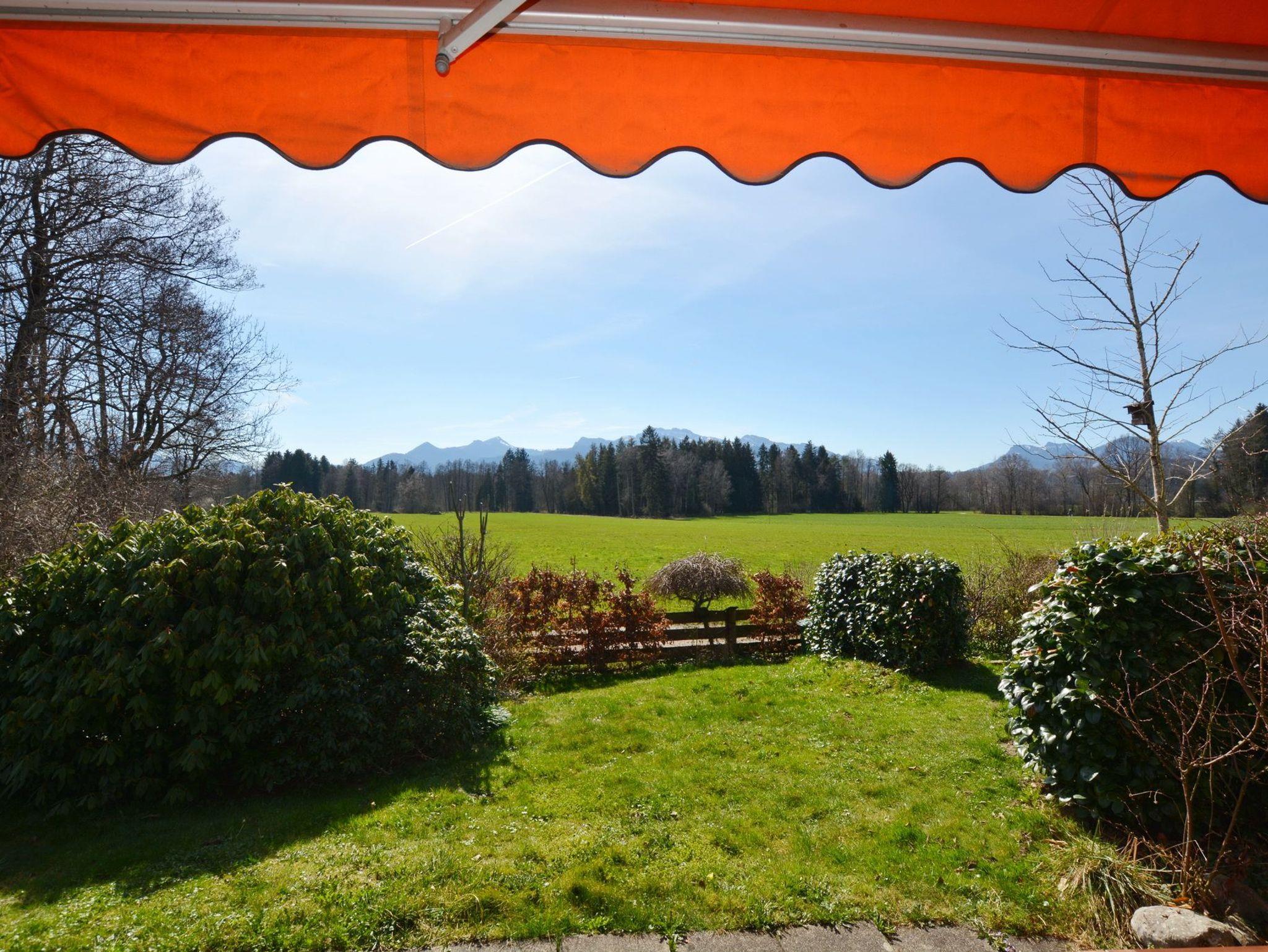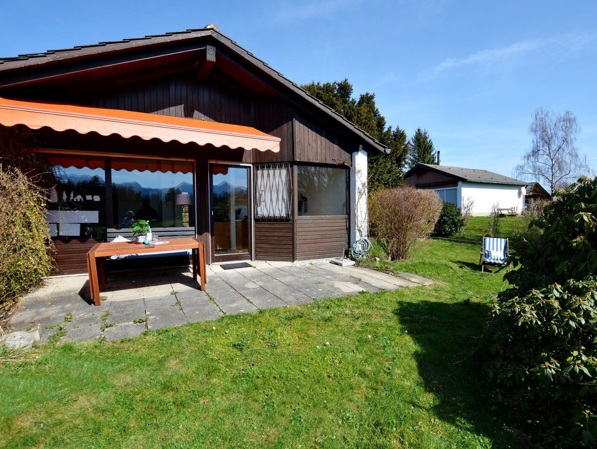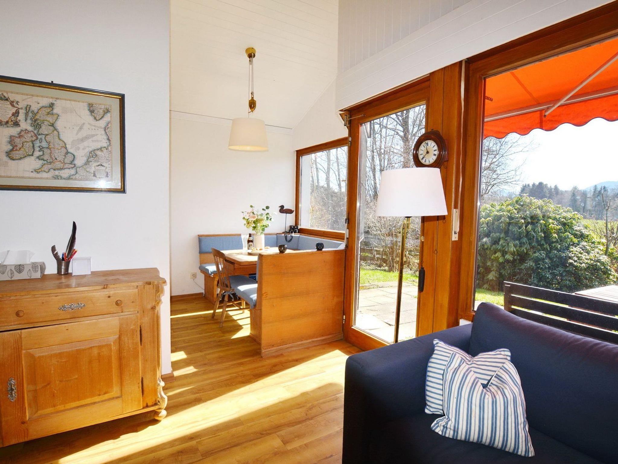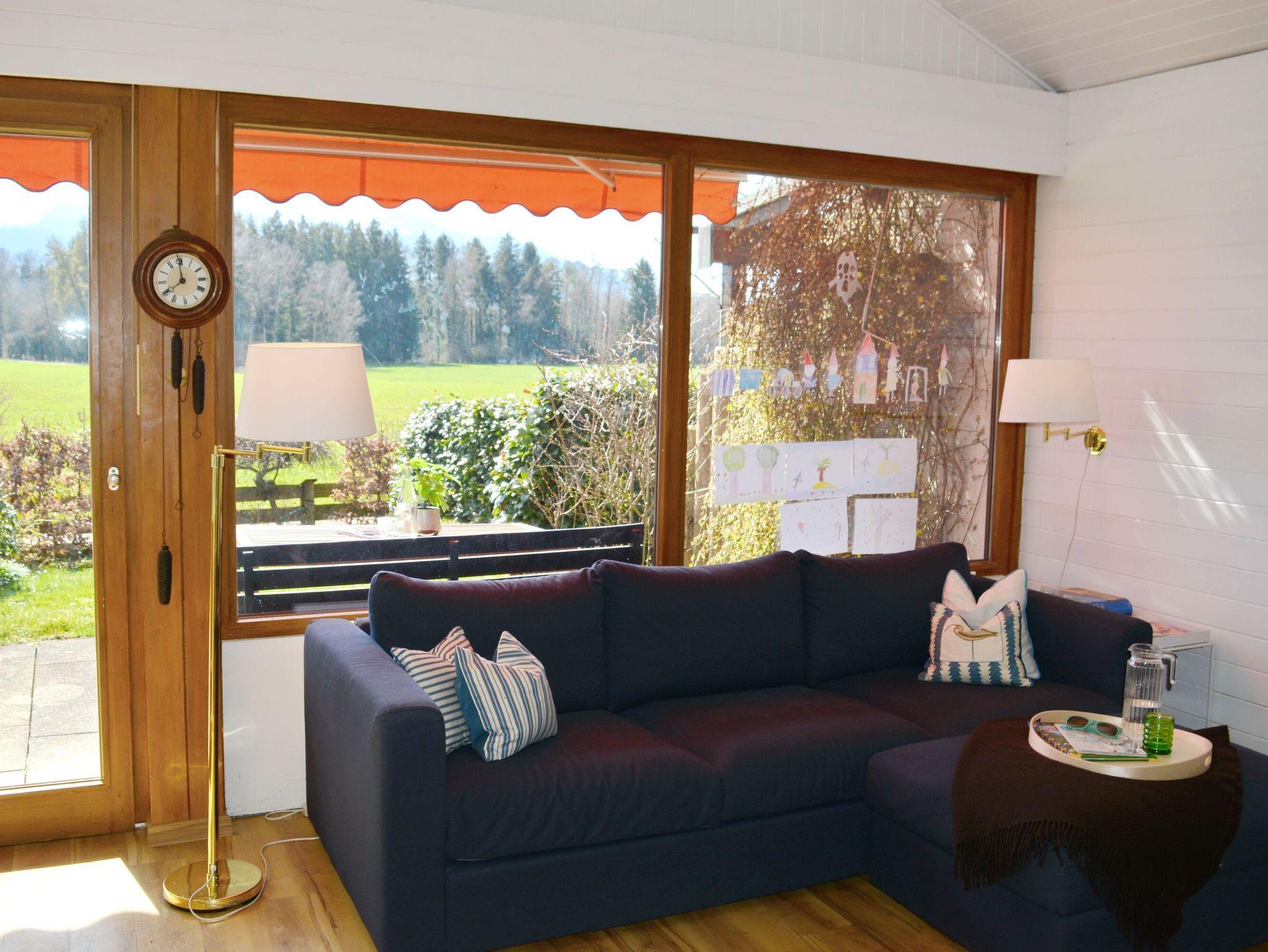 Auf der Terrasse mit Garten und wunderschönem, unverbautem Blick auf die Bergekette - die Chiemgauer Alpen - und in die Natur, werden Sie sicherlich wunderschöne Stunden verbringen. Vielleicht haben Sie das Glück Rehe beobachten zu können und Vögel (wie Bussarde, Falken, Kuckuck uvm.) nicht nur zu hören, sondern auch zu sehen. Von der Terrasse aus gelangen Sie direkt in den Wohnbereich, das Herzstück des kleinen Häuschen. Knisterndes Kaminfeuer, welches vom Sofa aus betrachtet werden kann, was gibt es in der kalten Jahreszeiten Schöneres? Das große Panoramafenster bietet einen fantastischen Blick. Die kleine, offene Küche mit Essbereich ist mit dem Wohnbereich verbunden. Das Badezimmer ist mit Waschbecken, Dusche und Waschmaschine versehen. Ein WC ist separat gegeben. Ergänzt wird das Erdgeschoss durch ein Schlafzimmer mit Doppelbett und einem kleineren Schlafzimmer mit zwei Einzelbetten, welches Kojenartig gehalten worden ist.
