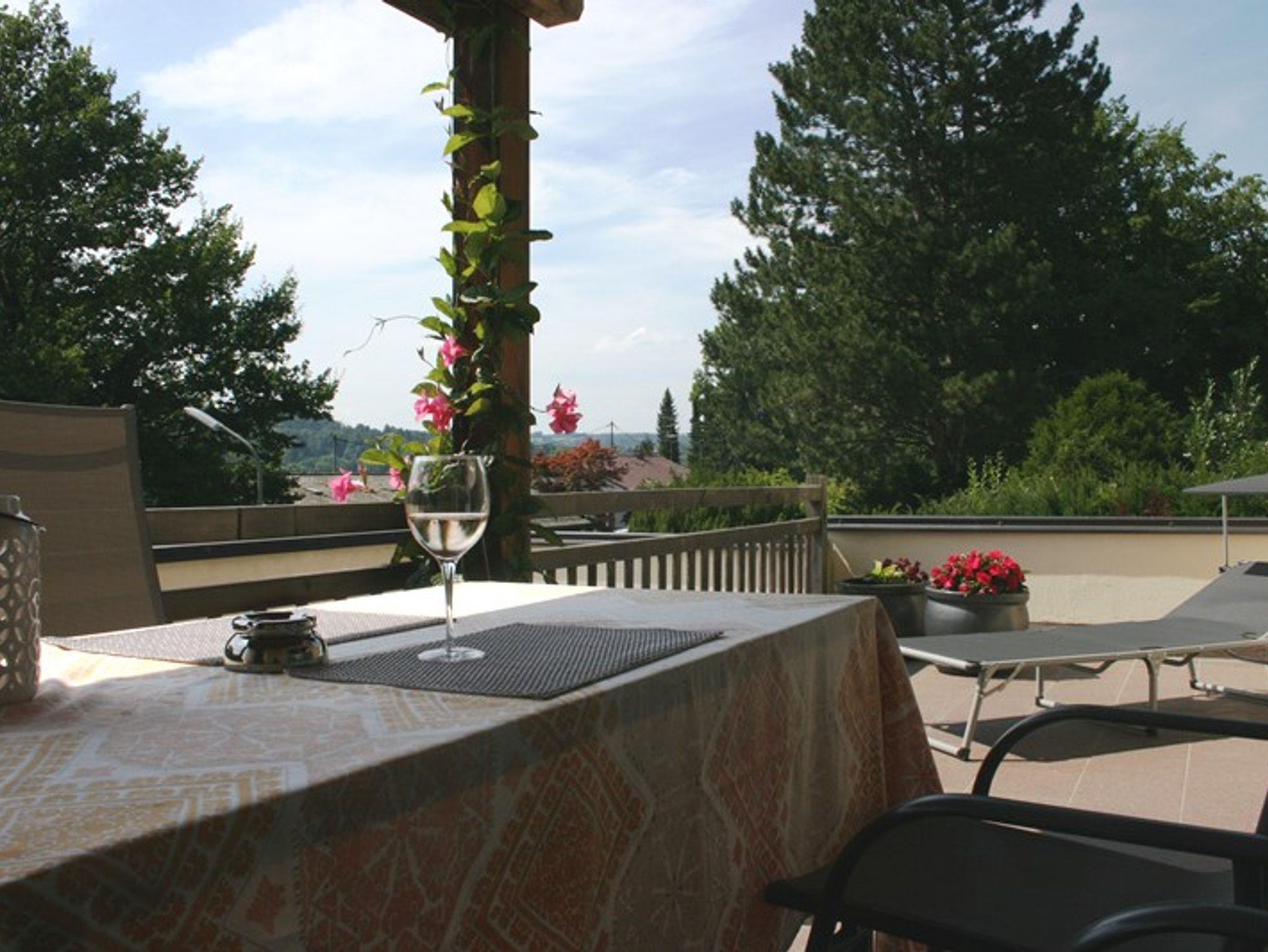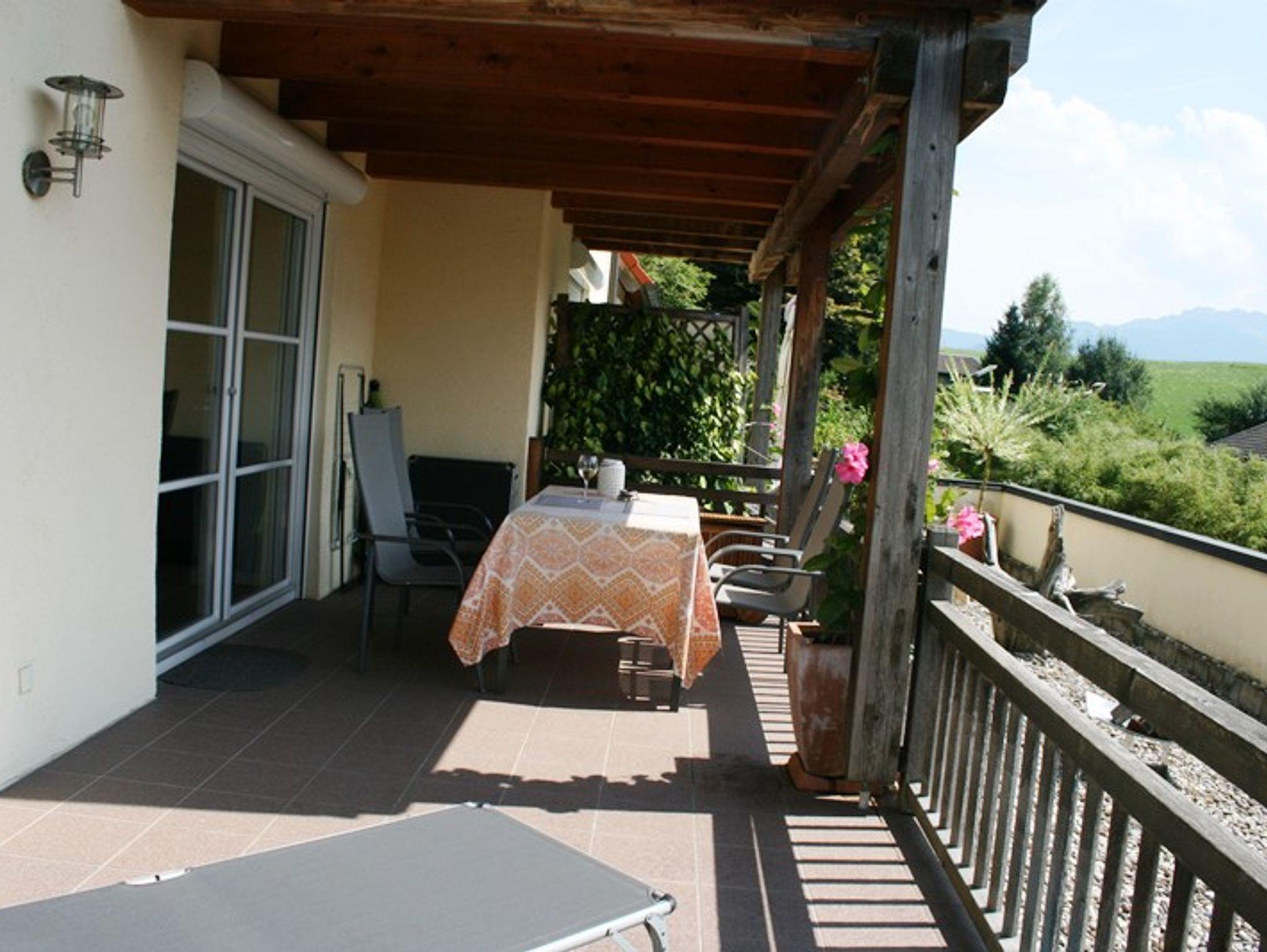 Die Wohnung bietet eine sonnige, halb überdachte Südwest-Terrasse mit Blick auf die Kampenwand, die auch zum Sonnen auf Liegen einlädt.