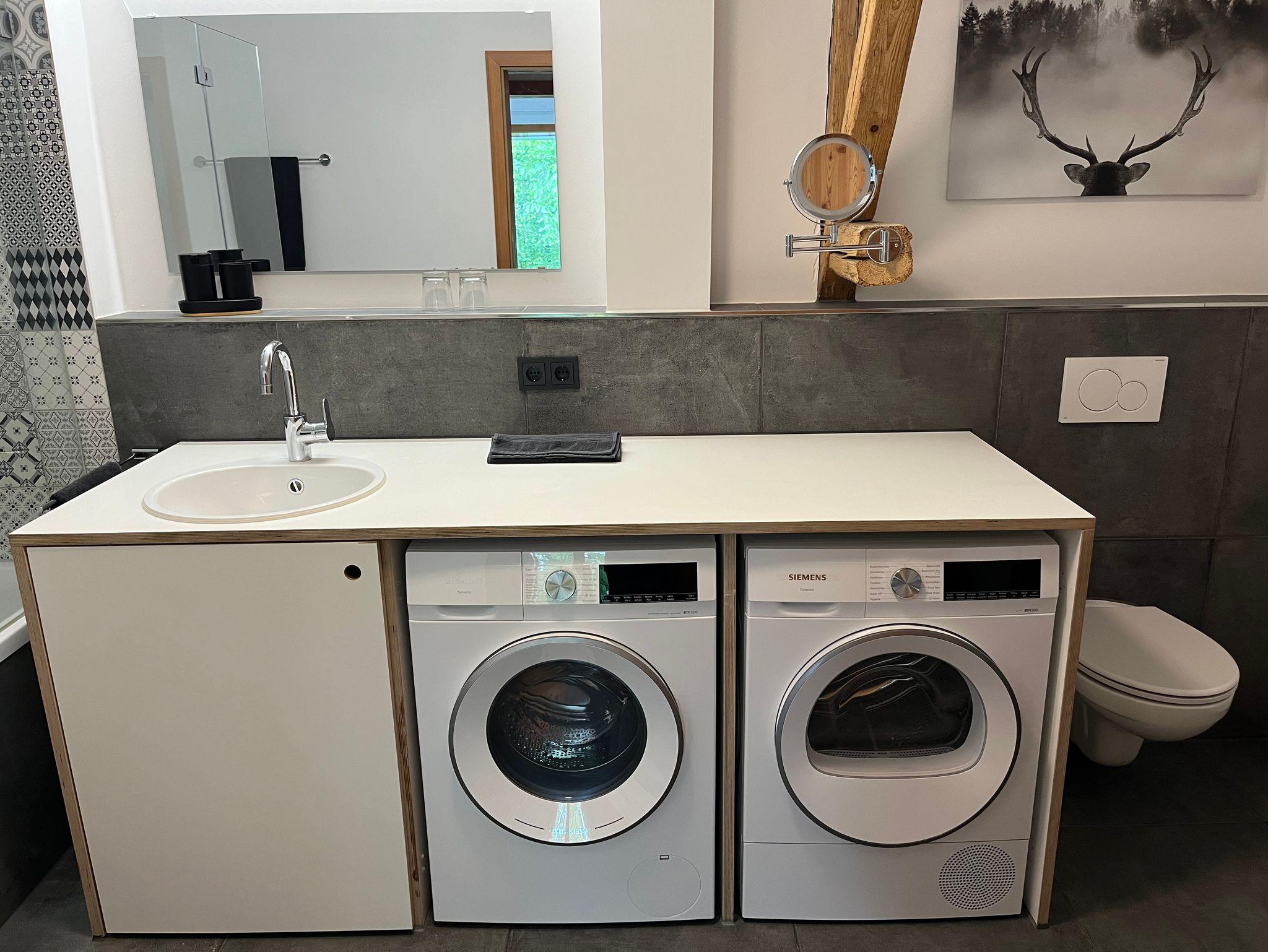 Die Suite verbindet modernen Komfort mit rustikalem Charme und ist mit allem ausgestattet, was Sie für einen erholsamen Aufenthalt benötigen. Von einem geräumigen Wohnbereich mit Kaminofen über eine voll ausgestattete Küche bis hin zu einem komfortablen Schlafzimmer sowie zwei weiteren gemütlich-eleganten Zimmern, von denen eines über eine Galerie zum Schlafen, Lesen und in die Wolkenschauen verfügt. Die Verwendung von nachhaltigen und ökologischen Baumaterialien wie Holz, Naturstein, Lehmputz und warme Ziegeln sorgen für ein angenehmes und gesundes Raumklima. Das in Weiß, Grau und Schwarz gehaltene Badezimmer mit großformatigen Natursteinfliesen am Boden verfügt über eine vollautomatische Waschmaschine und einen Wäschetrockner - alles ist darauf ausgelegt, Ihren Aufenthalt angenehm und entspannt zu machen.
