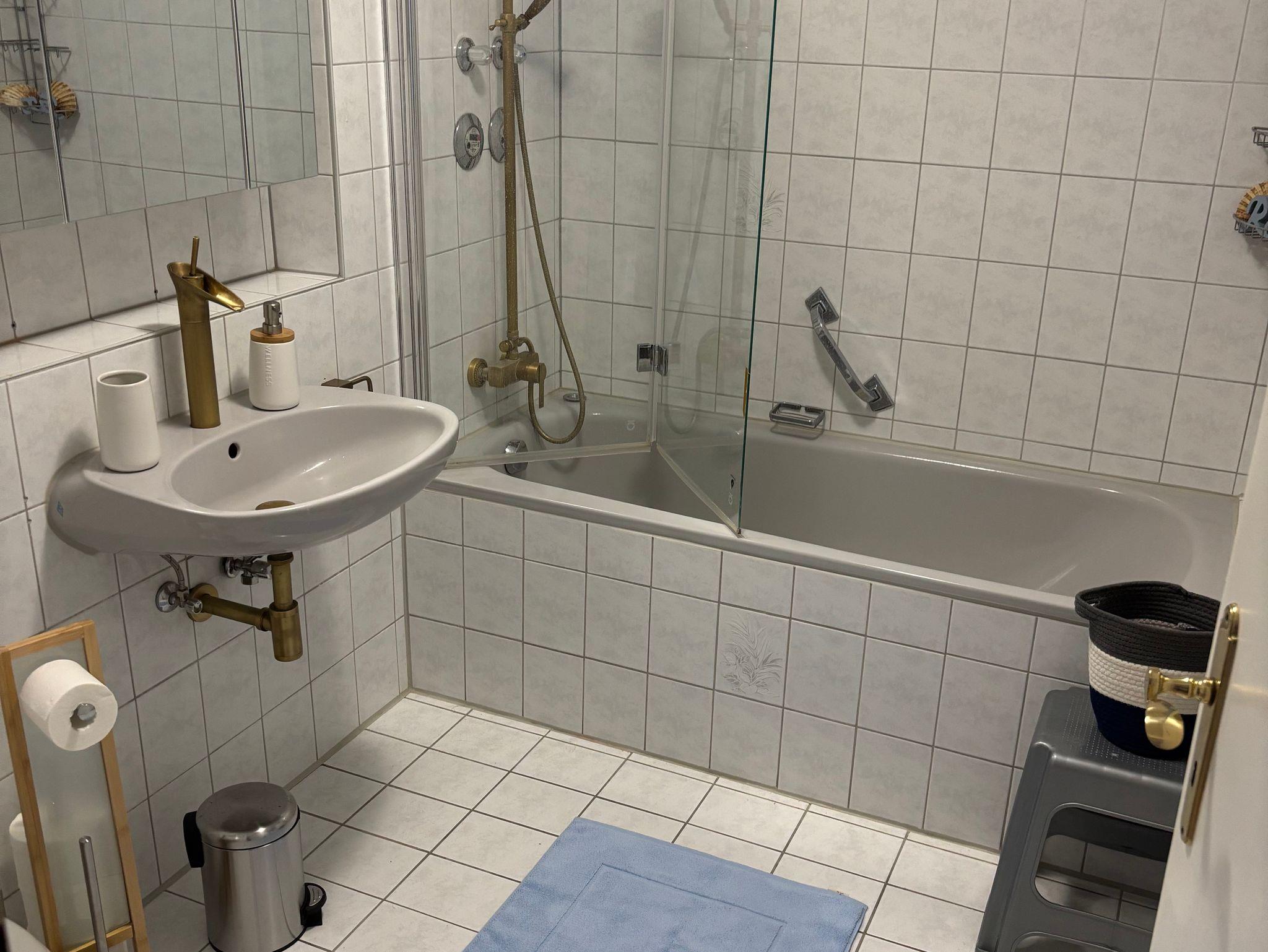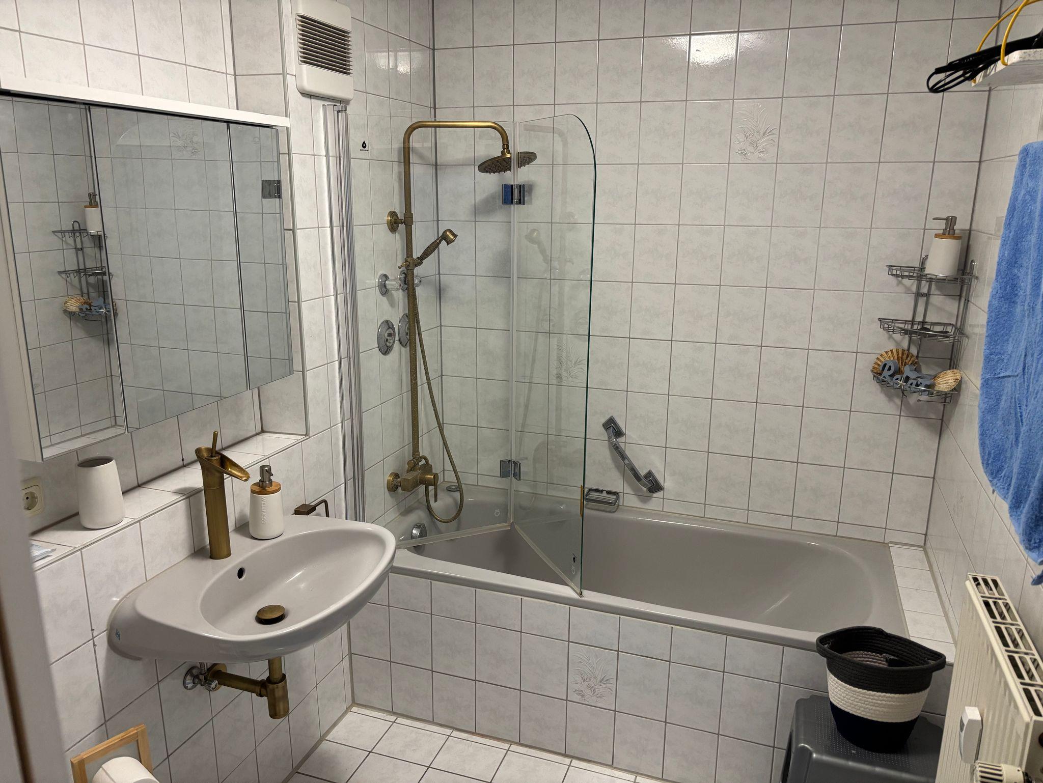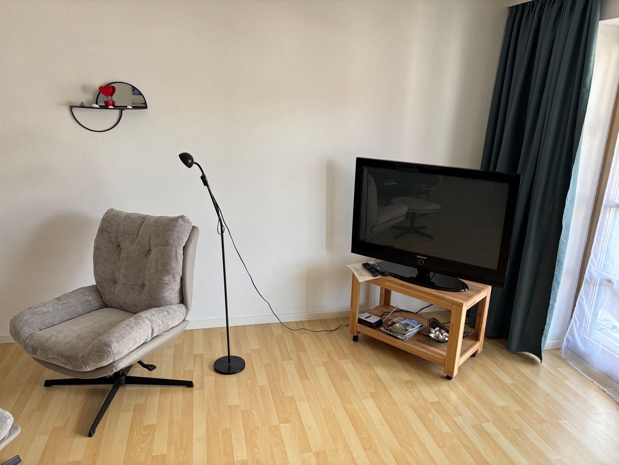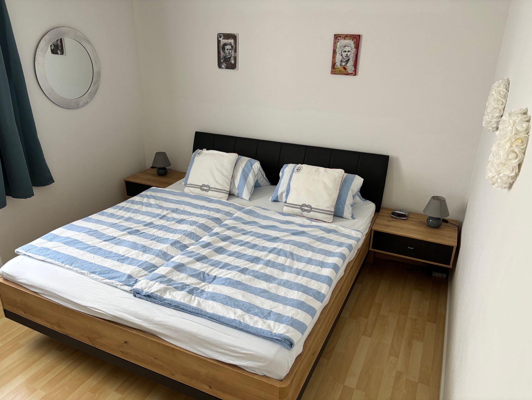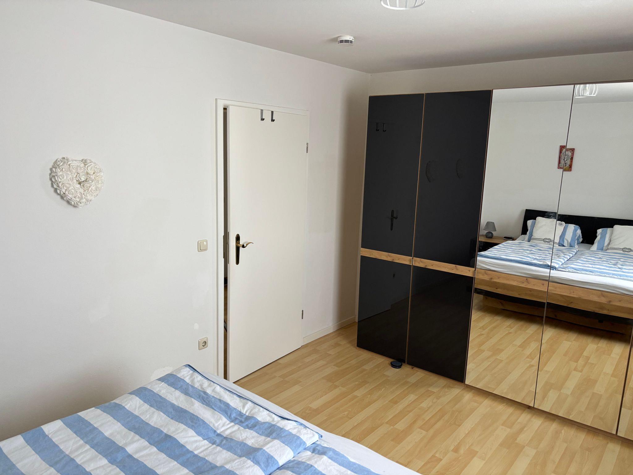 Diese schöne Ferienwohnung mit Balkon, Gartenblick und Gartennutzung hat 1 Schlafzimmer mit einem Doppelbett (180x200), 1 großes Wohnzimmer mit einer hochwertigen Schlafcouch, einen großen Flachbild-Plasma TV, sowie eine integrierte, sehr gut ausgestattete Küche mit Saftpresse und Mixer, einem Kühl-, Gefrierschrank, Cerankochfeld, Backofen, Mikrowelle und einem Geschirrspüler sowie 1 Badezimmer mit einer Dusch-Badewanne mit Regenwald-Dusche.