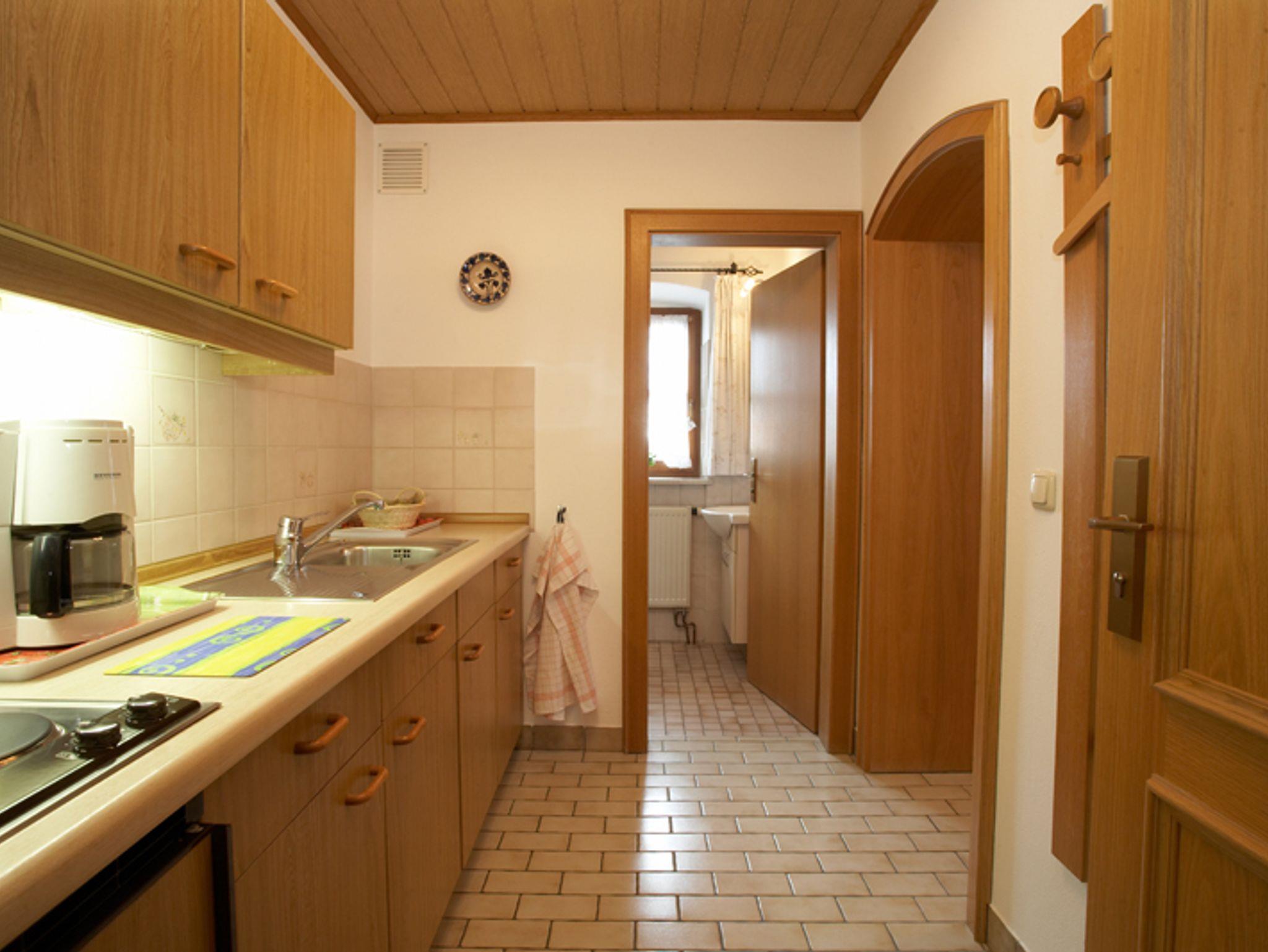 Die Ferienwohnung (1. Stock, 30 qm) besteht aus einem Wohn-Schlafzimmer (Doppelbett, Kleiderschrank, gemütliche Couch, Tisch und Sessel, Radio, Flachbildfernseher), Küche (Tisch mit Stühlen), Bad (Dusche + WC) und Balkon.