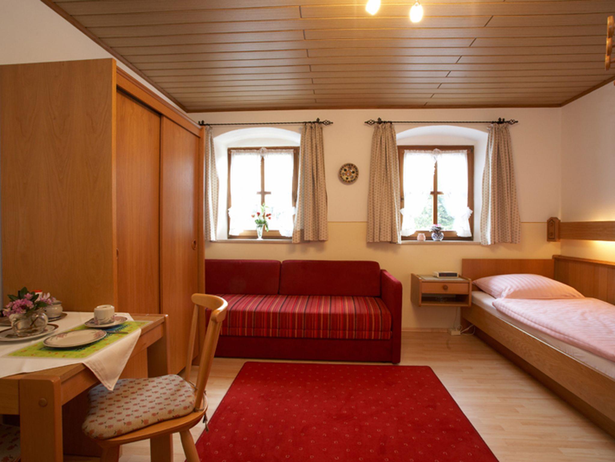 Das Einzelzimmer (1. Stock, 16 qm) besteht aus einem Bett, Kleiderschrank, gemütliche Couch, Tisch mit Stühlen, moderne Küchenzeile mit Kühlschrank, Toaster, Wasserkocher, Kaffeemaschine, Digital-Radio, Flachbildfernseher und Bad (Dusche + WC).