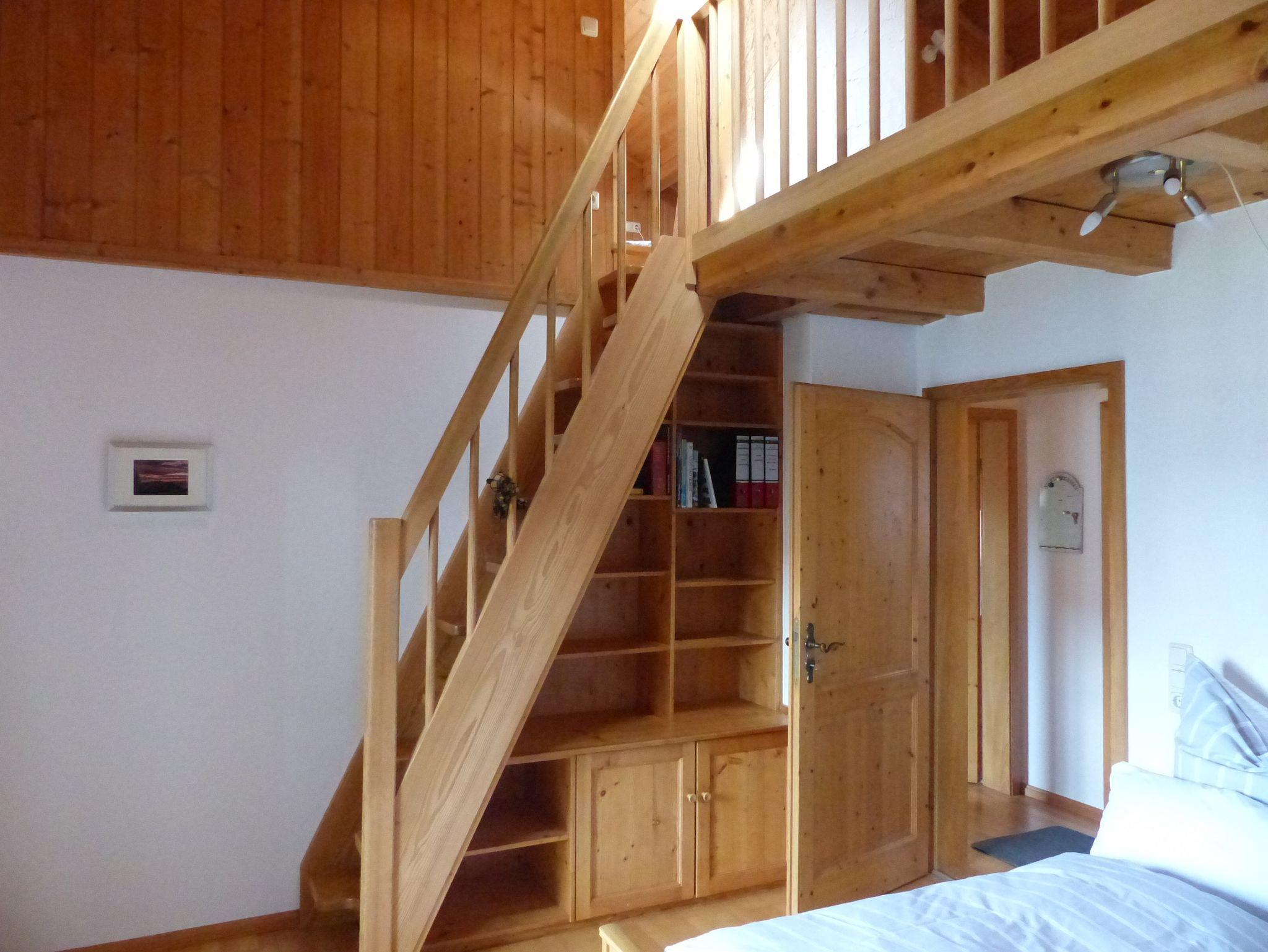 Unsere Wohnung bietet Platz für maximal 5 Personen und bietet eine voll ausgestattete Wohn,- Essküche mit Geschirrspüler und Toaster. Dusche/WC, Sat-TV, Bügeleisen, Bügelbrett, Parkett, Bettwäsche und Handtücher sin ebenfalls vorhanden. Besonderheit unserer Wohnung ist der Zugang zu den obigen Galerieschlafplätzen. Dieser findet über zwei Treppen (Raumspartreppe) statt. Die Zimmer sind nicht durch Türen getrennt.