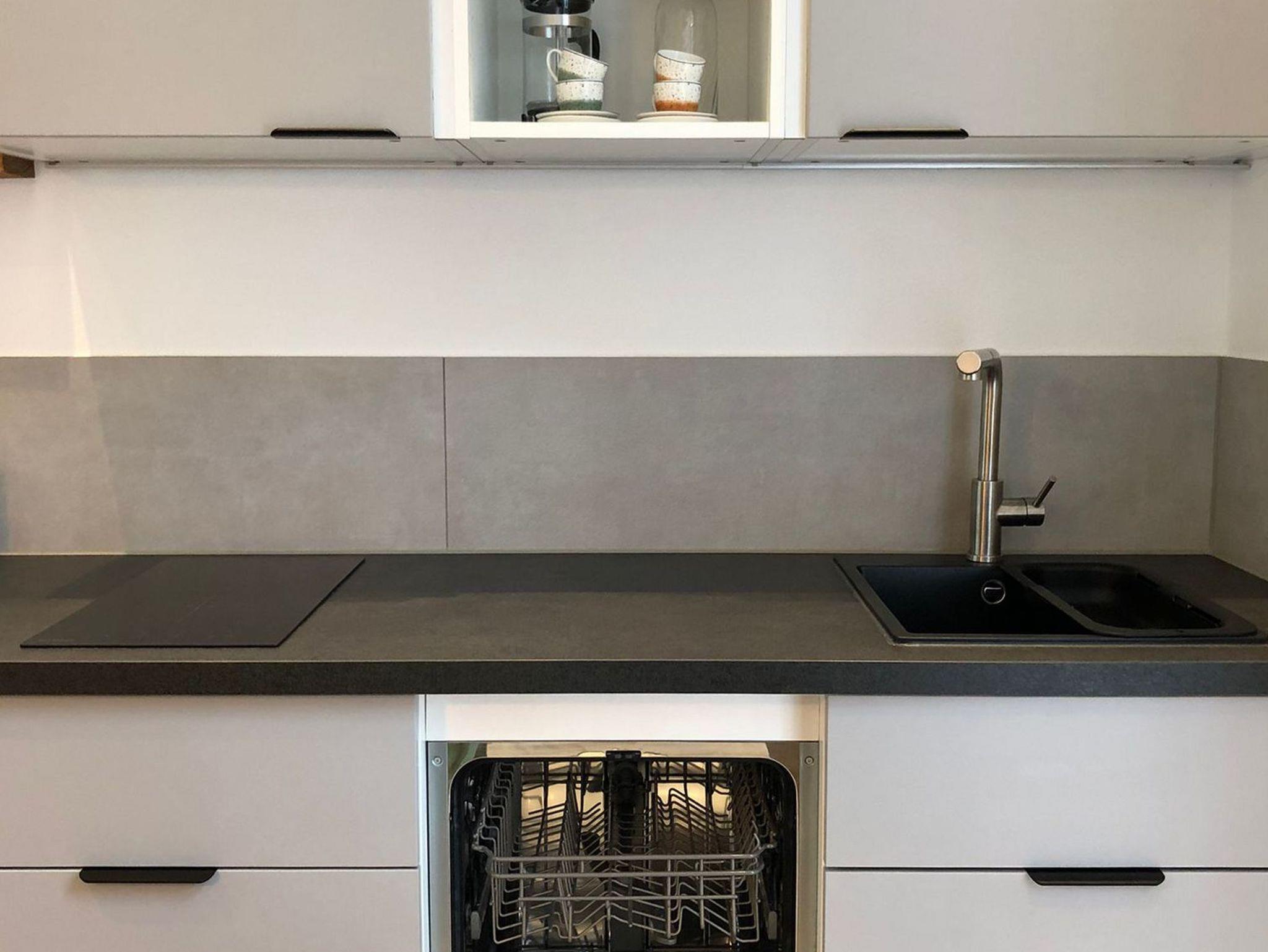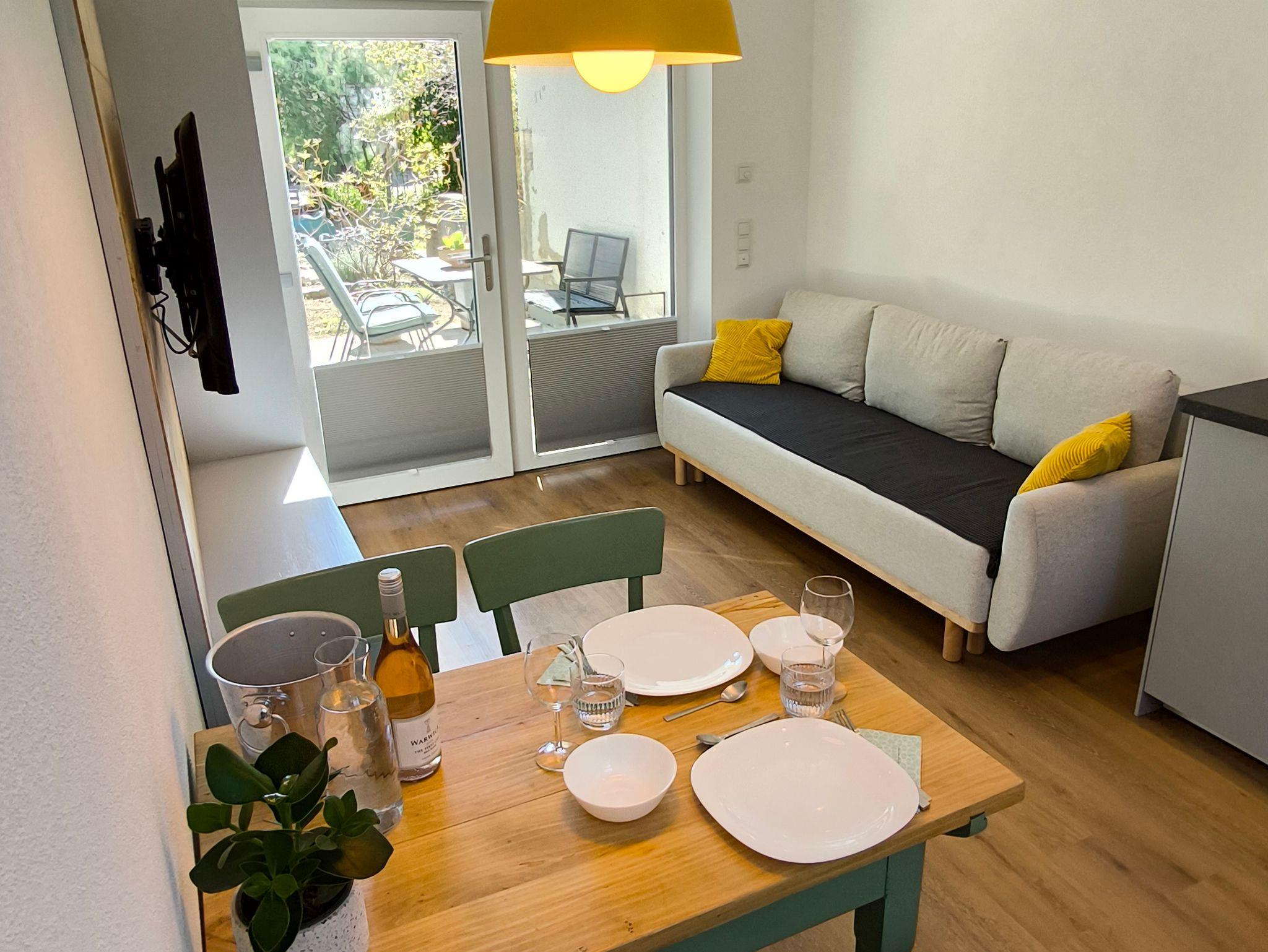 Die Wohnküche vereint Kochen, Essen und Entspannen in einem stilvollen Ambiente. Die moderne, voll ausgestattete Küche bietet alles, was man für den täglichen Bedarf benötigt – inklusive Kapselkaffeemaschine und Induktionskochfeld. Der Esstisch bietet Platz bis zu vier Personen und eignet sich auch ideal als Arbeitsplatz für mobile work. W-LAN steht in der gesamten Ferienwohnung kostenlos zur Verfügung. Ein gemütliches Sofa lädt zum Verweilen ein und lässt sich bei Bedarf in eine komfortable Schlafcouch verwandeln. Zur abendlichen Unterhaltung oder Entspannung kann das All-In-One-Audio System (Radio, Bluetooth, CD, USB) oder der Flachbild-Fernseher dienen.