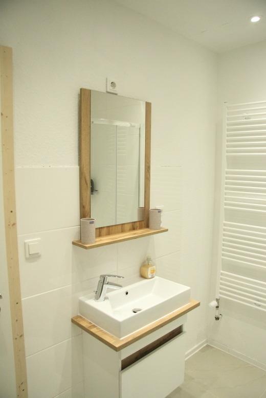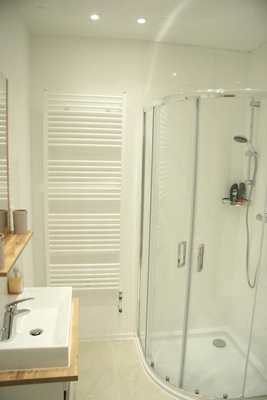 Das Badezimmer ist hell und freundlich gestaltet, hier finden Sie eine Runddusche, Waschtisch, Spiegel sowie ein WC.