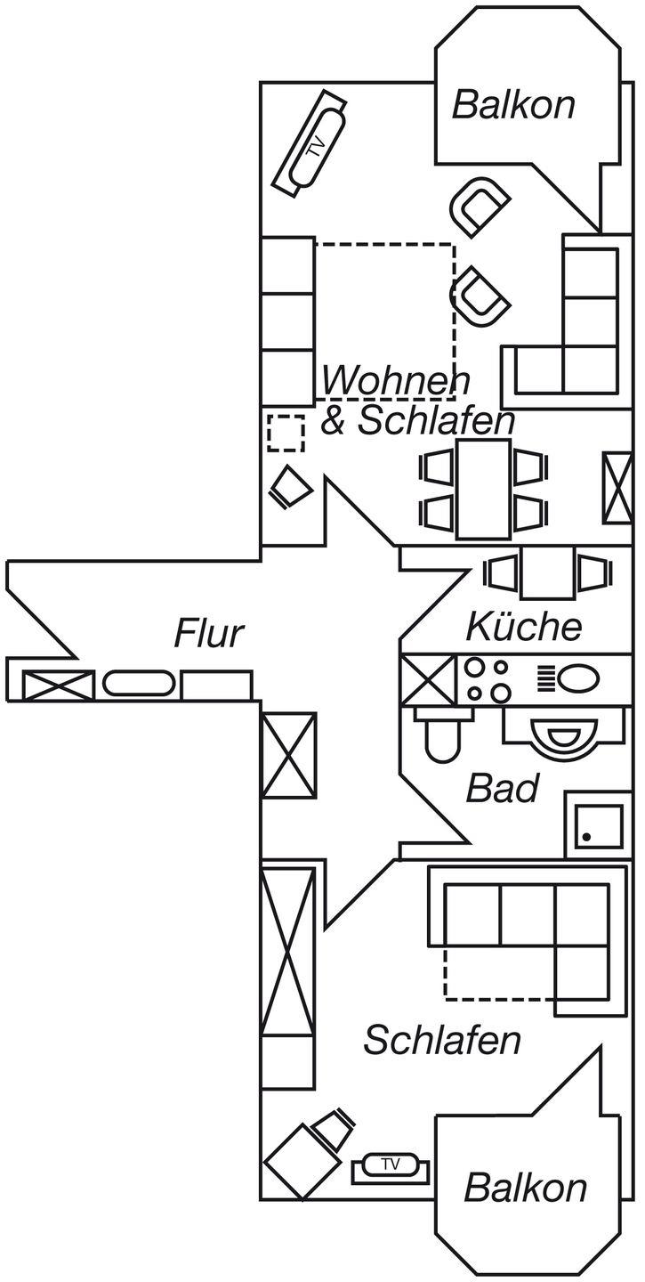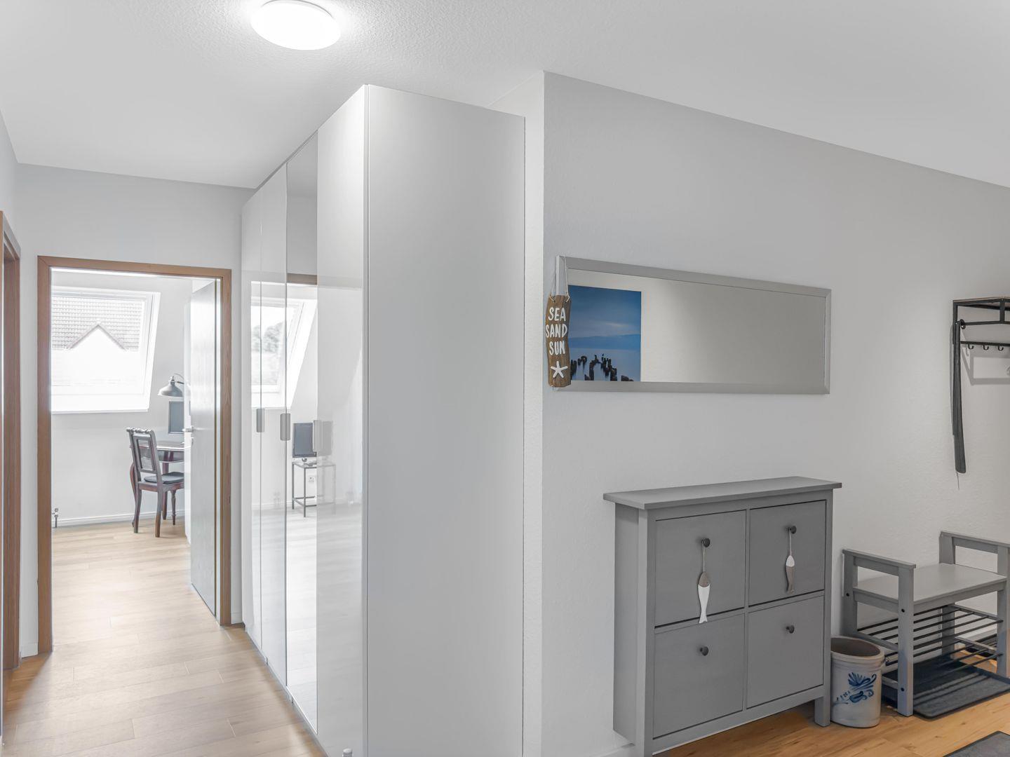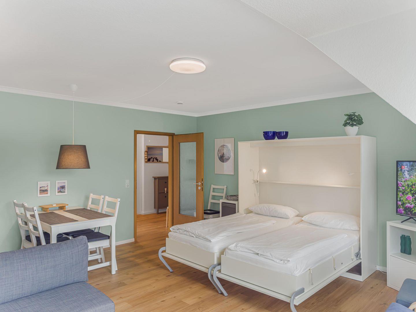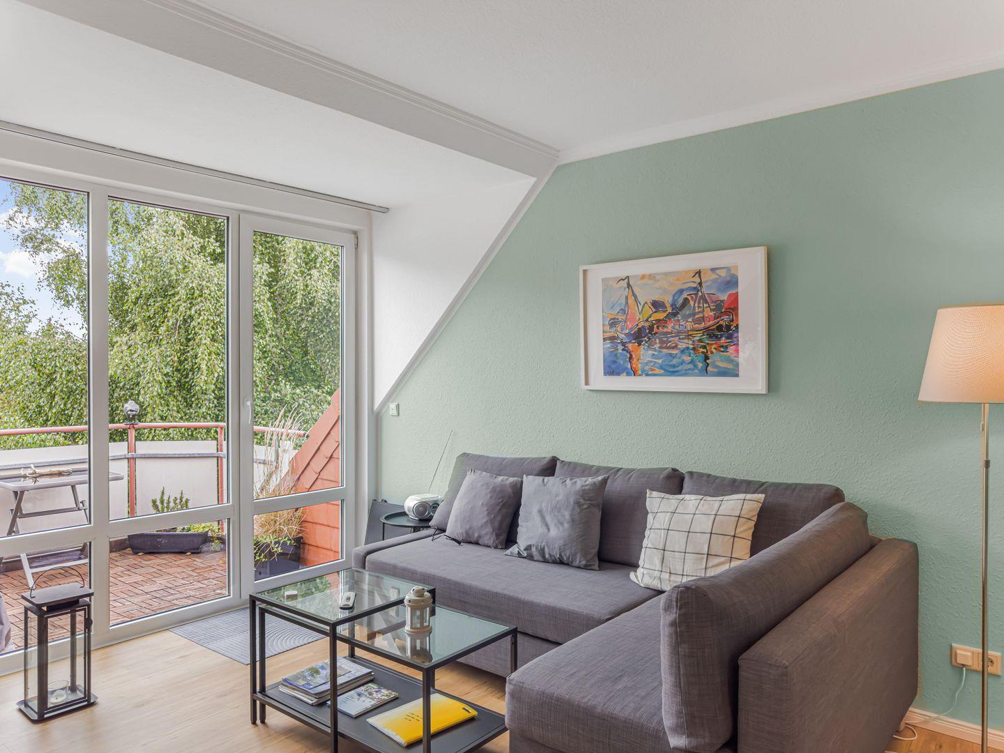 Dieses großzügige 2-Zimmer-Apartment im 2. Obergeschoss (mit Fahrstuhl) bietet auf etwa 70 m² eine komfortable Ausstattung für einen entspannten Aufenthalt. Der Wohnbereich mit Schrankbett (1,80m breit - 2 Matratzen a 90cm), TV und Musikanlage lädt zum Verweilen ein. Die gut ausgestattete Einbauküche mit 4-Platten-Ceranfeld, Backofen und Geschirrspüler bietet alles für die Selbstverpflegung. Ein separater Essplatz und ein weiteres Zimmer mit hochwertiger Schlafcouch (1,40?m breit, mit Lattenrost) sorgen für zusätzlichen Komfort. Zwei möblierte Balkone (West- und Ostseite) bieten viel Platz zum Entspannen. WLAN, Außenjalousien und ein PKW-Stellplatz runden das Angebot ab. Die ruhige Lage ist ideal, um den Naturstrand sowie Einkaufsmöglichkeiten, Restaurants und die Fähre in wenigen Gehminuten zu erreichen.