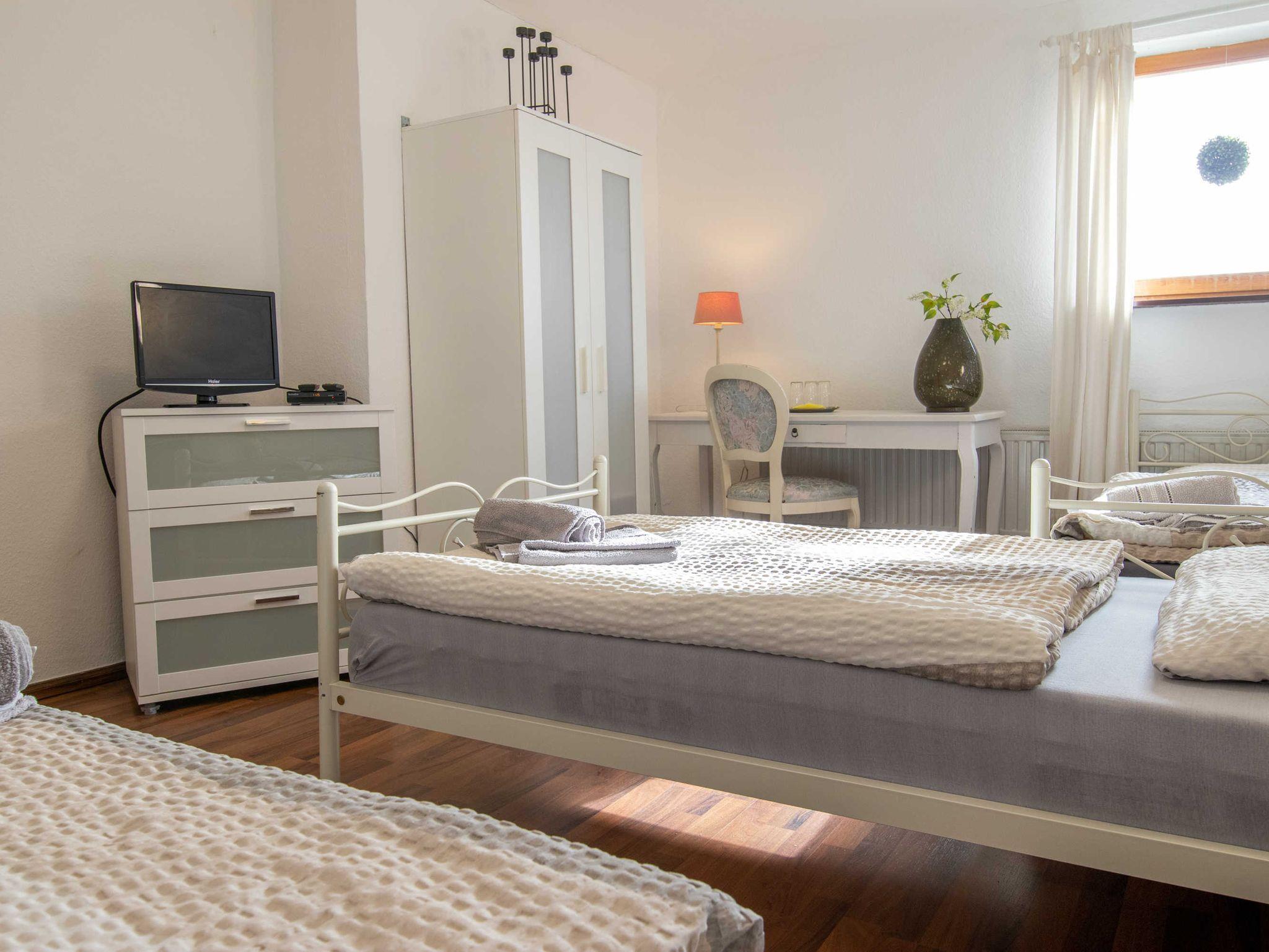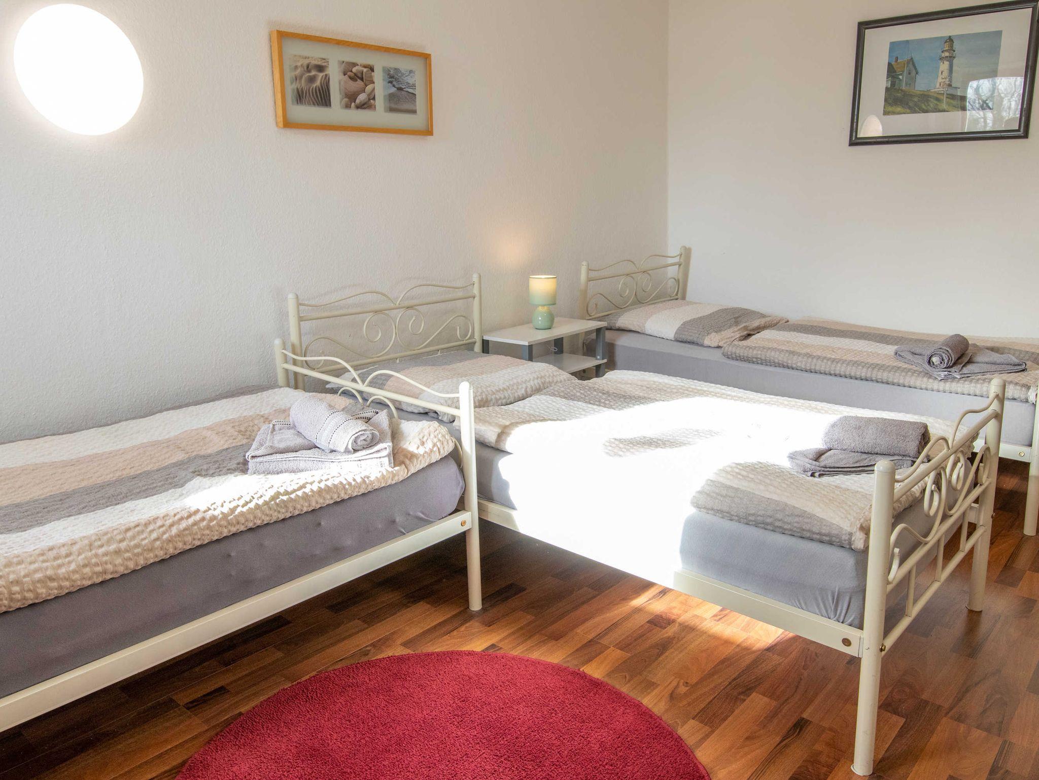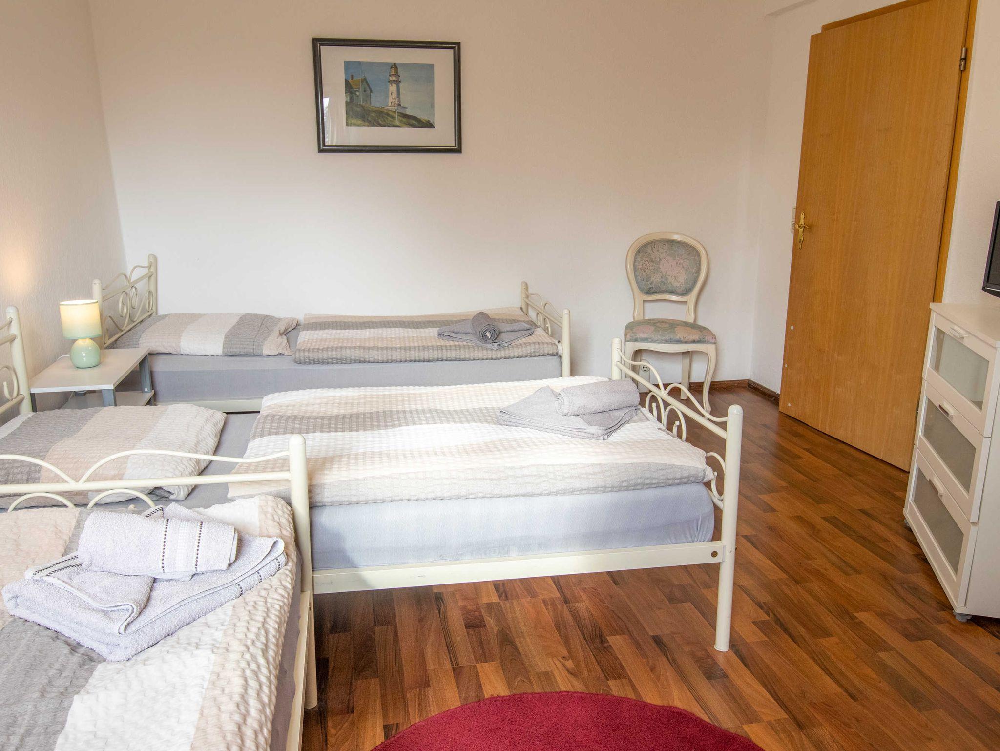 Das Dreibettzimmer verfügt über 3 Einzelbetten (90x200), einen Flachbild-TV, einen Schreibtisch, Kleiderschrank, ein Bad mit Fenster, Dusche und WC sowie einen kleinen Vorflur.