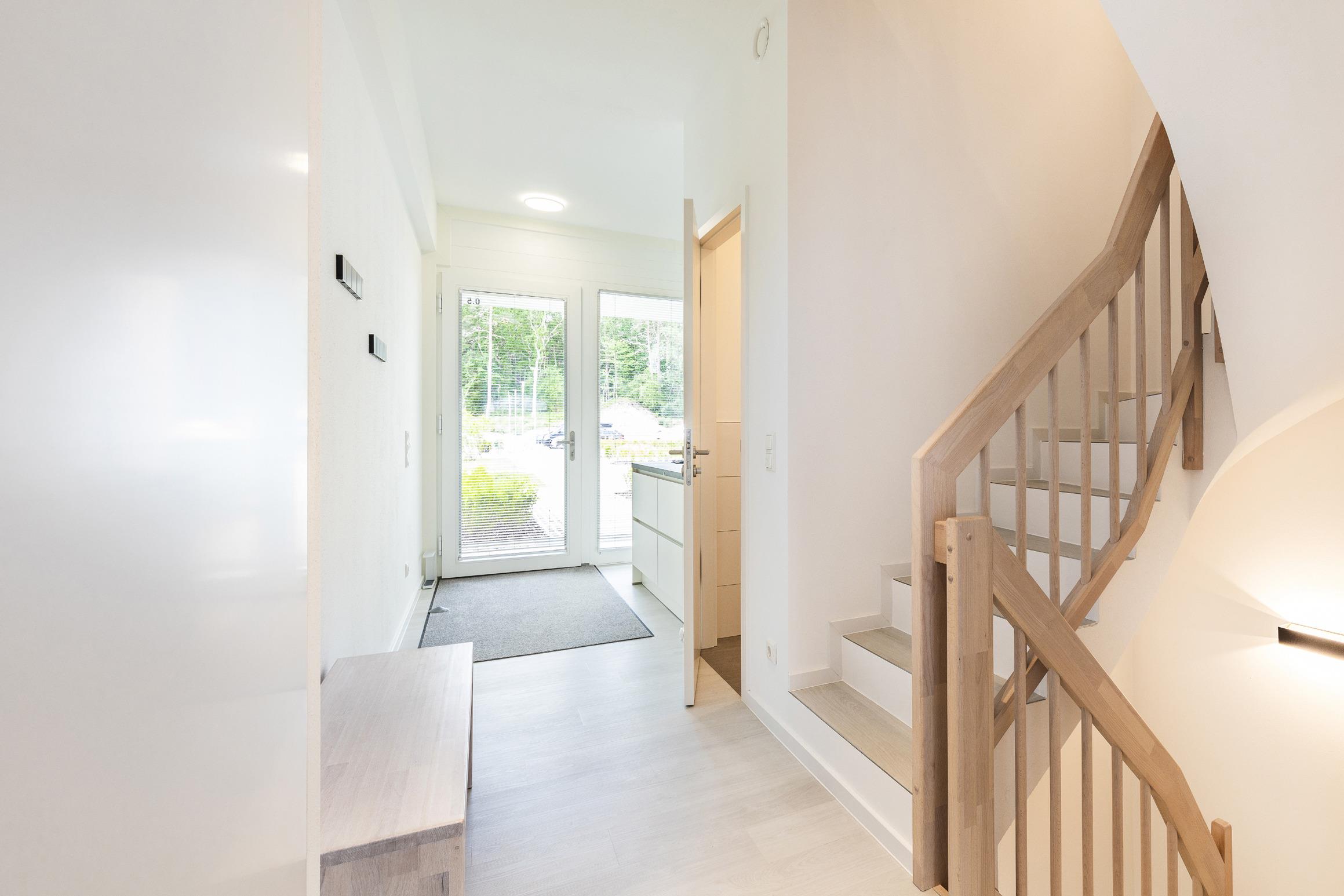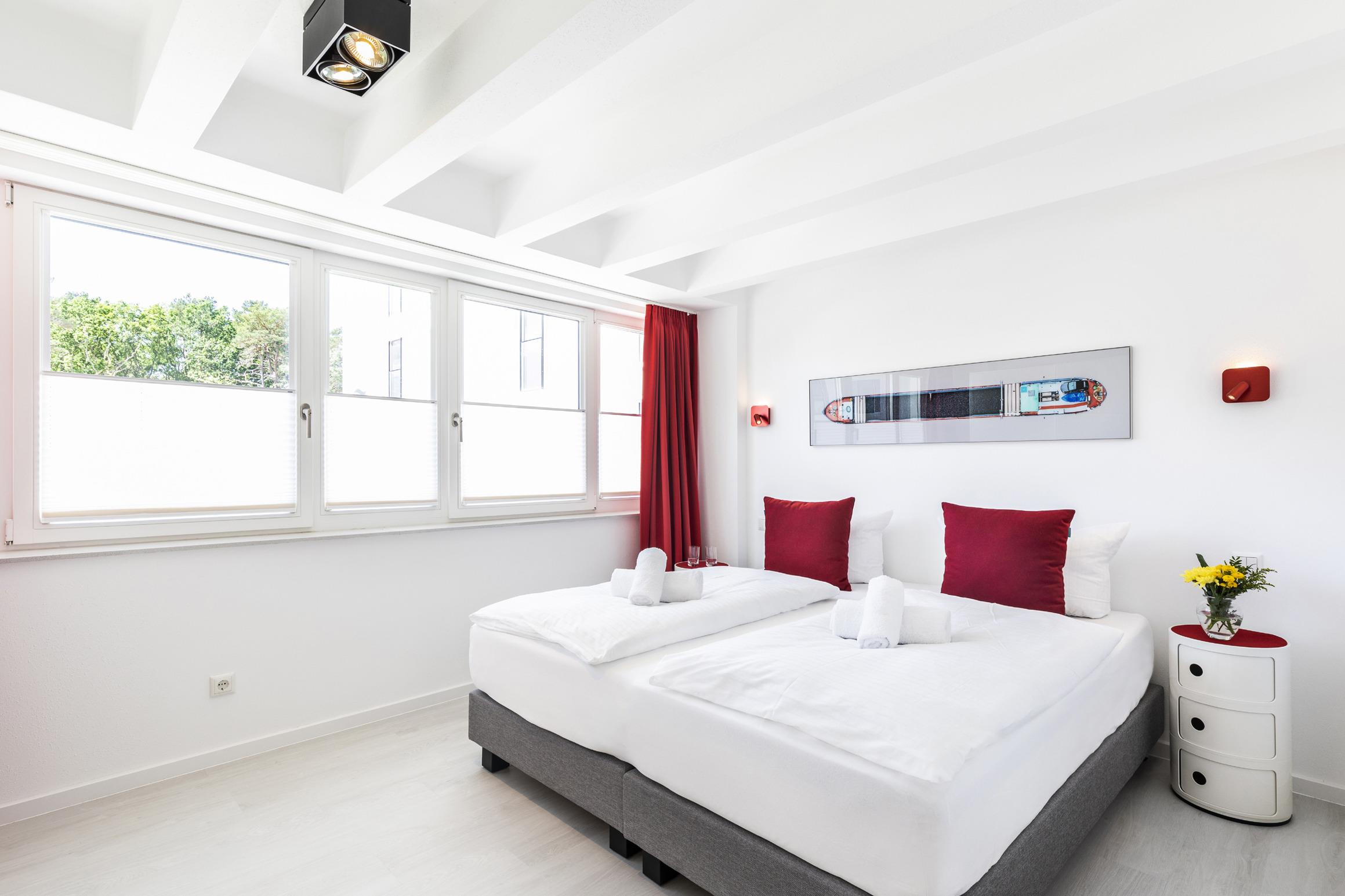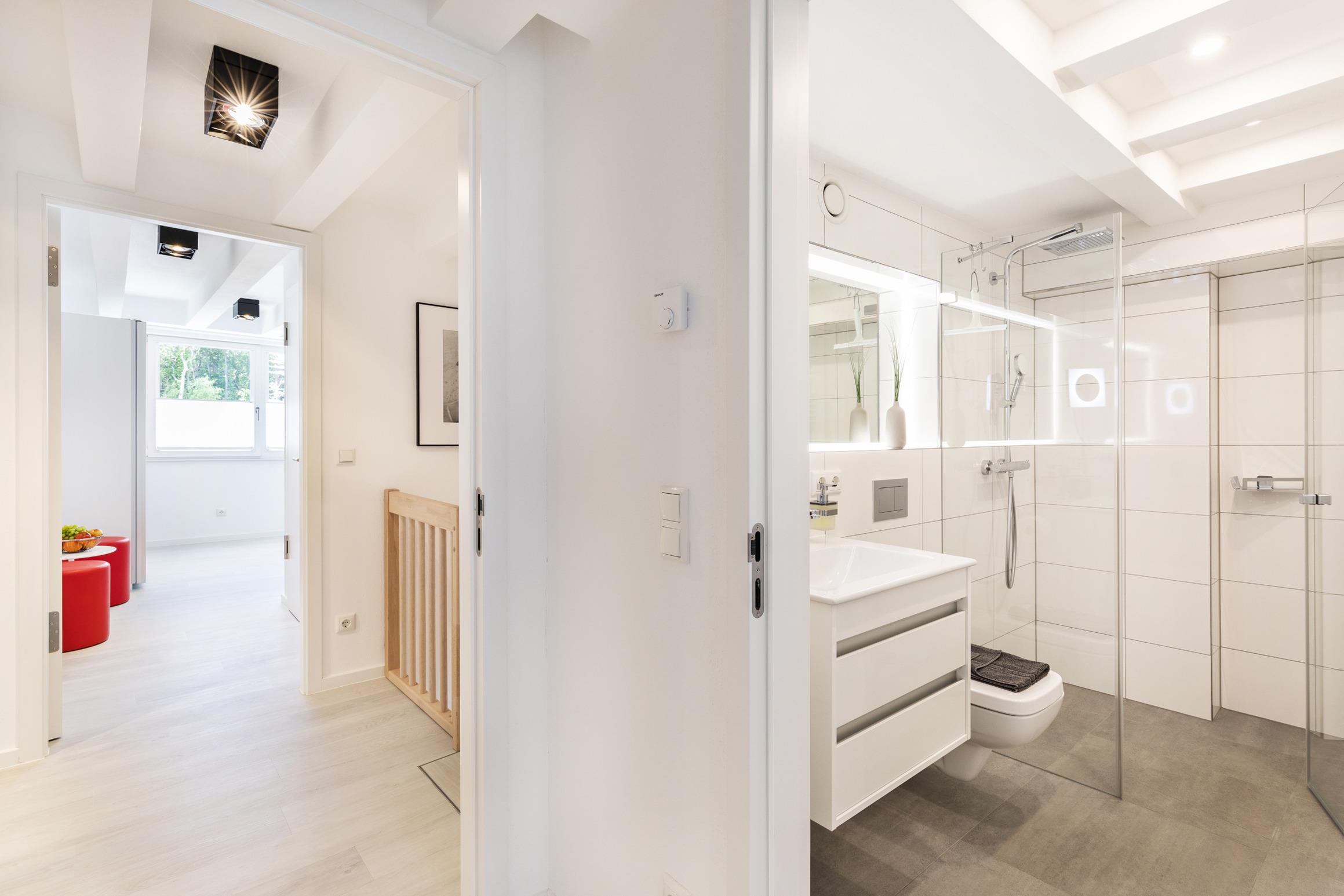Im Obergeschoss gibt es zwei Schlafzimmer. Das erste Schlafzimmer befindet sich auf der Seeseite und verfügt über ein Boxspring-Doppelbett (180x200), einen großen Smart-TV, Zugang zum Balkon mit Ostseeblick, einen großen beleuchteten Kleiderschrank, einen Klappsekretär mit Klappstuhl und ein En-Suite-Bad. Der Balkon bietet eine schöne Sitzmöglichkeit mit Blick auf das Meer. Das angrenzende Badezimmer verfügt über eine Regendusche, WC, einen Waschtisch mit Schubladen, einen beleuchteten Kosmetikspiegel und einen Föhn. Das zweite Schlafzimmer befindet sich auf der Landseite und verfügt über zwei einzelne Boxspringbetten (2x 90x200, welche sich aber bei Bedarf zu einem Doppelbett zusammenschieben lassen), einen Smart-TV, einen Kleiderschrank, zwei Sitzhocker mit Beistelltisch, wärmereflektierende beschichtete Plissees und ein En-Suite-Bad mit Regendusche, WC, Waschtisch mit Schubladen, beleuchtetem Kosmetikspiegel und Föhn.