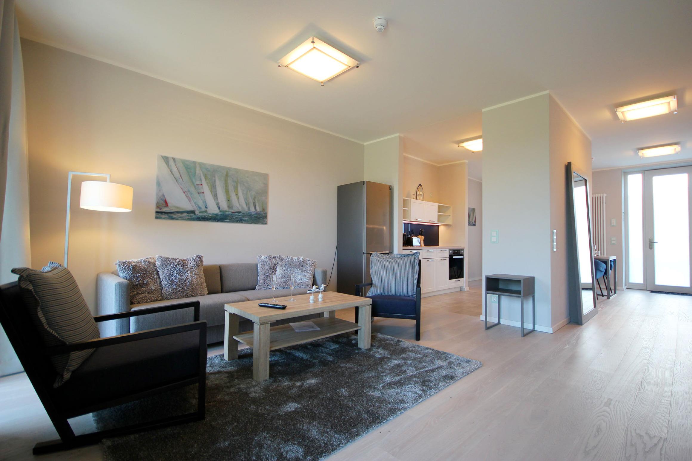 Ihre sonnige 3-Raum-Wohnung 104RB24A mit seitlicher Meerblickterrasse verfügt über 108 qm2 Wohnfläche im Erdgeschoss. Die hochmodern eingerichtete Wohnung ist mit bis zu 5 Personen belegbar. Ihre Nichtraucherwohnung verfügt über einen vorgelagerten Flur mit Garderobe. Angrenzend ist der schöne Essbereich und auch die moderne Wohnküche zu finden. Der stilvoll eingerichtete Wohnbereich ist mit einer Sitzgruppe inkl. Schlafcouch für 2 Personen, großem Flachbild-TV und WLAN ausgestattet. Im Küchenbereich erwartet Sie ein Backofen, Cerankochfeld, Geschirrspüler, Kühlschrank mit Tiefkühlfach, eine Kaffeemaschine, Wasserkocher, Toaster sowie umfangreiches Kücheninventar. Zudem ist eine zusätzliche Kühl- und Gefrierkombination vorhanden. Das Badezimmer mit ebenerdiger Dusche bietet genügend Abstellflächen für Kosmetika, einen Fön, Kosmetikspiegel und einen Handtuchheiztrockner. Das Hauptschlafzimmer verfügt über einen weiteren Flachbild-TV, Schreibtisch, Kleiderschrank und ein neues Boxspringbett. Im kleineren Schlafzimmer befindet sich ein ein Doppelstockbett, bei dem auf der unteren Ebene (1,40m breit) bis zu 2 Personen nächtigen können, ein TV und ein Kleiderschrank.