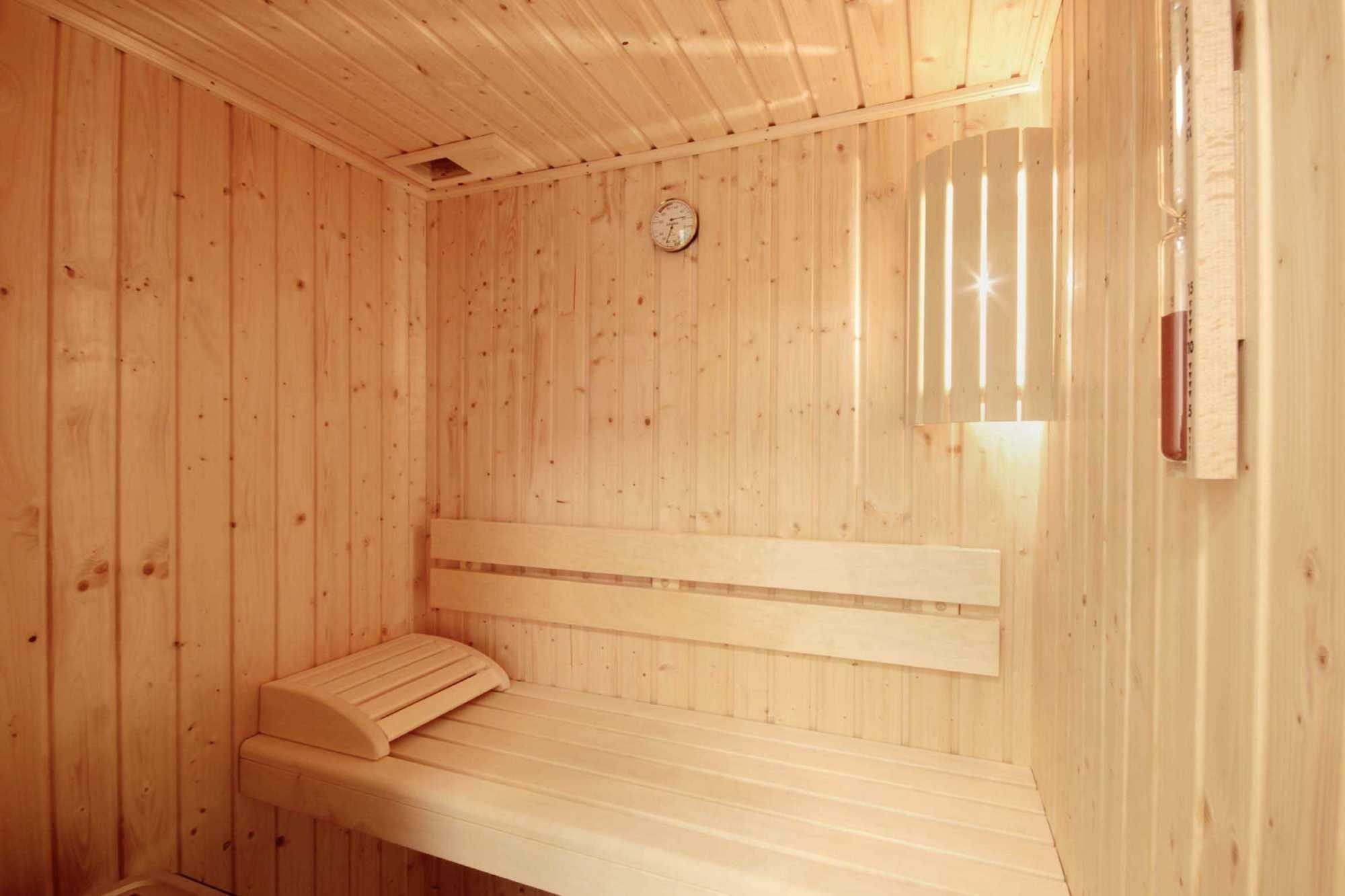 Das erste Badezimmer verfügt über eine Sauna sowie über eine ebenerdige Dusche, Waschtisch, Kosmetikspiegel, Fön und einen Handtuchheiztrockner.
