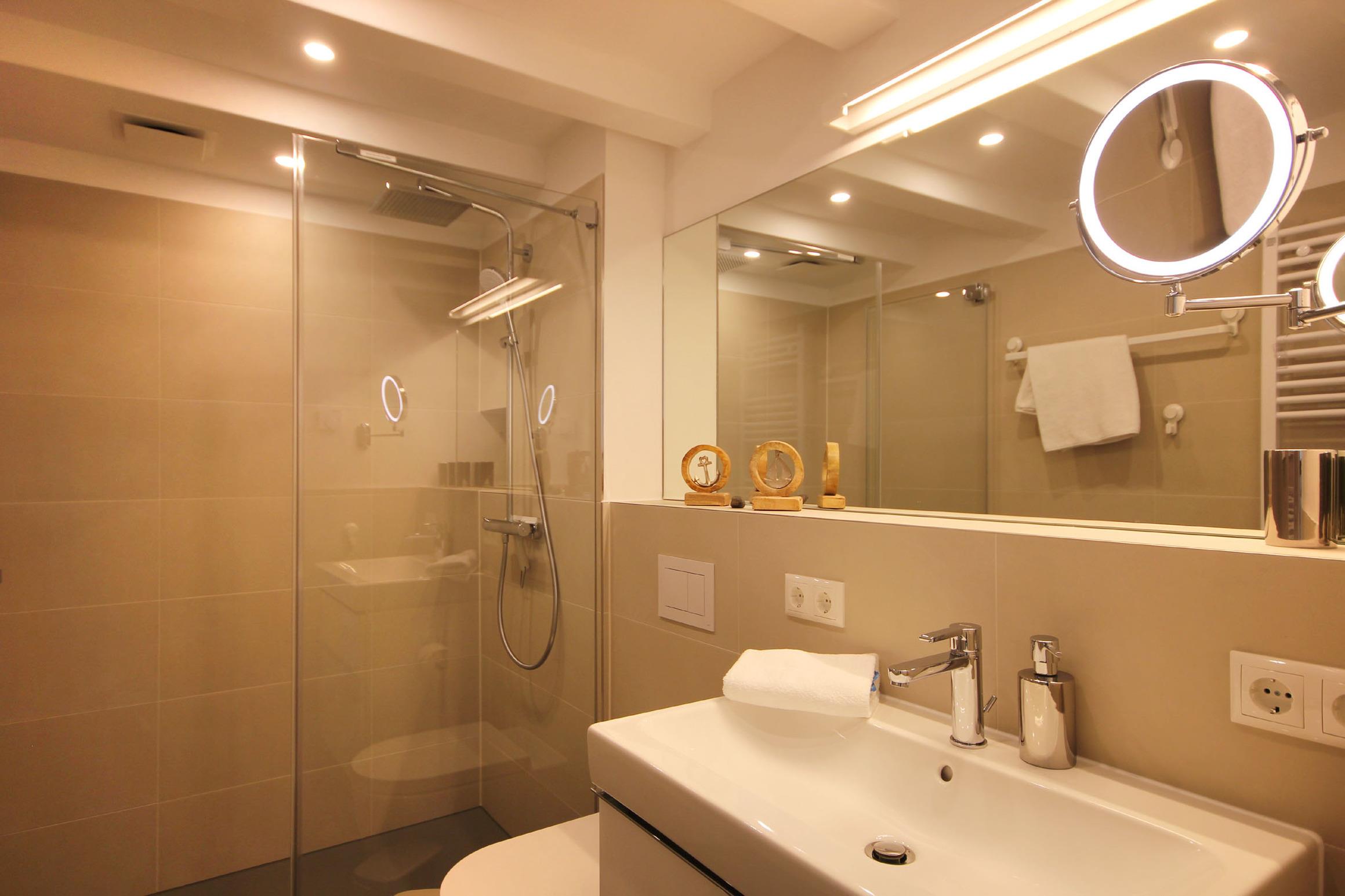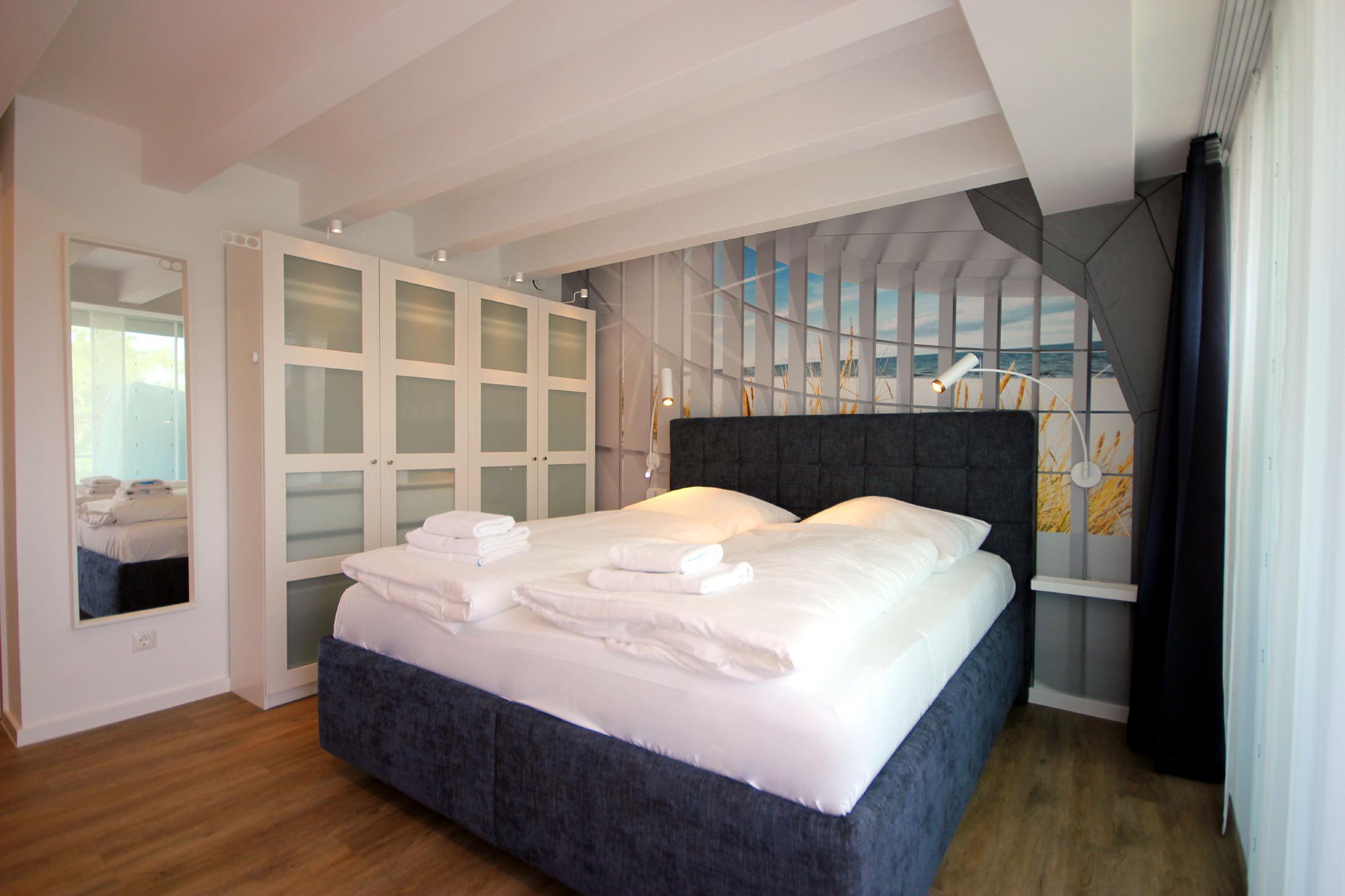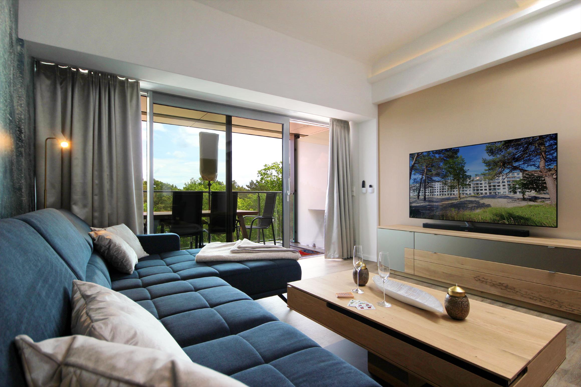 Ihre stilvolle 3-Raum-Maisonettewohnung 112RB351 „Himmelblau“ verfügt über 106 qm² Wohnfläche und erstreckt sich über die 4. und 5. Etage. Die hochwertig eingerichtete Nichtraucherwohnung, mit zwei Balkonen mit Blick zum Kiefernwald sowie den Ostseedünen, bietet für bis zu 6 Personen (5 Erwachsene und 1 Kleinkind) ausreichend Platz. Das mit Liebe zum Details eingerichtete Appartement verfügt über einen großzügigen und geschmackvollen Wohnbereich, zwei Schlafzimmer, zwei Vollbäder und ein Gäste-WC sowie eine separate Küche. Das Wohnzimmer, mit Zugang zum ersten Balkon, ist mit einer bequemen Sitzecke, einem raffiniertem Couchtisch, einem großen SMART-TV, WLAN sowie einer Bose Soundbar ausgestattet. In der einladenden Küche erwartet Sie unter anderem ein Kombibackofen mit Mikrowellenfunktion, Induktionskochfeld sowie ein Geschirrspüler der Marke Miele, Kühlschrank, Tiefkühlschrank, Kaffeemaschine, Wasserkocher, Toaster, weiteres umfangreiches Kücheninventar sowie ein TV. Das Hauptschlafzimmer mit einem Bad en Suite verfügt über ein bequemes Boxspringbett, Balkon mit Sitzmöglichkeit und eigenem Strandkorb, Kleiderschrank sowie zusätzlichem Flachbild-TV. Das Bad erwartet Sie mit einer Badewanne, einen Waschtisch, Kosmetikspiegel, Handtuchheizung sowie WC. Im zweiten Schlafbereich, ebenfalls mit Bad en Suite mit Dusche, befindet sich ein Schreibtisch, Flachbild-TV sowie ein Doppelstockbett, bei dem auf der unteren Ebene (1,40m breit) bis zu 2 Personen nächtigen können. In beiden Schlafzimmern sorgen zusätzliche Verdunklungsplissees für einen erholsamen Schlaf. Für kleine Gäste stehen auf Anfrage zwei Hochstühle (Kleinkind [&] bis 7 Jahre) sowie ein Kindereisebett zur Verfügung. Ihr Vierbeiner ist herzlich willkommen, denn ein Bettchen steht schon bereit. Zusätzlichen Stauraum, auch für mitgebrachte Fahrräder, bietet Ihnen der wohnungseigene Abstellraum (2. Etage) mit Waschmaschine. Zudem finden Sie hier alles für einen gelungenen Strandtag (Bollerwagen, Strandspielzeug, Windschutz, etc.). Als weiteres Highlight ist auf allen Fernsehgeräten ein eigener Netflix-Zugang installiert. Rundum eine erstklassig eingerichtete Wohnung zum Abschalten vom Alltag und Genießen des Urlaubes.