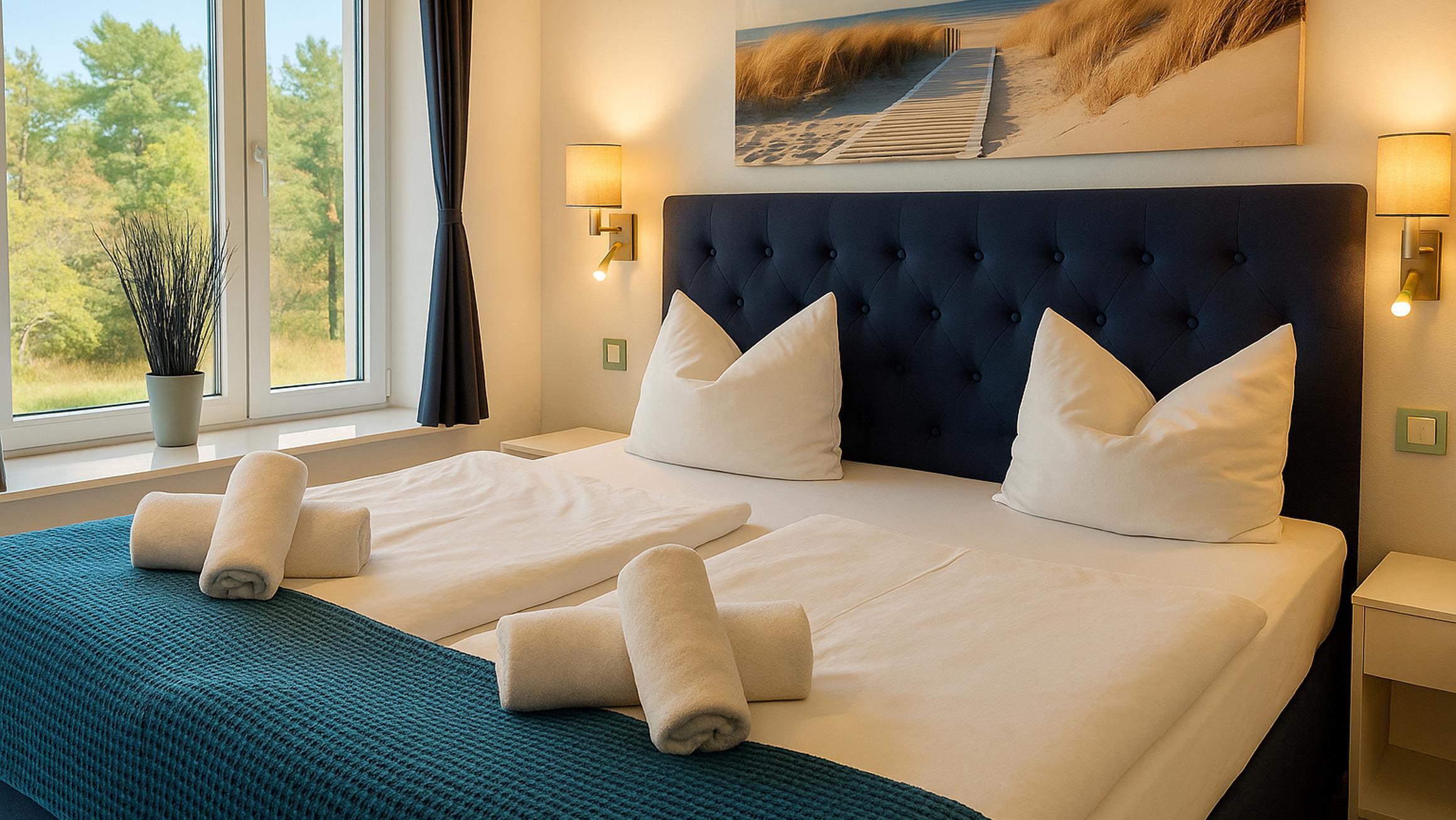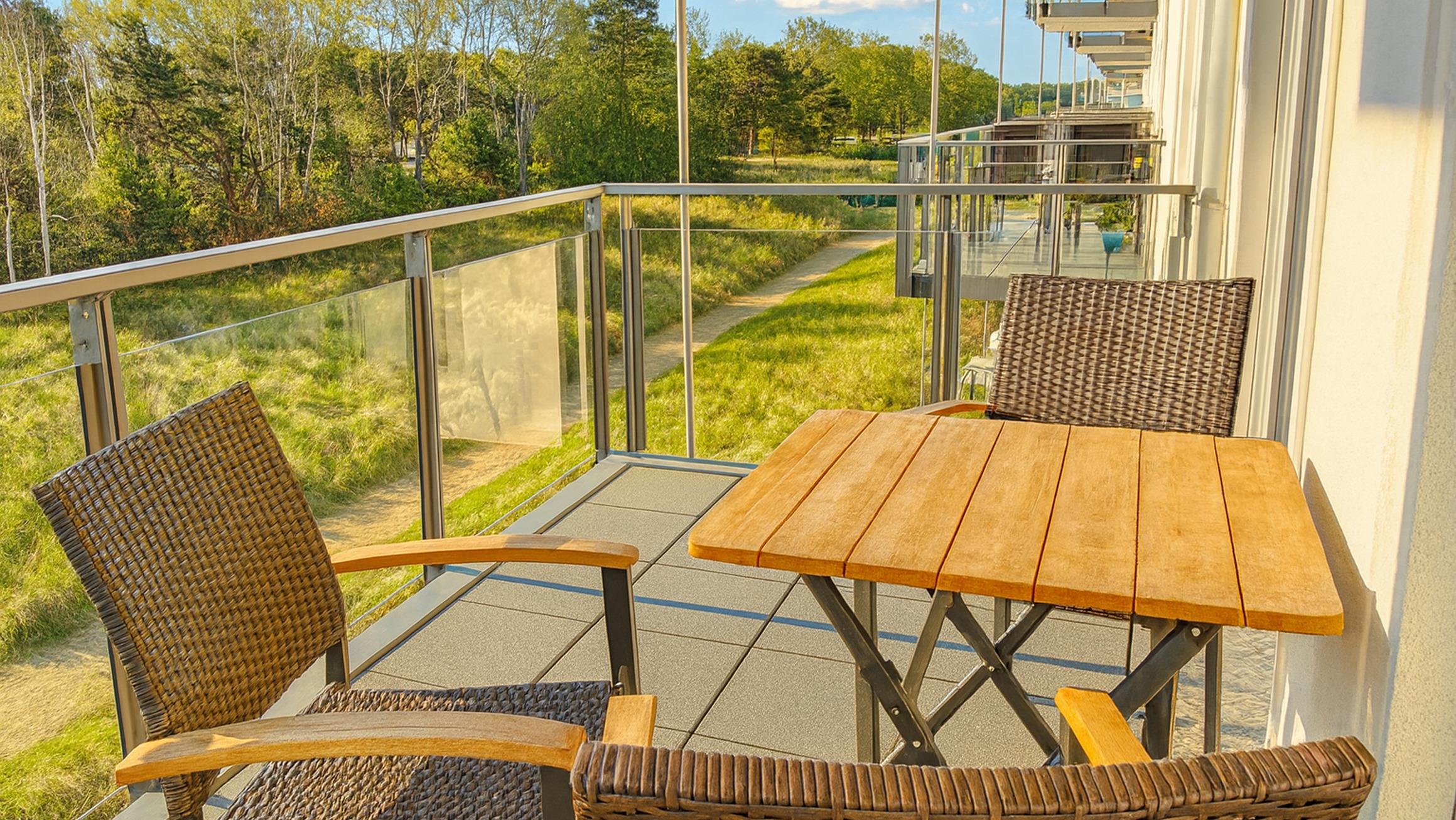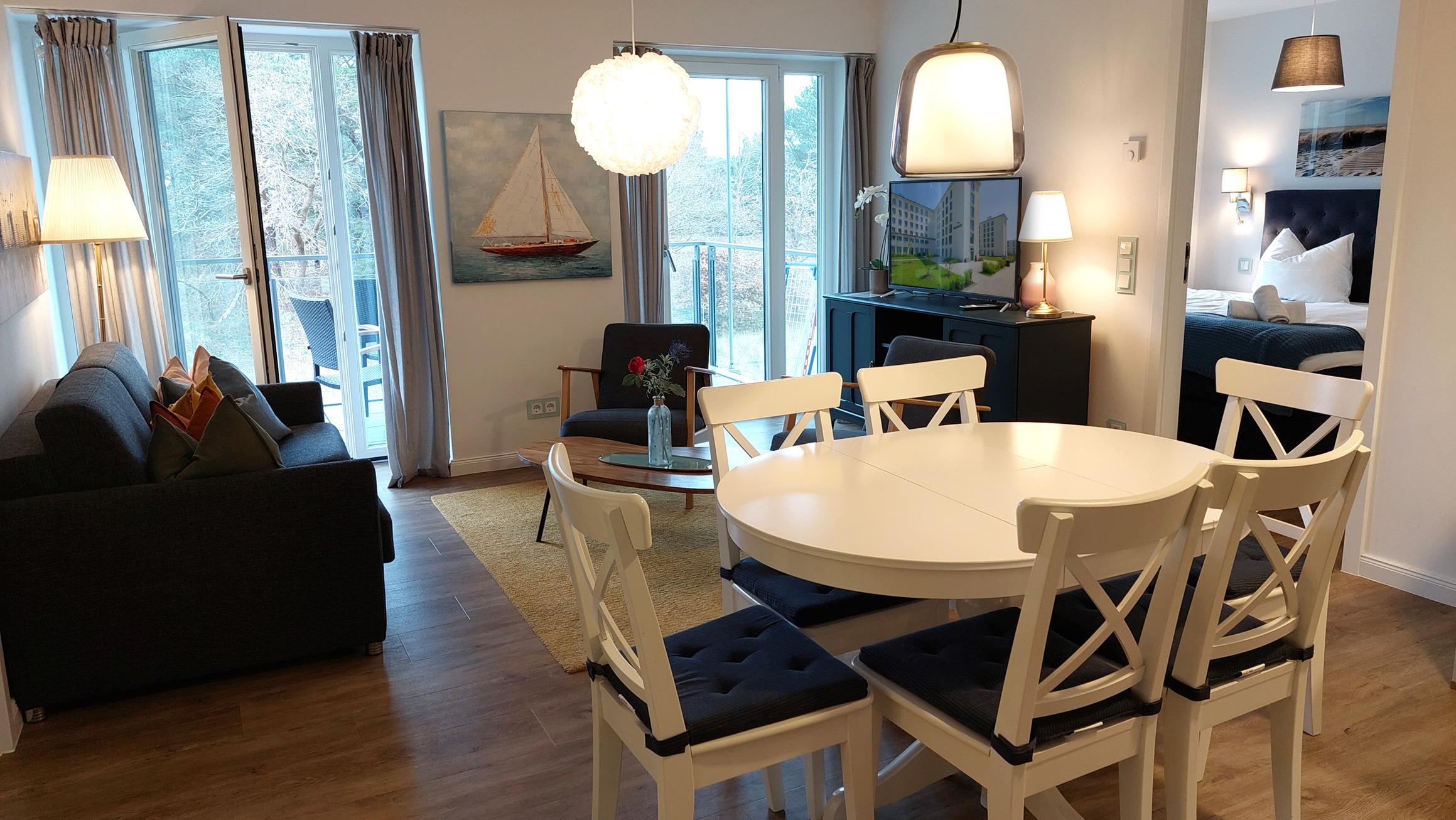 Das Wohn- und Esszimmer ist das Zentrum der Wohnung und lädt mit einer ausklappbaren Sofalandschaft zum Entspannen ein. Für Unterhaltung bei jedem Wetter gibt es einen Smart-TV und kostenfreies WLAN. Der Essbereich bietet Platz für 6 Personen und vom möblierten und überdachten Balkon aus hat man einen Blick auf den angrenzenden Küstenwald und die Ostseedünen.