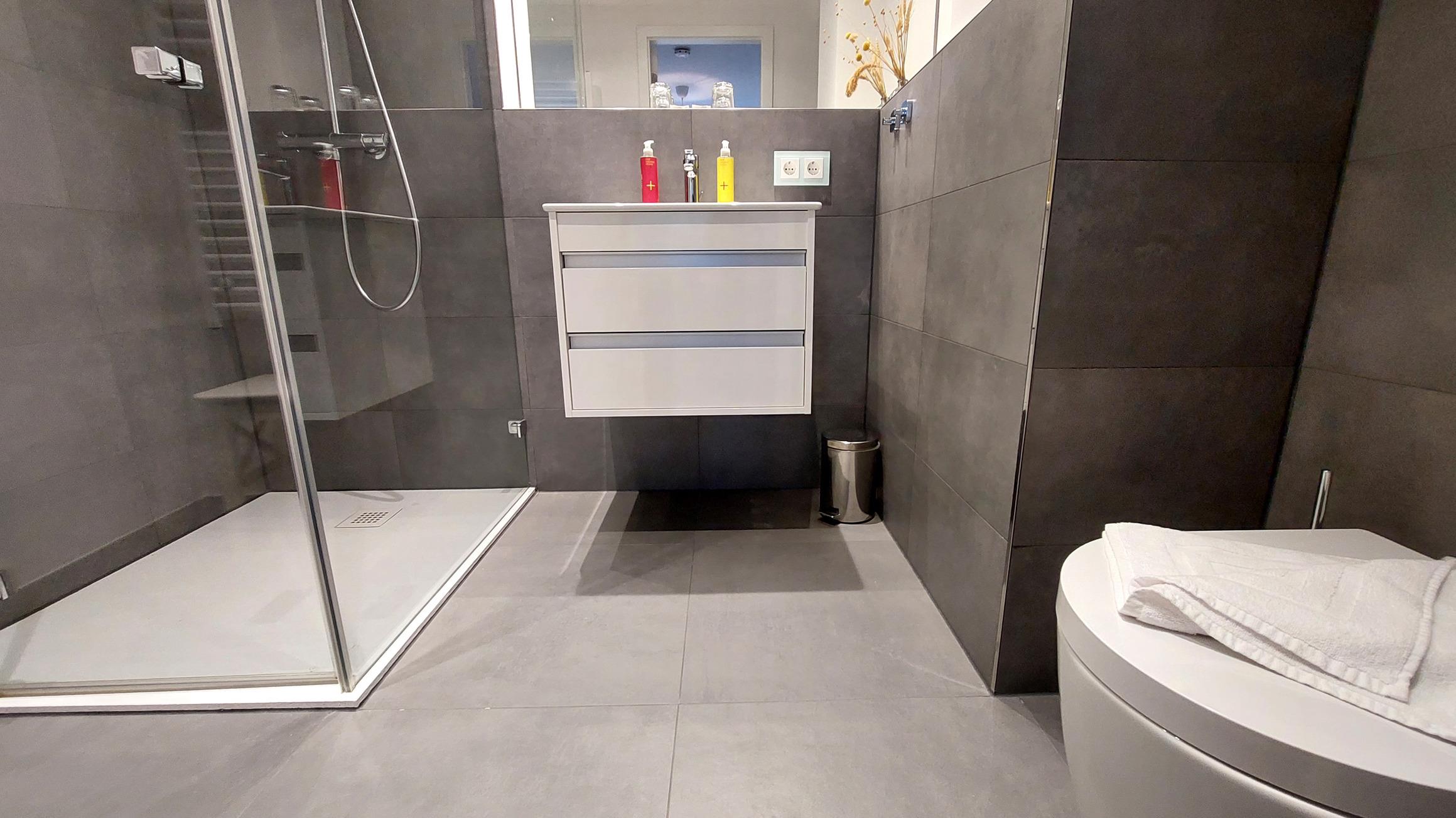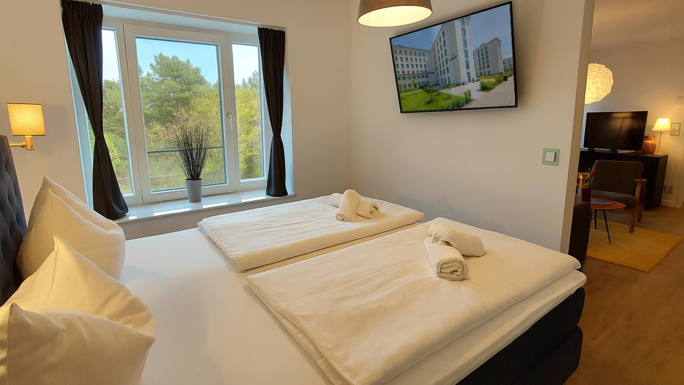 Die Wohnung verfügt über 2 vollwertige Schlafzimmer, jeweils mit einem Doppelbett, Kleiderschrank und eigenem Fernseher. Eines der Schlafzimmer hat außerdem ein eigenes Badezimmer ("Bad en Suite"). Das zweite Badezimmer ist ebenfalls ausgestattet mit WC, Waschtisch und ebenerdiger Dusche.