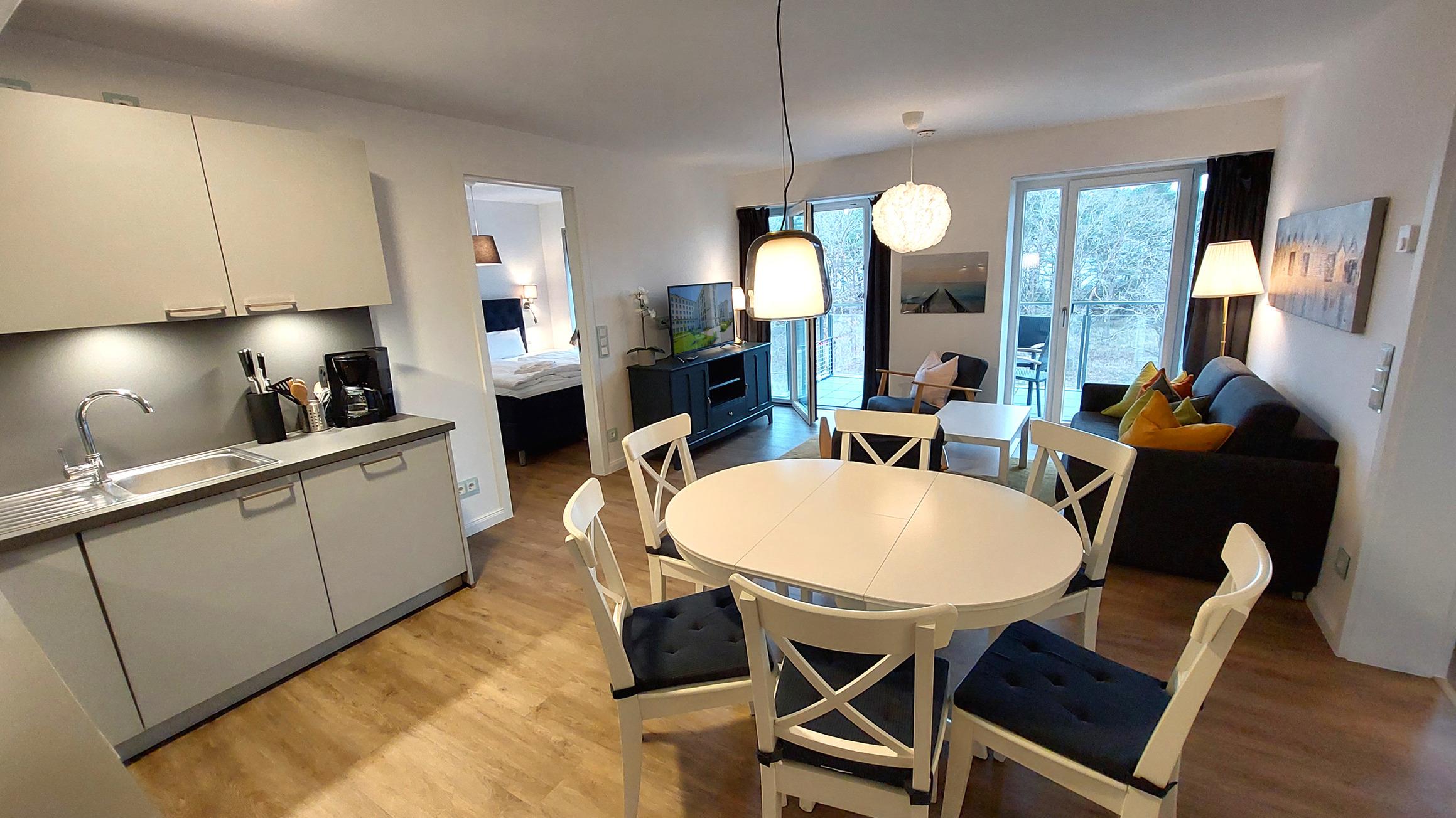 Das Wohn- und Esszimmer ist das Zentrum der Wohnung und lädt mit einer ausklappbaren Sofalandschaft zum Entspannen ein. Für Unterhaltung bei jedem Wetter gibt es einen Smart-TV und kostenfreies WLAN. Der Essbereich bietet Platz für 6 Personen und vom möblierten und überdachten Balkon aus hat man einen Blick auf den angrenzenden Küstenwald und die Ostseedünen.