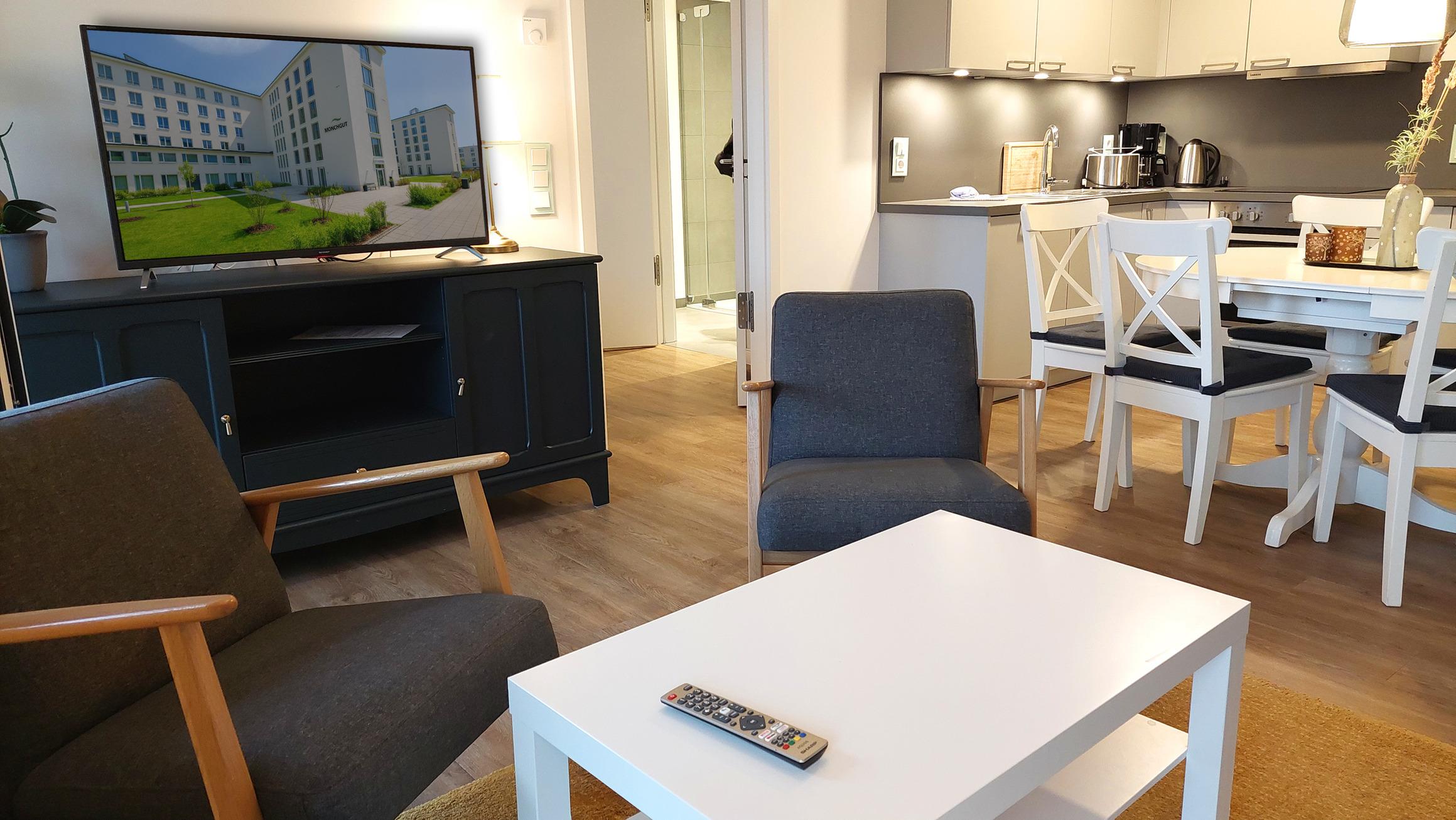 Das Wohn- und Esszimmer ist das Zentrum der Wohnung und lädt mit einer ausklappbaren Sofalandschaft zum Entspannen ein. Für Unterhaltung bei jedem Wetter gibt es einen Smart-TV und kostenfreies WLAN. Der Essbereich bietet Platz für 6 Personen und vom möblierten und überdachten Balkon aus hat man einen Blick auf den angrenzenden Küstenwald und die Ostseedünen.
