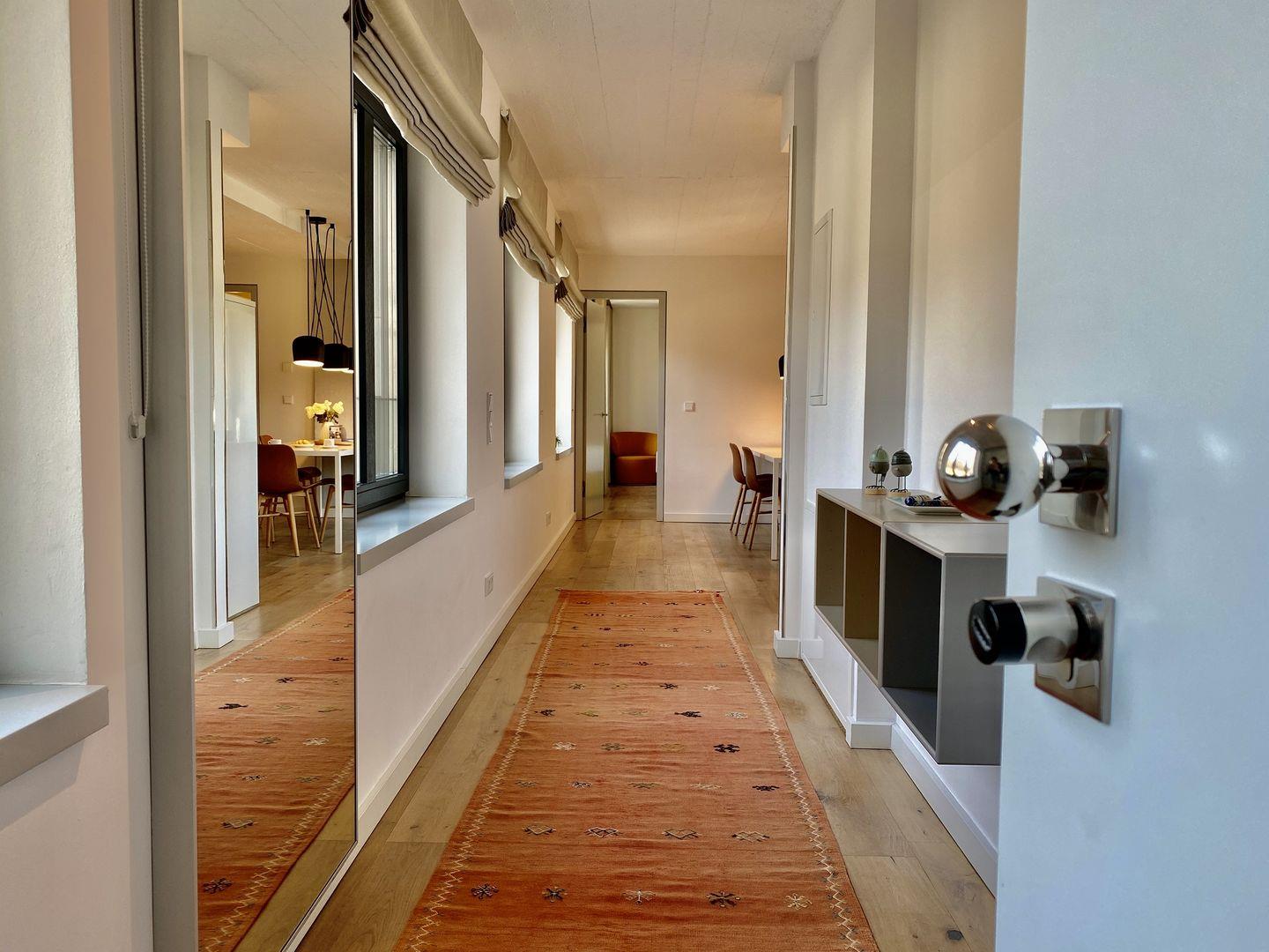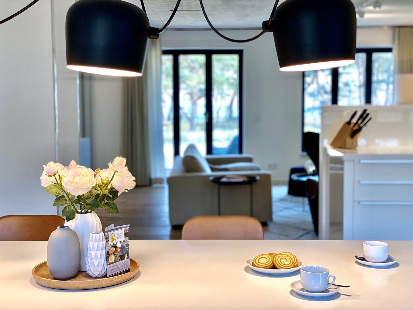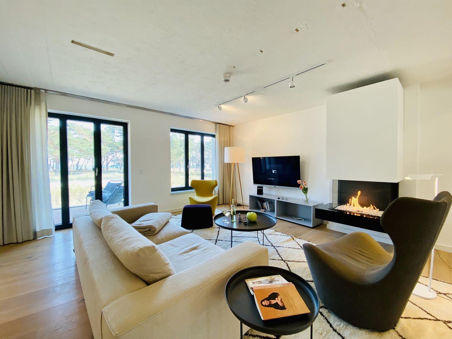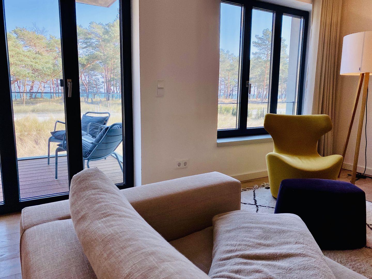 Der Fahrstuhl bringt Sie direkt in die erste Etage der Düne 7. Ein wunderschönes und großzügiges Meerblick-Appartement in stilvollem Design wartet hier auf Sie. Auf 105 m² können es sich bis zu vier Personen richtig gut gehen lassen, gemeinsam den Urlaub genießen und eine unvergesslich schöne Zeit auf der Insel Rügen verbringen. Die Einrichtung der 3-Raum-Wohnung besticht durch ihre schlichte und moderne Eleganz. Nordisches Design und dezente Accessoires vermitteln Wohnlichkeit, die jeden Gedanken an Stress vergessen lässt. Die offene und helle Wohnungsdecke ist im Stil der Vergangenheit belassen und etwas ganz Besonderes. Das große Wohnzimmer hat bodentiefe Balkonfenster Richtung Meer und Richtung Süden, die viel Licht ins Innere der Ferienwohnung lassen. Ein stylischer Gas-Kamin sorgt für Wärme und kuschelige Behaglichkeit. Auf dem gemütlichen Dreisitzer-Sofa und in den beiden bequemen Sesseln haben Sie beste Plätze für ruhige Abende und beruhigende Blicke durch die Kiefernschonung hindurch auf den hauseigenen Pool, den Strand und das Meer. Treten Sie hinaus auf den Balkon und genießen Sie den Blick auf die Ostsee und lauschen Sie dem Toben der Wellen und den Schreien der Möwen.
