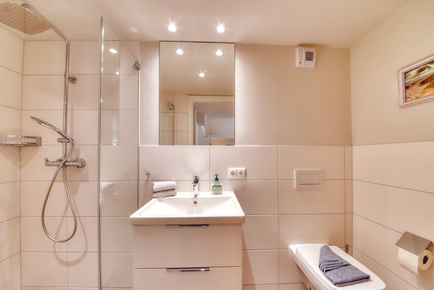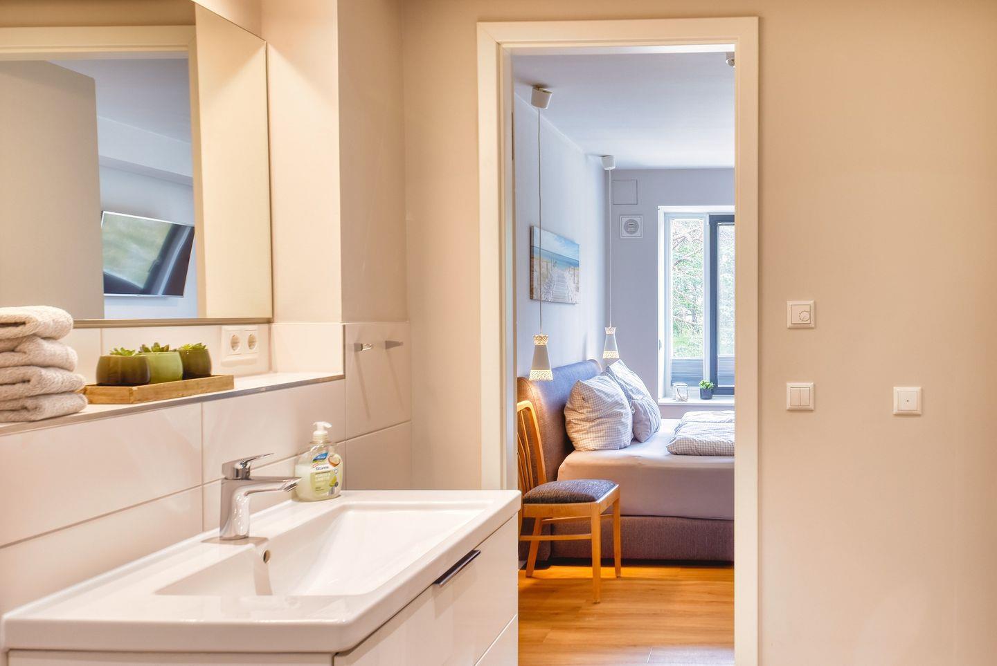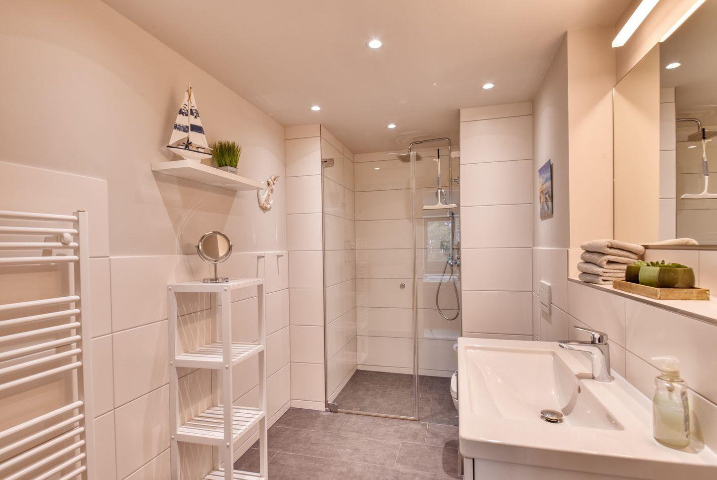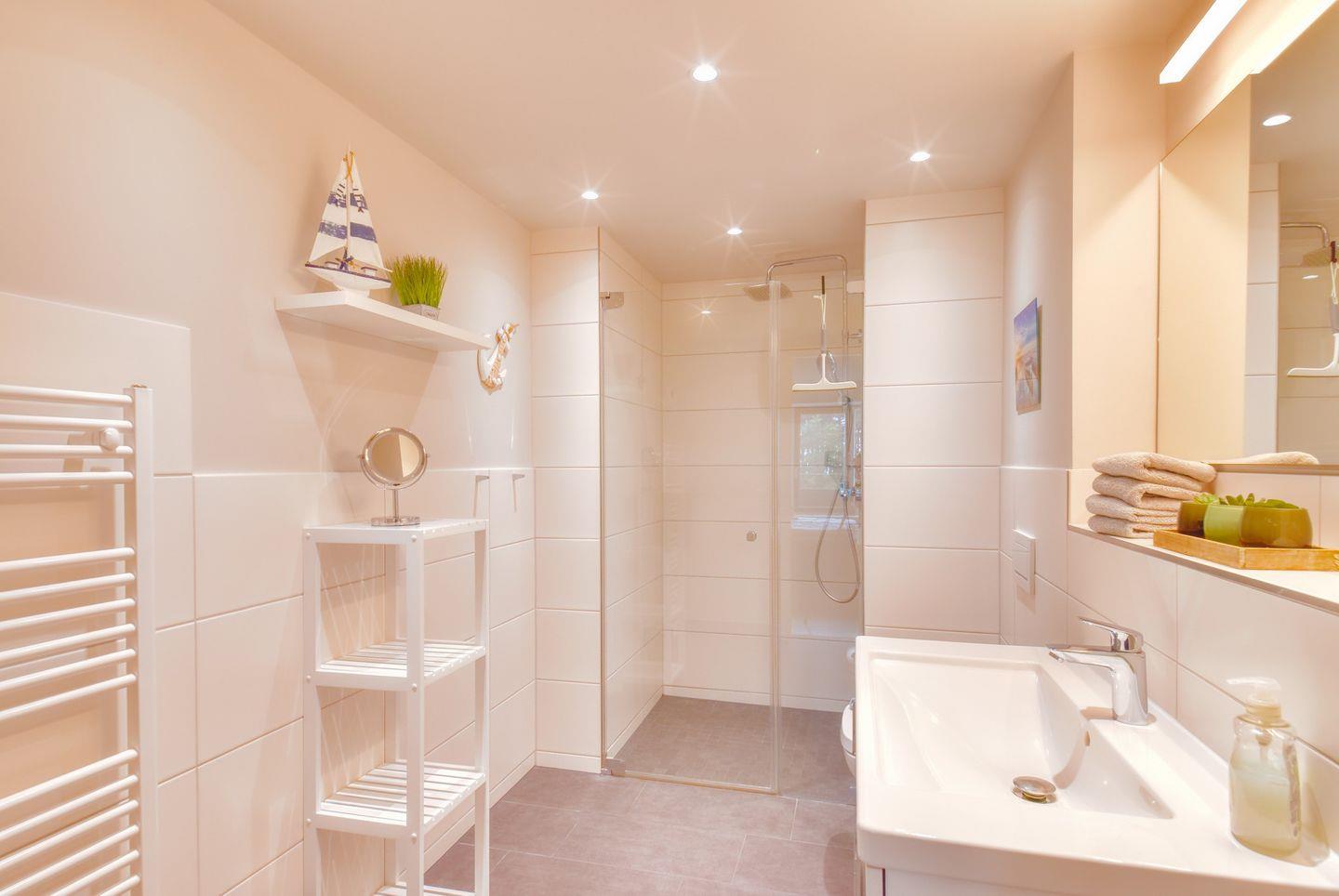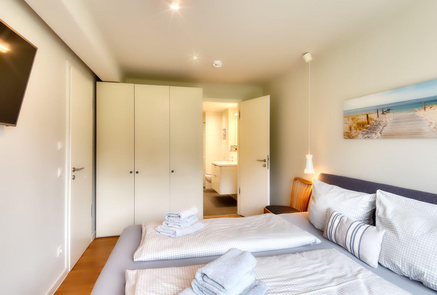 In der Ferienwohnung "Strandleben" im Haus Granitz können Sie sich morgens von den Sonnenstrahlen wecken lassen und haben dabei von Ihren Boxspringbetten direkten Blick auf die funkelnde Ostsee. Beide Schlafzimmer zur Seeseite sind mit Boxspringbetten und einem TV ausgestattet, so dass jeder Gast seine Lieblingssendungen schauen kann. Eines der Schlafzimmer verfügt darüber hinaus über ein „Bad en suite“. Zusätzlich steht ein drittes Zimmer zur Binnenseite mit zwei Einzelbetten zur Verfügung. Für einen erholsamen Schlaf wurden in den Schlafräumen alle stromführenden Leitungen mit Abschirmung verlegt, um während des Schlafes Elektrosmog zu vermeiden. Die beiden Badezimmer der Ferienwohnung haben eine traumhafte Regendusche mit ebenerdigem Eintritt.