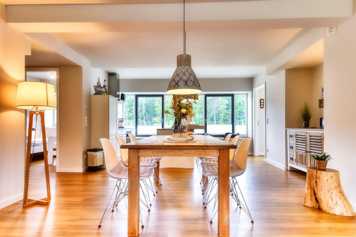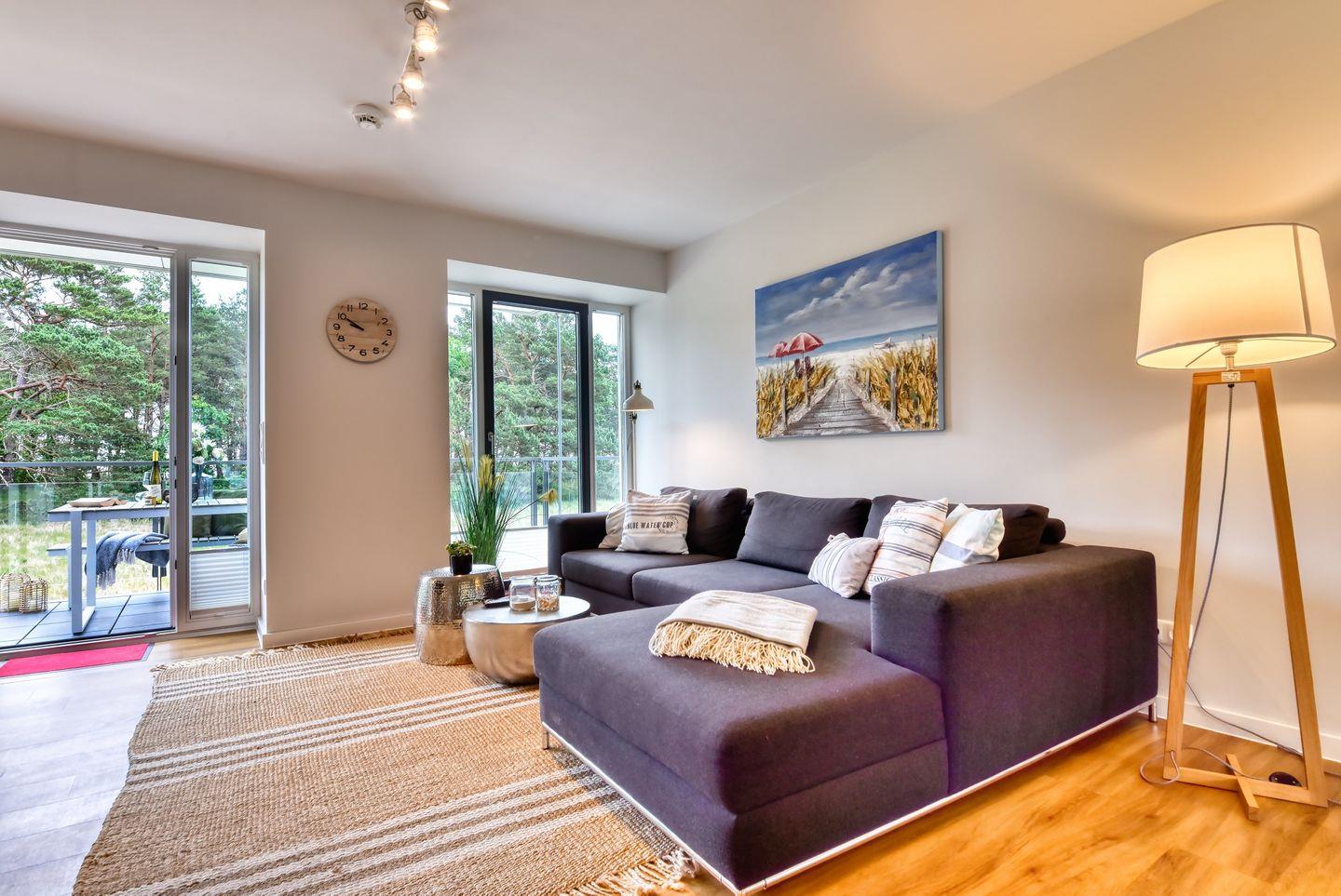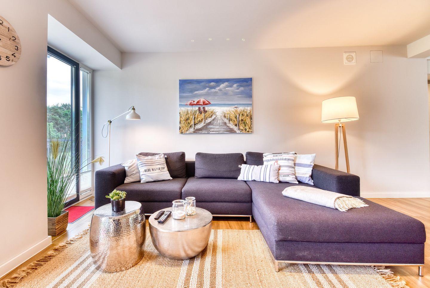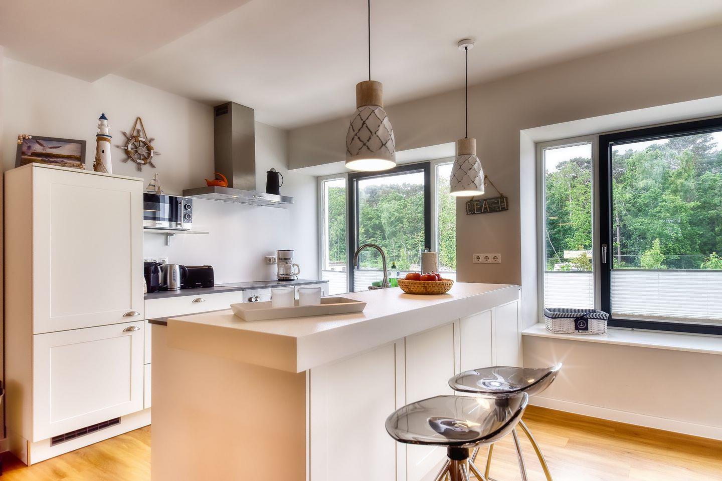 Die lichtdurchflutete, barrierefreie Ferienwohnung bietet mit ihrer hellen, maritimen Einrichtung einen erholsamen Platz zum Entspannen und Wohlfühlen. Das Wohnzimmer lädt mit seiner bequemen Couch, einem großen Smart TV mit Internetanschluss und stimmungsvoller Beleuchtung zu gemütlichen Abenden ein. Direkt an das Wohnzimmer schließt sich der Balkon mit Seeblick an, der zu jeder Tageszeit zum Verweilen einlädt. Ein rustikaler Naturholztisch mit gemütlichen Vitra-Stühlen gibt ausreichend Platz für schöne Abende mit gutem Essen, welches in der direkt angrenzenden und komplett ausgestatteten Küche mit Kaffeemaschine, Geschirrspüler, Backofen, Cerankochfeld, Wasserkocher, Mikrowelle, Handrührgerät und sonstigen Küchenutensilien zubereitet werden kann. Gläser für sämtliche Getränkesorten sind ebenfalls vorhanden. Für einen schönen Kochabend ist die Küche perfekt ausgestattet und lädt mit Ihrer Theke alle Bewohner zu Küchenpartys ein. Eine vorhandene Stereoanlage mit Kassetten- und CD-Deck bietet Möglichkeit für die musikalische Unterhaltung oder um schöne Kindergeschichten/-lieder abspielen zu können.