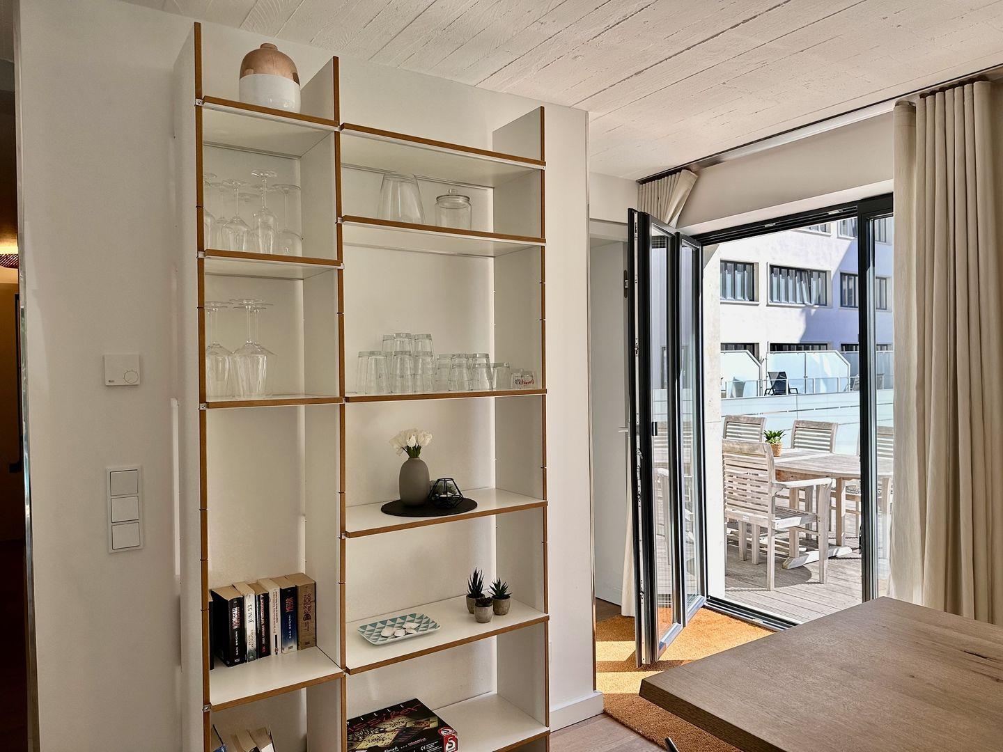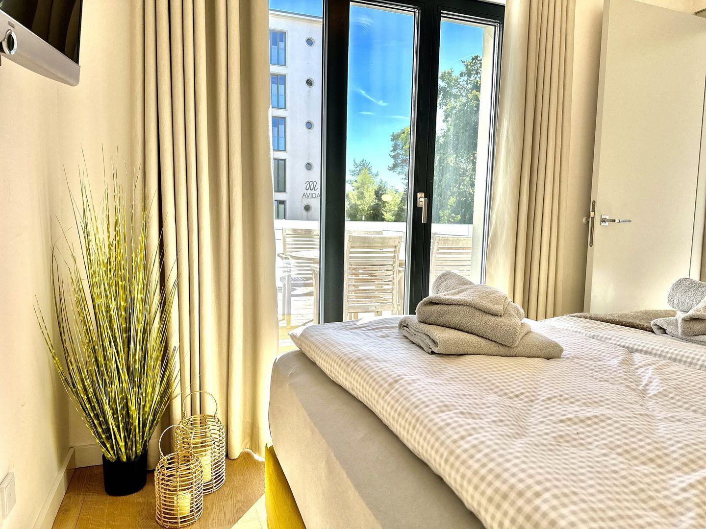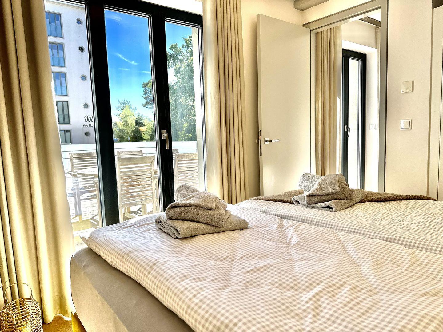 Das zweite Schlafzimmer hat einen Zugang zur Sonnenterrasse. Ein Gäste-WC ist vom Wohnzimmer aus zugänglich. Das WLAN ist kostenfrei und im 2. Obergeschoss des Hauses gibt es einen Waschmaschinen- und Trocknerraum zur kostenlosen Nutzung durch Gäste des Hauses. Außerdem ist für Ihr Auto ein kostenfreier Stellplatz im Parkhaus reserviert und Sie können viele SKY Sender kostenfrei auf dem Wohnzimmer Fernseher schauen. In den Sommermonaten stehen Ihnen der unbeheizte Pool vor dem Haus, Sonnenliegen am Pool und ein Strandkorb direkt am Strandabschnitt vor dem Haus zur Verfügung.