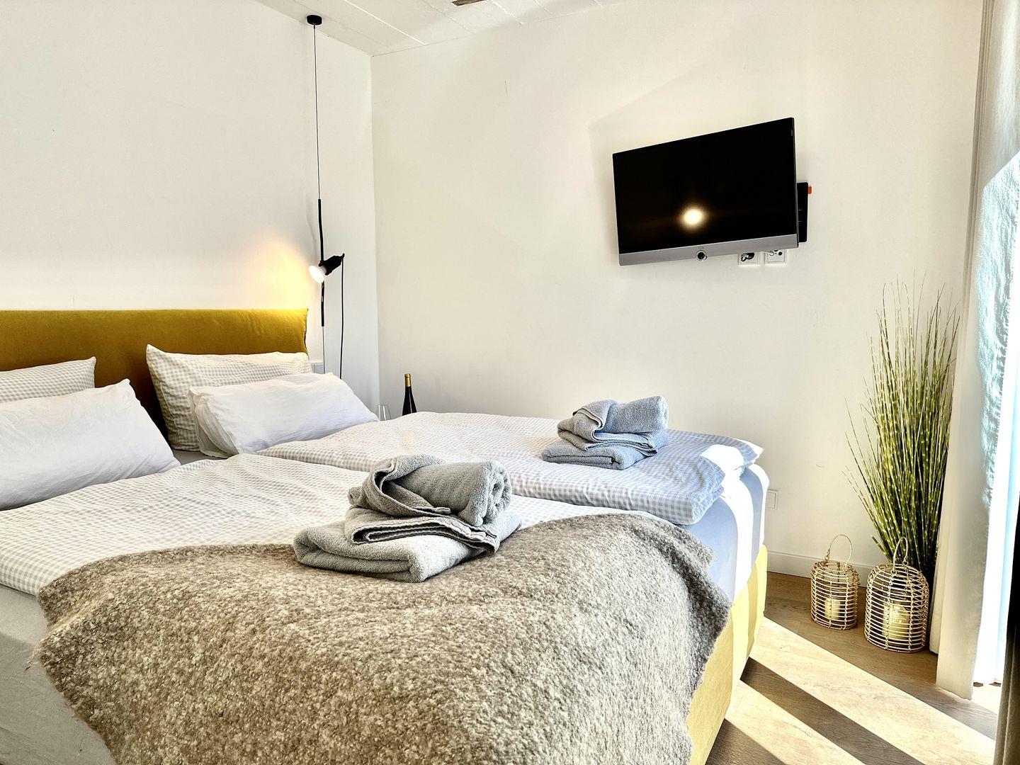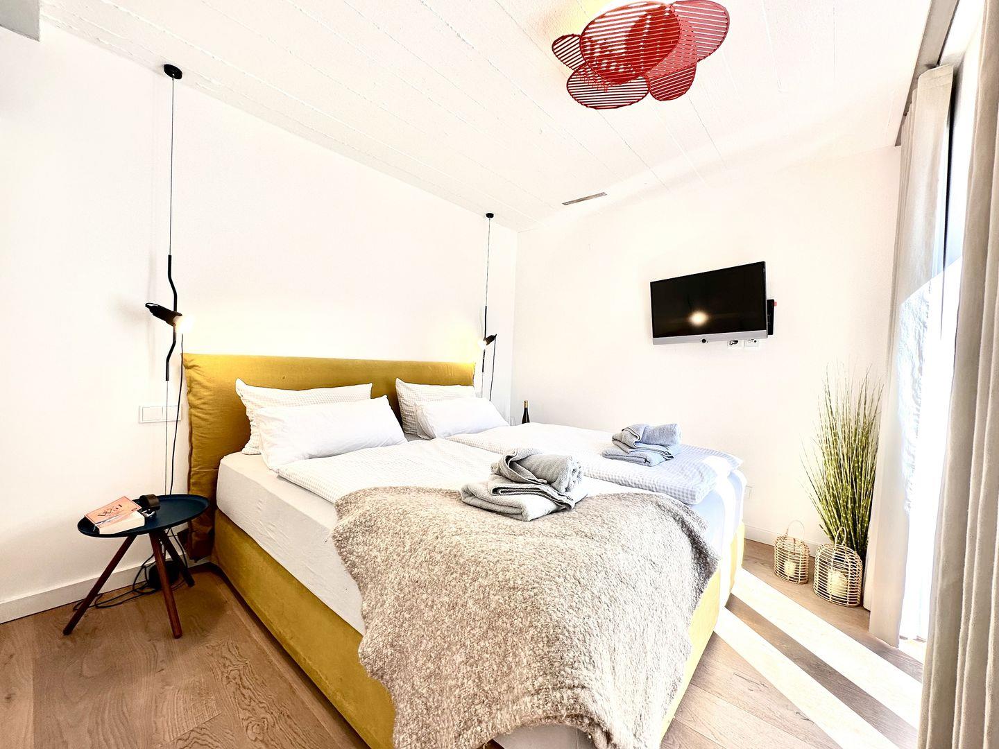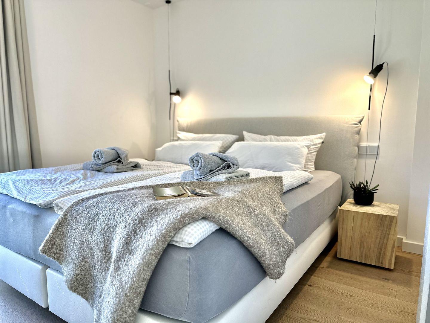 Beide Schlafzimmer versprechen erholsame und entspannende Nächte. In den großen Boxspringdoppelbetten der Marke Schramm wird das Schlafen zum Vergnügen. Ein Schlafzimmer hat einem Flachbild-TV. Das Badezimmer mit ebenerdiger Regendusche, Waschtisch und WC lässt das Masterbad zu einer kleinen Wellness-Oase werden, die Ihnen noch mehr Entspannung zu verschaffen wird. Eine klassische Sauna von der Firma RUKU ist der ideale Ort, sich an ungemütlichen Tagen die Zeit zu verschönern – besonders nach einem stürmischen Strandspaziergang. Auch Ablagemöglichkeiten gibt es in den Zimmern reichlich.