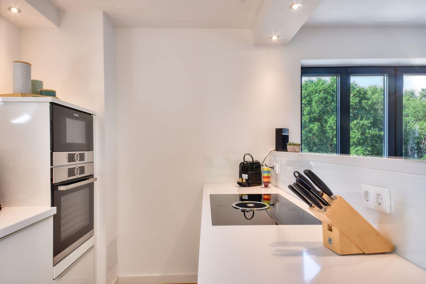 Der Fahrstuhl bringt Sie direkt in die dritte Etage der Düne 7. Ein wunderschönes und großzügiges Appartement in stilvollem Design wartet hier auf Sie. Auf 81 m² können es sich bis zu vier Personen und ein Kind richtig gut gehen lassen, gemeinsam den Urlaub genießen und eine unvergesslich schöne Zeit auf der Insel Rügen verbringen. Die Einrichtung der 3-Raum-Wohnung besticht durch ihre schlichte und moderne Eleganz. Nordisches Design und dezente Accessoires vermitteln Wohnlichkeit, die jeden Gedanken an Stress vergessen lässt. Die offene und helle Wohnungsdecke ist im Stil der Vergangenheit belassen und etwas ganz Besonderes. Das große Wohnzimmer hat bodentiefe Balkonfenster Richtung Süden, die viel Licht ins Innere der Ferienwohnung lassen. Ein stylischer Gas-Kamin sorgt für Wärme und kuschelige Behaglichkeit. Auf dem gemütlichen Sofa und in den beiden bequemen Sesseln haben Sie beste Plätze für ruhige Abende und beruhigende Blicke durch die Kiefernschonung hindurch. In diesem Urlaubsdomizil entspannen Sie mit allen Sinnen. In der voll ausgestatteten Küche finden Sie alles, was das Herz begehrt. Hochwertige Markengeräte von Bosch und WMF, erlesenes Geschirr – da wird das Kochen zu einem richtigen Urlaubs-Event. Essen können Sie am wunderschönen, filigranen weißen Tisch auf komfortablen Lederstühlen. Für Kaffeeliebhaber bietet die Küche eine Kaffeefiltermaschine und eine Nespressomaschine inklusive einiger Starter-Kapseln für den ersten Kaffeegenuss am Anreisetag.