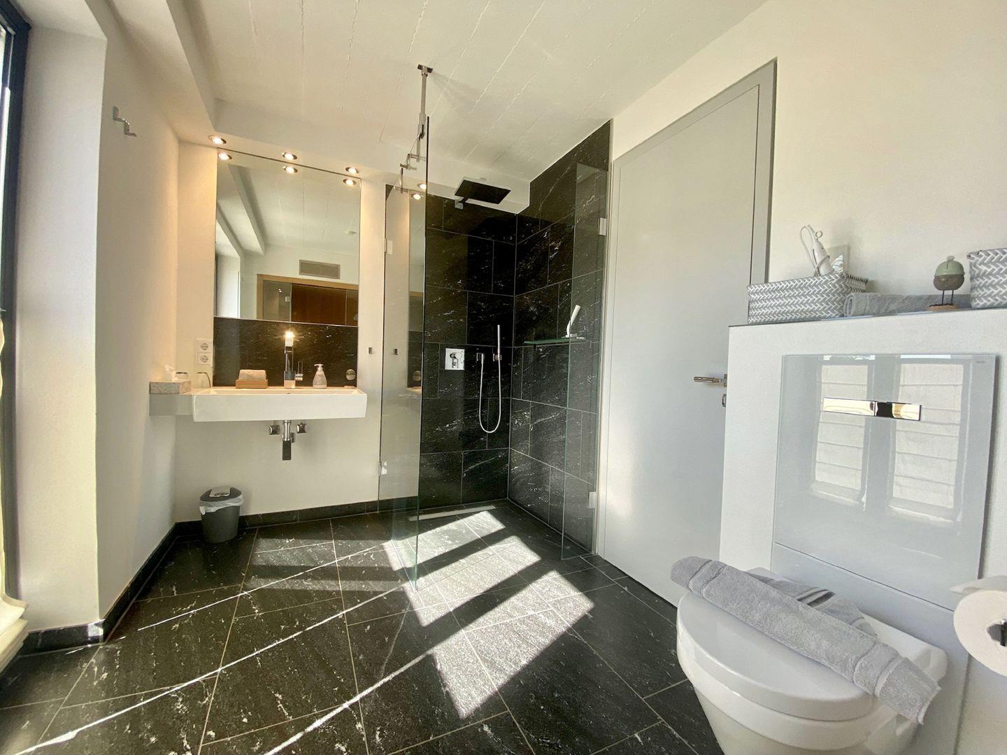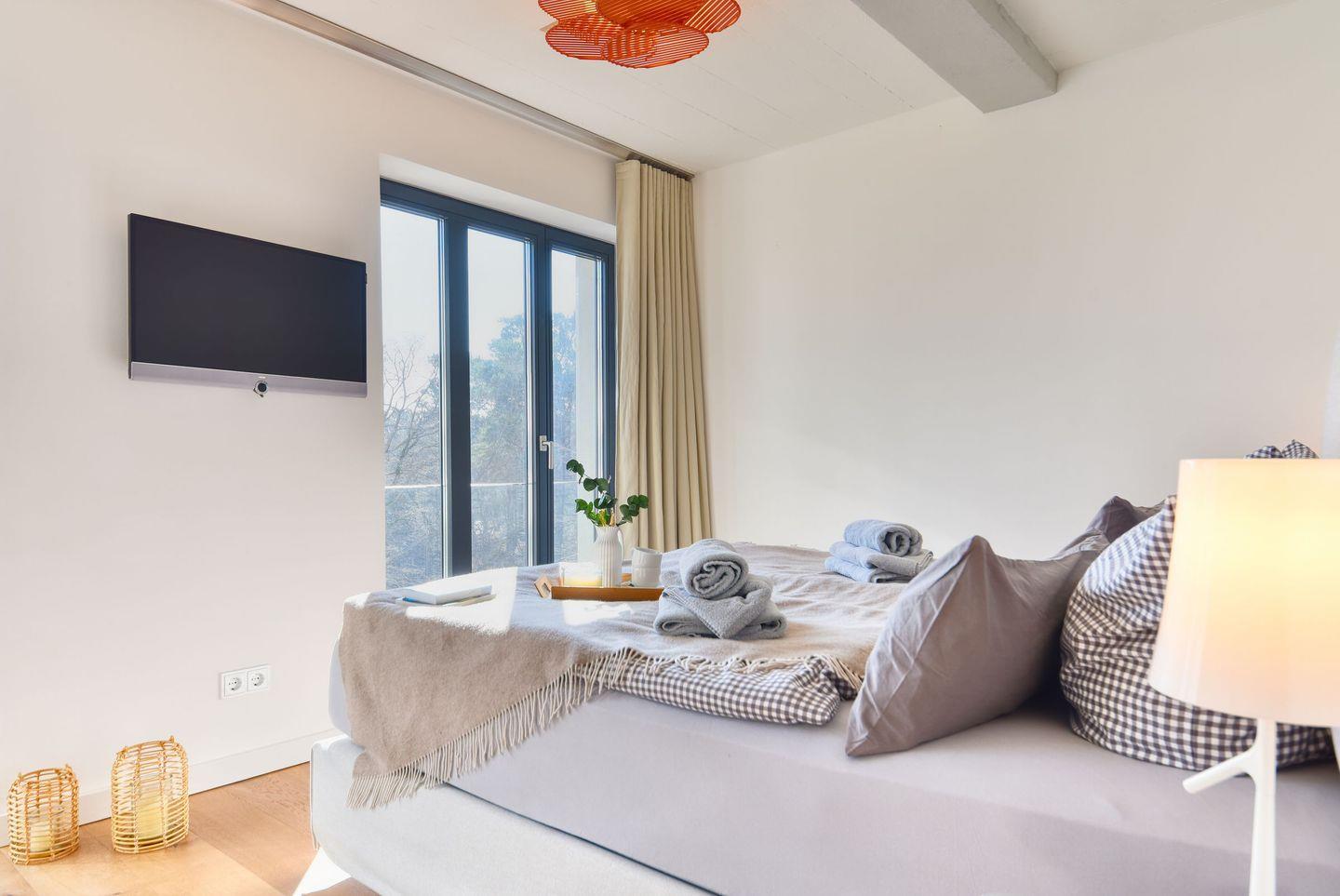 Beide Schlafzimmer versprechen erholsame und entspannende Nächte. In den großen Boxspringdoppelbetten der Marke Schramm wird das Schlafen zum Vergnügen. Ein Schlafzimmer hat zusätzlich einen Flachbild-TV. Im Masterbad wartet zudem eine kleine Wellness-Oase darauf, Ihnen noch mehr Entspannung zu verschaffen. Eine klassische Sauna von der Firma RUKU ist der ideale Ort, sich an ungemütlichen Tagen die Zeit zu verschönern – besonders nach einem stürmischen Strandspaziergang. Auch Ablagemöglichkeiten gibt es in den Zimmern reichlich.