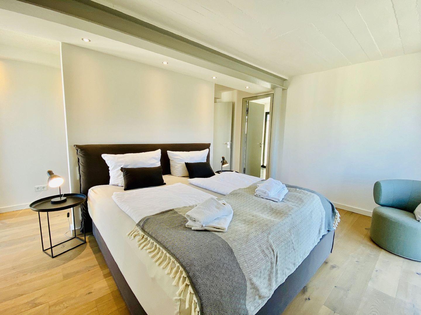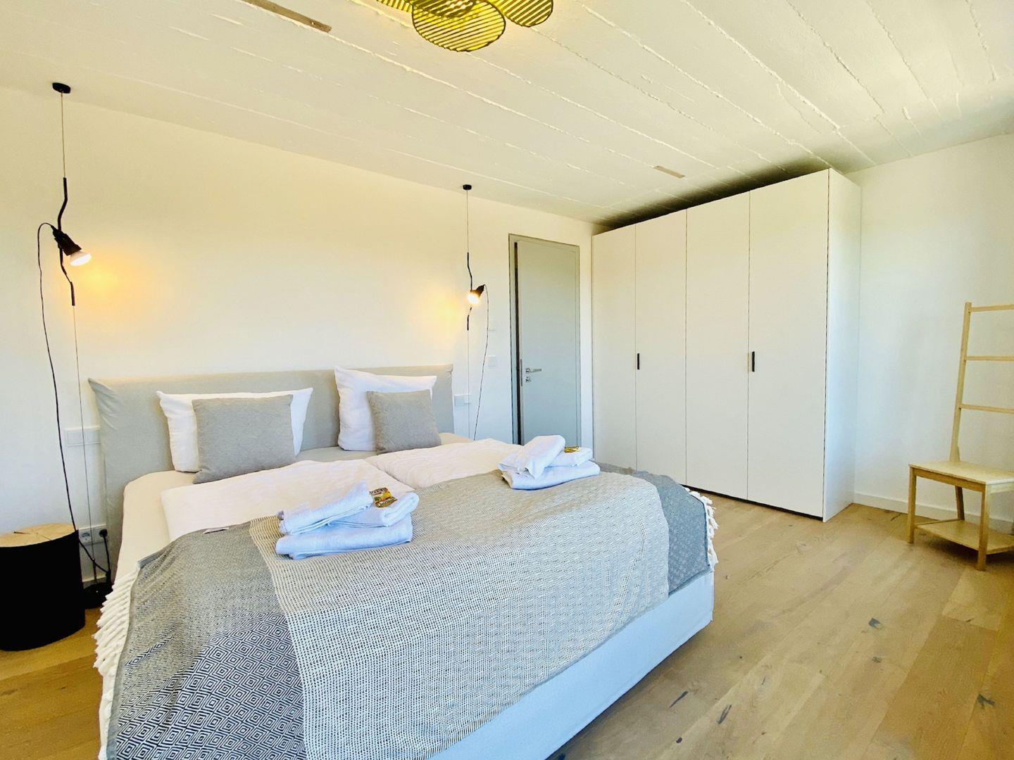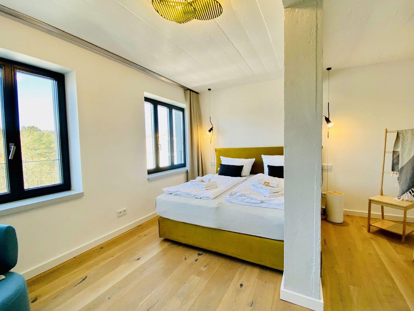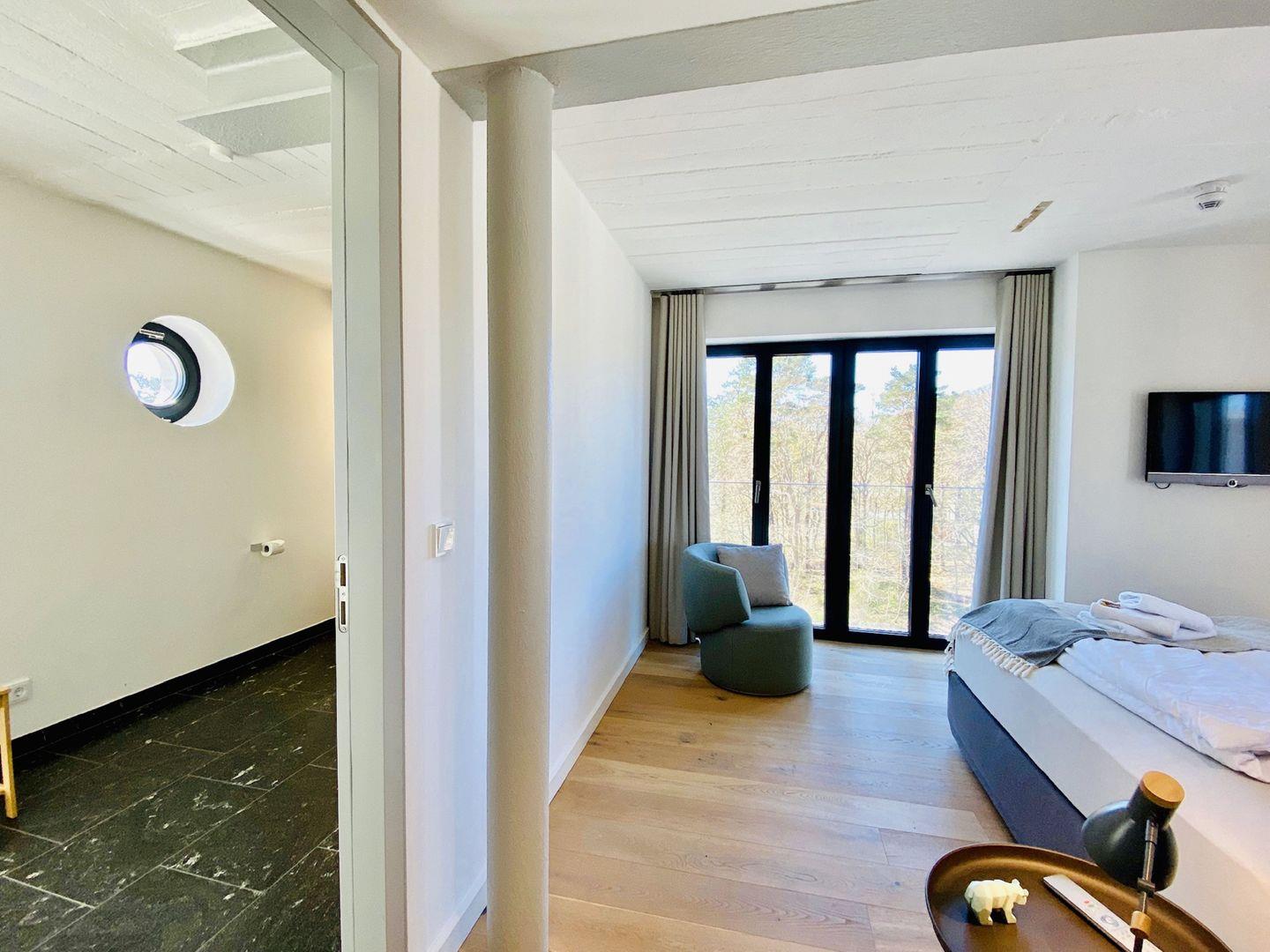 Edler Holzfußboden, natürliche Materialien, hochwertiges Mobiliar. Unser Penthouse 17 in Prora ist für all diejenigen, die sich im Urlaub etwas gönnen möchten. Die Wohnung verfügt über 5 Schlafzimmer mit traumhaftem Doppel Boxspringbett von der Marke SCHRAMM. Vier Schlafzimmer haben einen TV. Zu jedem Schlafzimmer gehört ein Badezimmer mit Dusche, WC und Waschtisch. Ein Badezimmer hat zusätzlich eine Badewanne. Die RUKU-Sauna mit Fenster zur Seeseite kann jederzeit genutzt werden. Ein Gäste-WC ist vom Wohnzimmer aus zugänglich. Der Wohnraum ist ausgestattet mit Küchenzeile, Esstisch, Sideboard mit Flachbild TV mit Zugang zu ausgewählten SKY Sendern, Kamin, Sessel, Lounge und Sofa. Ein Spielzimmer mit TV und Kickertisch steht ebenfalls zur Verfügung. Im Haus befindet sich ein Fahrstuhl. Der Fahrstuhl fährt Sie direkt bis in die Wohnung. Natürlich nur mit Schlüssel.