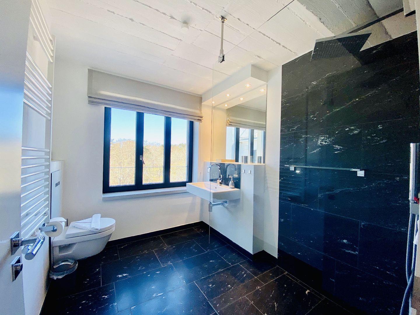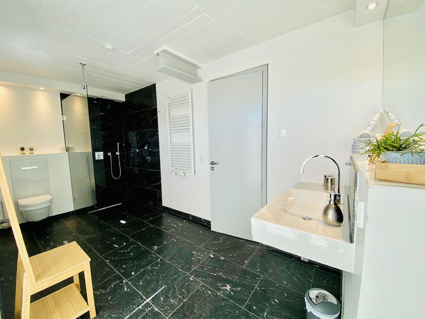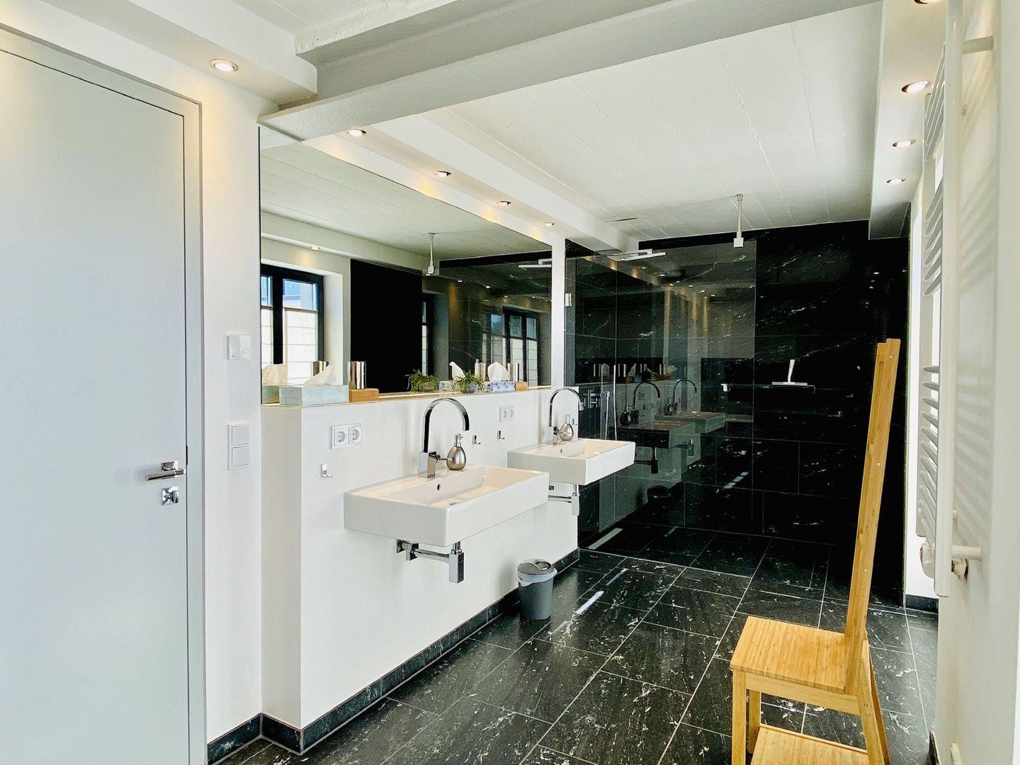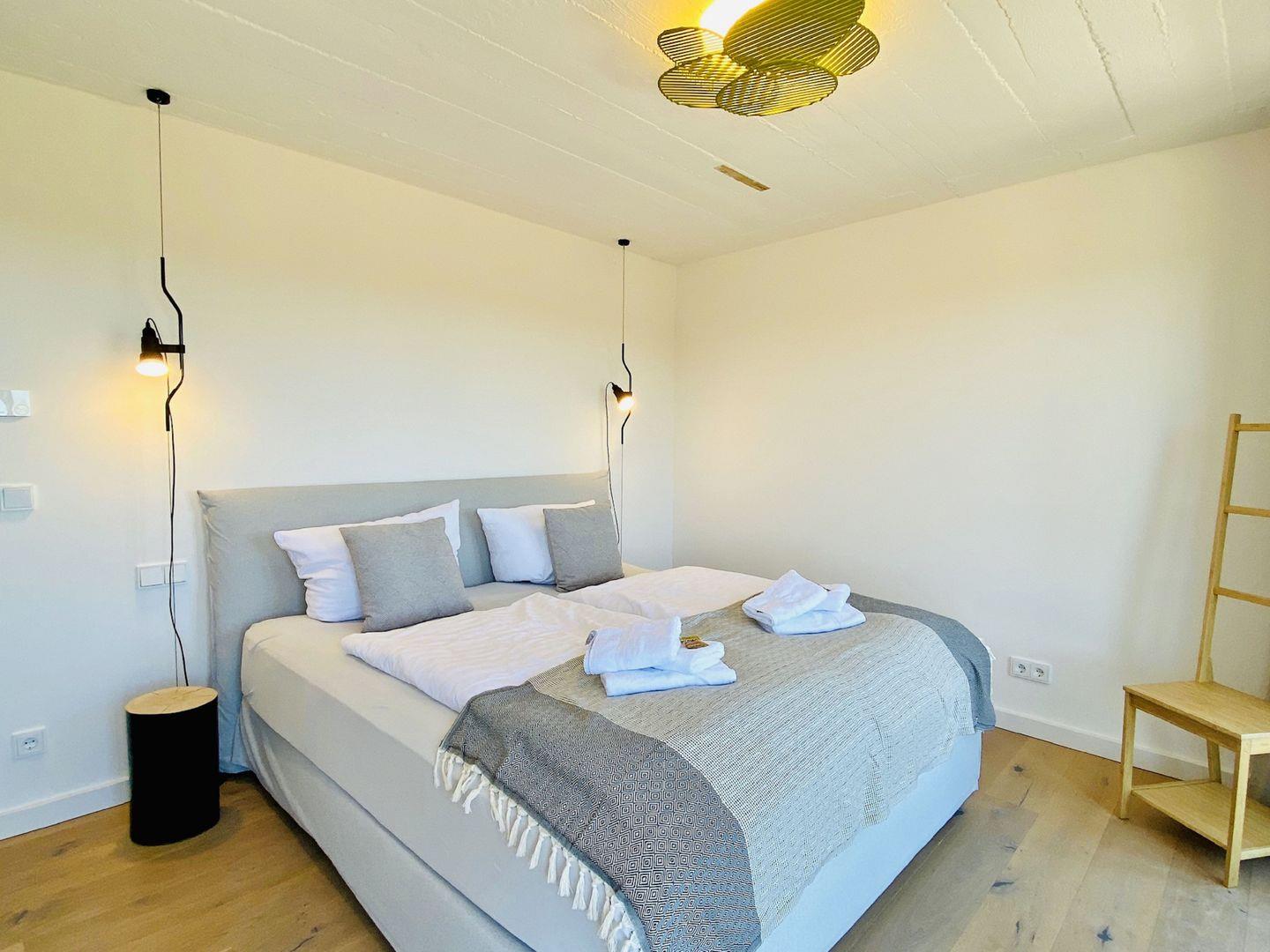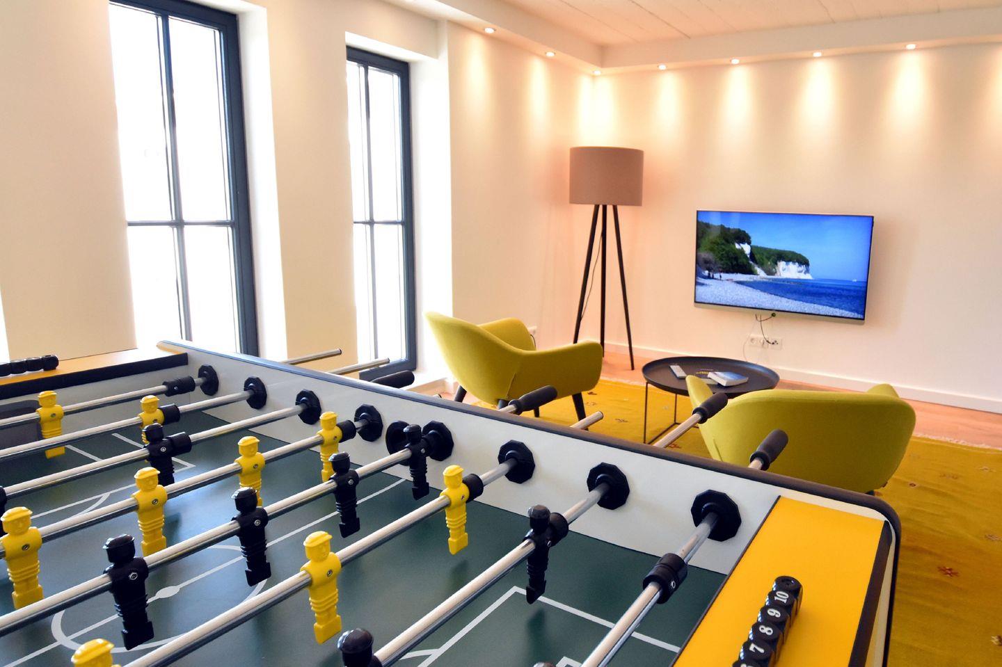 Edler Holzfußboden, natürliche Materialien, hochwertiges Mobiliar. Unser Penthouse 17 in Prora ist für all diejenigen, die sich im Urlaub etwas gönnen möchten. Die Wohnung verfügt über 5 Schlafzimmer mit traumhaftem Doppel Boxspringbett von der Marke SCHRAMM. Vier Schlafzimmer haben einen TV. Zu jedem Schlafzimmer gehört ein Badezimmer mit Dusche, WC und Waschtisch. Ein Badezimmer hat zusätzlich eine Badewanne. Die RUKU-Sauna mit Fenster zur Seeseite kann jederzeit genutzt werden. Ein Gäste-WC ist vom Wohnzimmer aus zugänglich. Der Wohnraum ist ausgestattet mit Küchenzeile, Esstisch, Sideboard mit Flachbild TV mit Zugang zu ausgewählten SKY Sendern, Kamin, Sessel, Lounge und Sofa. Ein Spielzimmer mit TV und Kickertisch steht ebenfalls zur Verfügung. Im Haus befindet sich ein Fahrstuhl. Der Fahrstuhl fährt Sie direkt bis in die Wohnung. Natürlich nur mit Schlüssel.