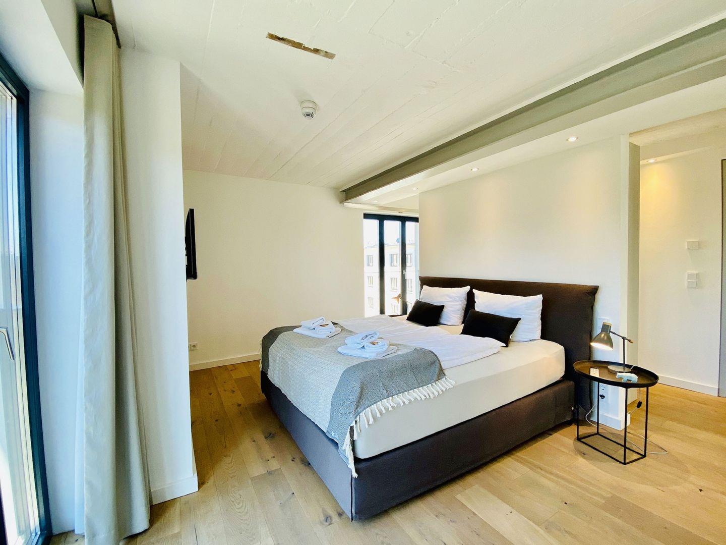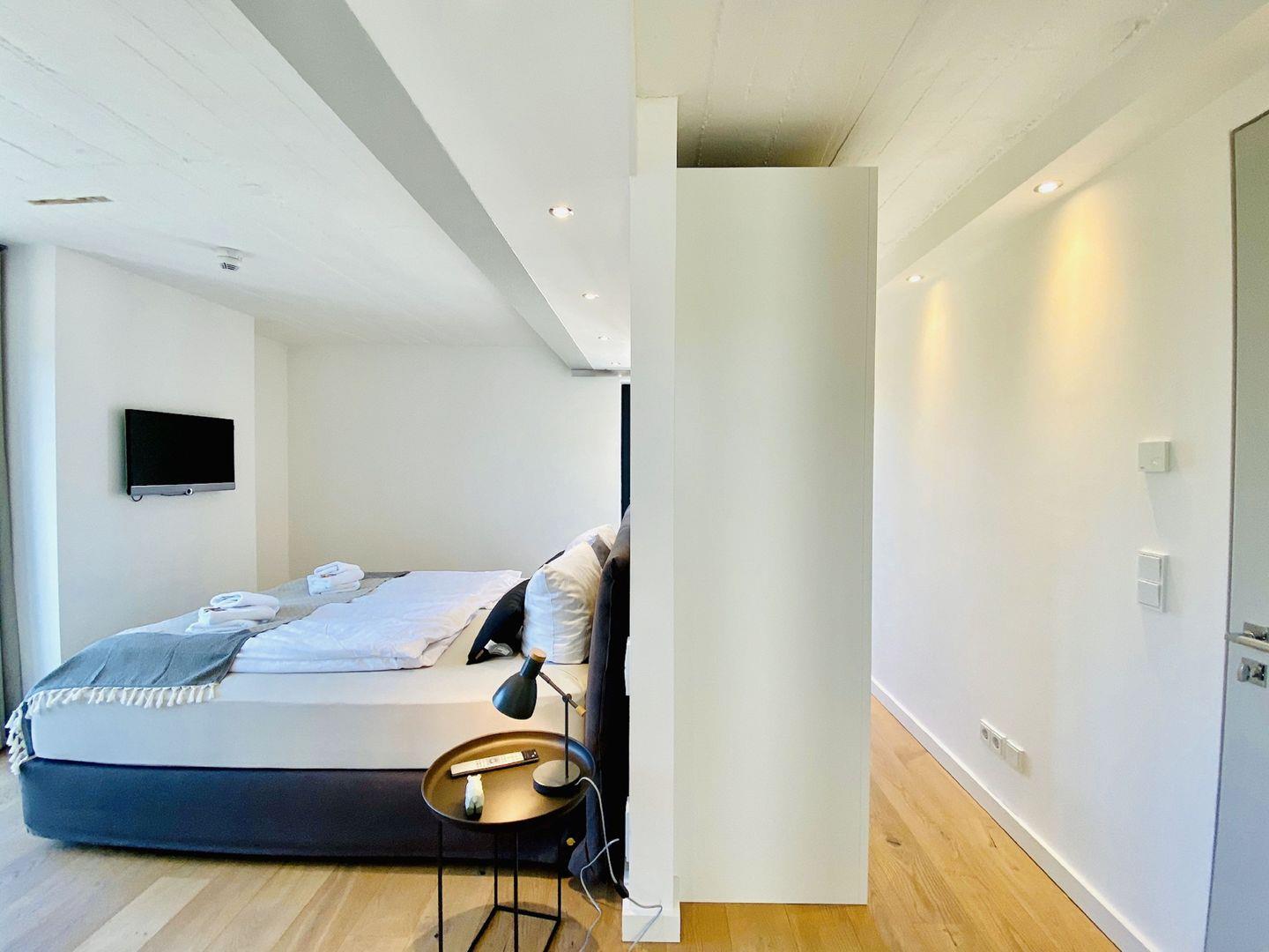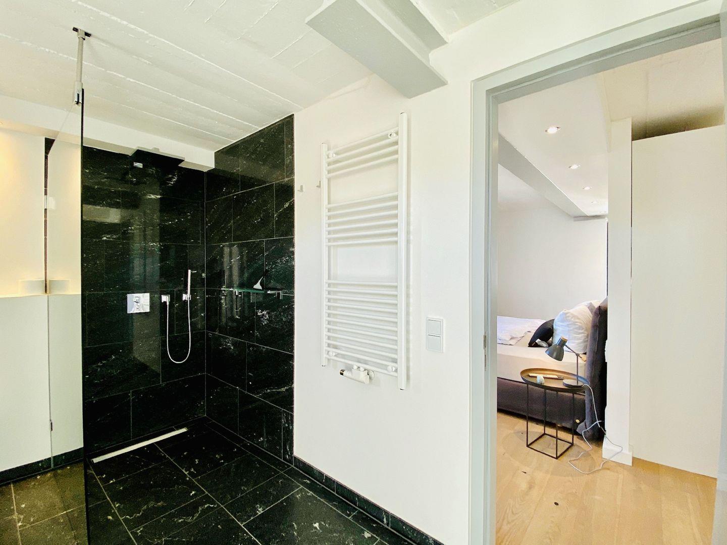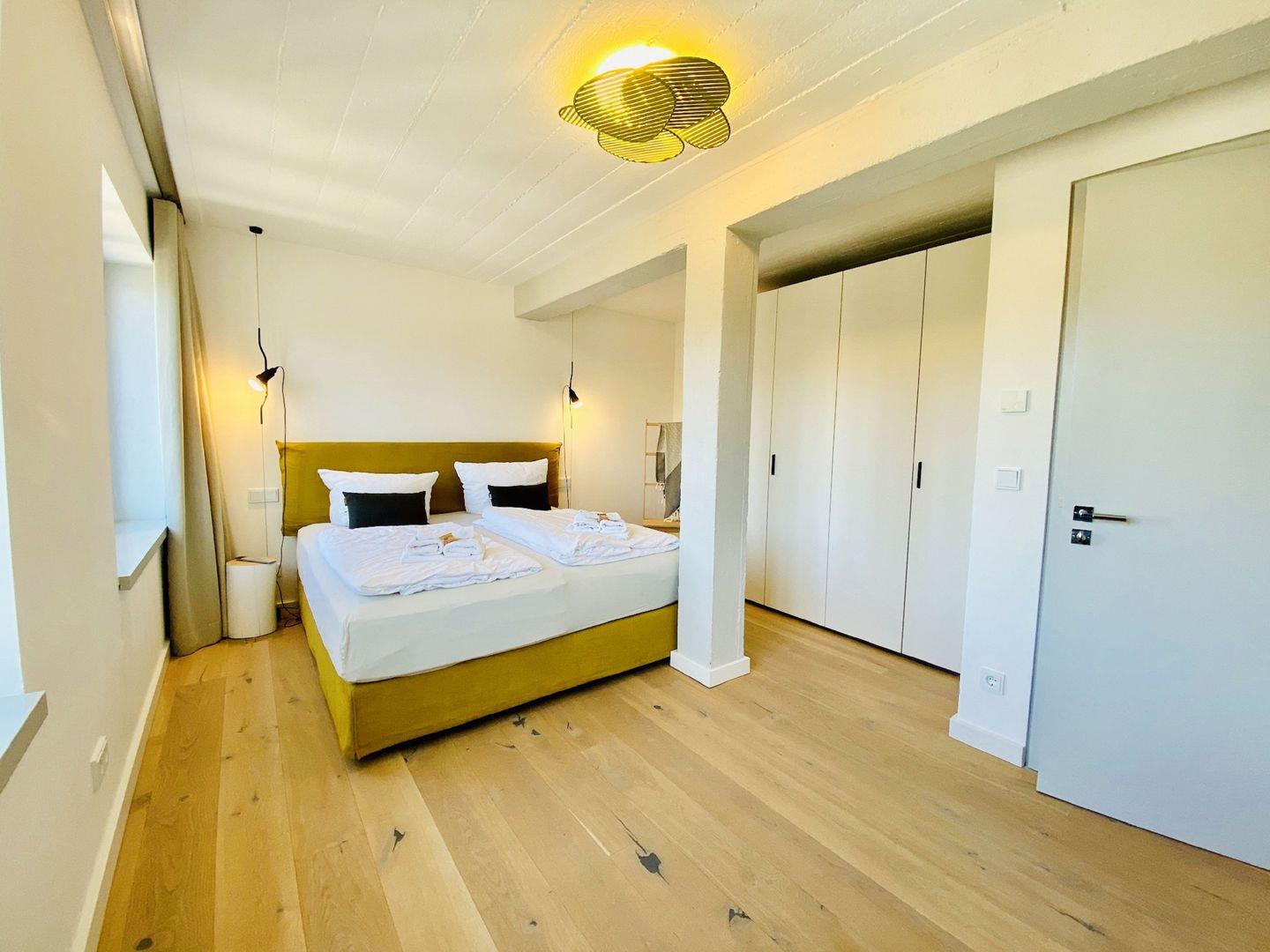 Edler Holzfußboden, natürliche Materialien, hochwertiges Mobiliar. Unser Penthouse 17 in Prora ist für all diejenigen, die sich im Urlaub etwas gönnen möchten. Die Wohnung verfügt über 5 Schlafzimmer mit traumhaftem Doppel Boxspringbett von der Marke SCHRAMM. Vier Schlafzimmer haben einen TV. Zu jedem Schlafzimmer gehört ein Badezimmer mit Dusche, WC und Waschtisch. Ein Badezimmer hat zusätzlich eine Badewanne. Die RUKU-Sauna mit Fenster zur Seeseite kann jederzeit genutzt werden. Ein Gäste-WC ist vom Wohnzimmer aus zugänglich. Der Wohnraum ist ausgestattet mit Küchenzeile, Esstisch, Sideboard mit Flachbild TV mit Zugang zu ausgewählten SKY Sendern, Kamin, Sessel, Lounge und Sofa. Ein Spielzimmer mit TV und Kickertisch steht ebenfalls zur Verfügung. Im Haus befindet sich ein Fahrstuhl. Der Fahrstuhl fährt Sie direkt bis in die Wohnung. Natürlich nur mit Schlüssel.