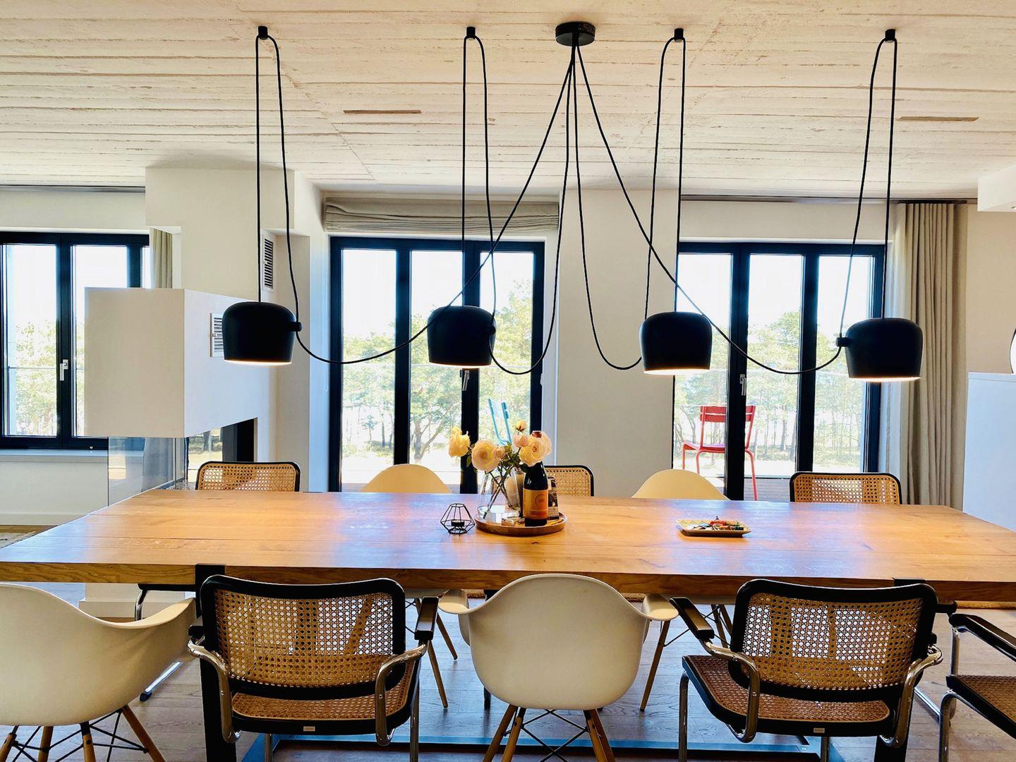 Der Ausblick von der 50 m² großen Dachterrasse über die Binzer Bucht und die Ostsee ist einfach unglaublich. Man fühlt sich wie ein Seeadler, der von ganz oben auf das glitzernde Meer hinunterblickt. Atmen Sie tief durch und genießen Sie das Gefühl von Freiheit in unserer schönsten Luxus-Ferienwohnung in Prora. Es gibt nichts romantischeres, als mit den Liebsten im Arm den Sonnenaufgang über der Ostsee zu erleben. Das freshe Design des Wohn- und Essbereichs lädt zu entspannten Urlaubsabenden ein.