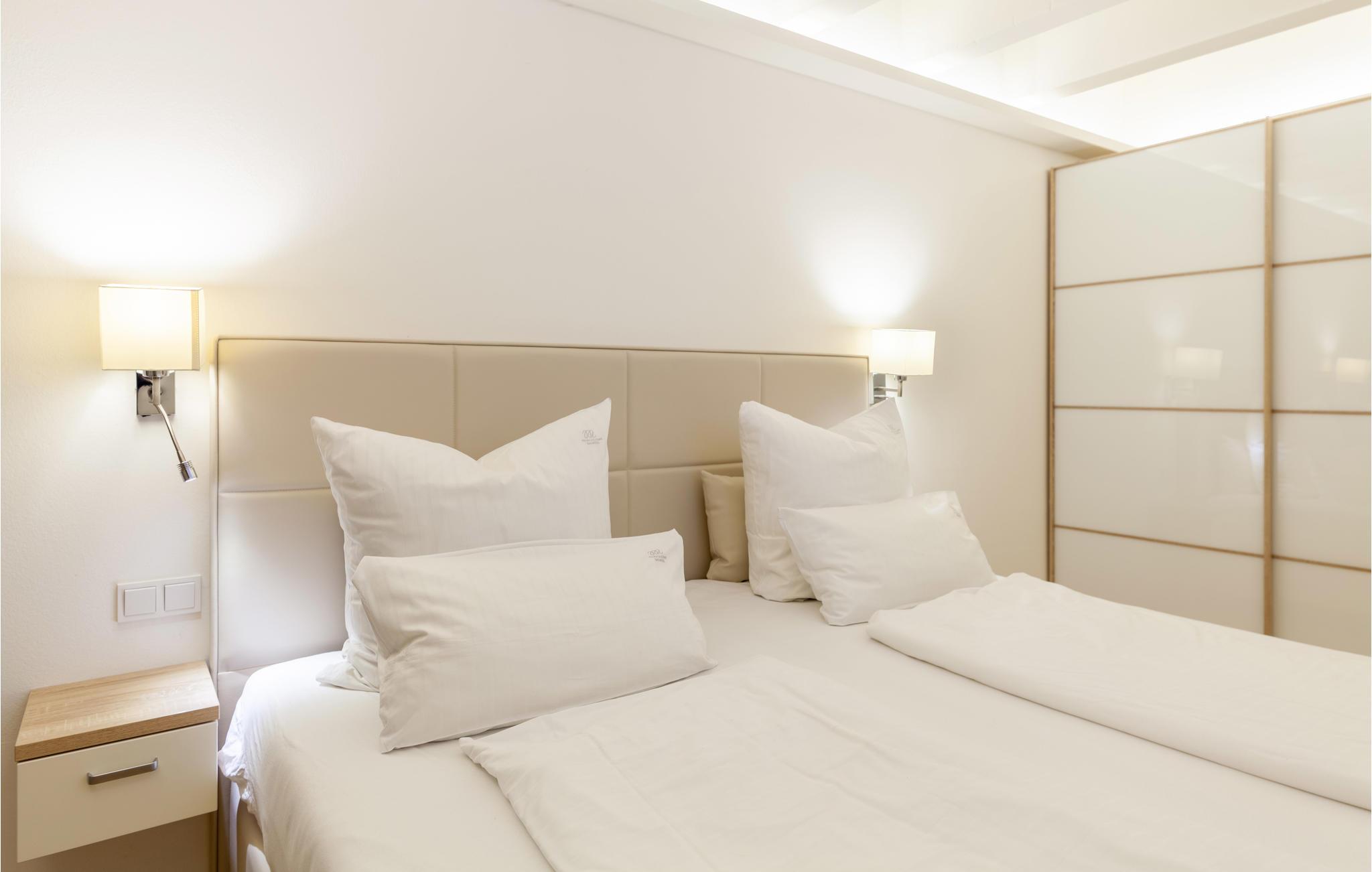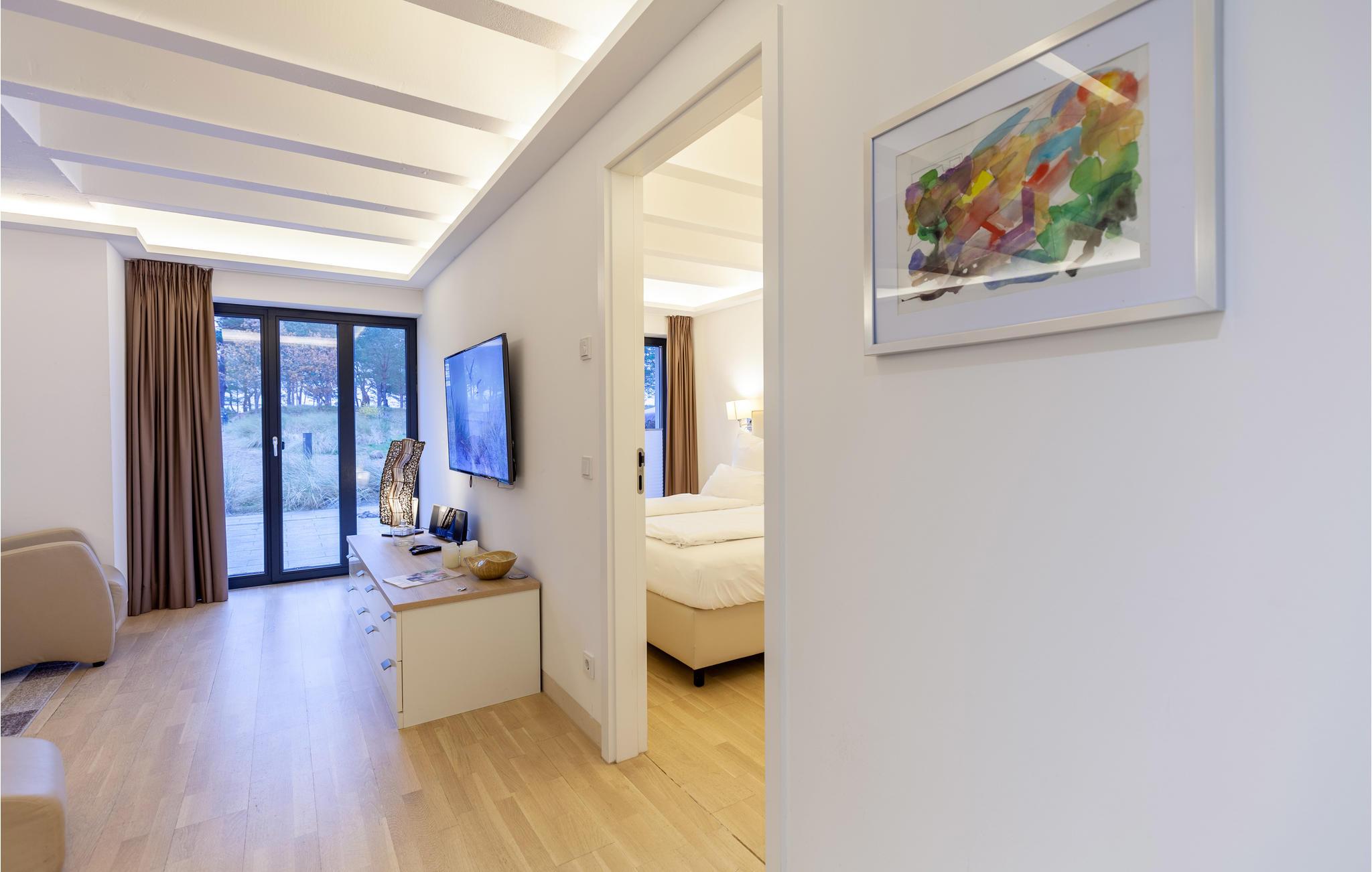 Soveværelset er udstyret med en særdeles luksuriøs dobbeltseng (2 x 2 m) af høj kvalitet og eget tv. Dertil byder lejligheden på sovemulighed for yderligere to gæster i det store boligområde med en komfortabel sovesofa (1,60 x 2,00 m). På lejlighedens store, private terrasse har I moderne havemøbler til rådighed. På solsengene kan I tilbringe afslappede timer i Østersøens rare luft.