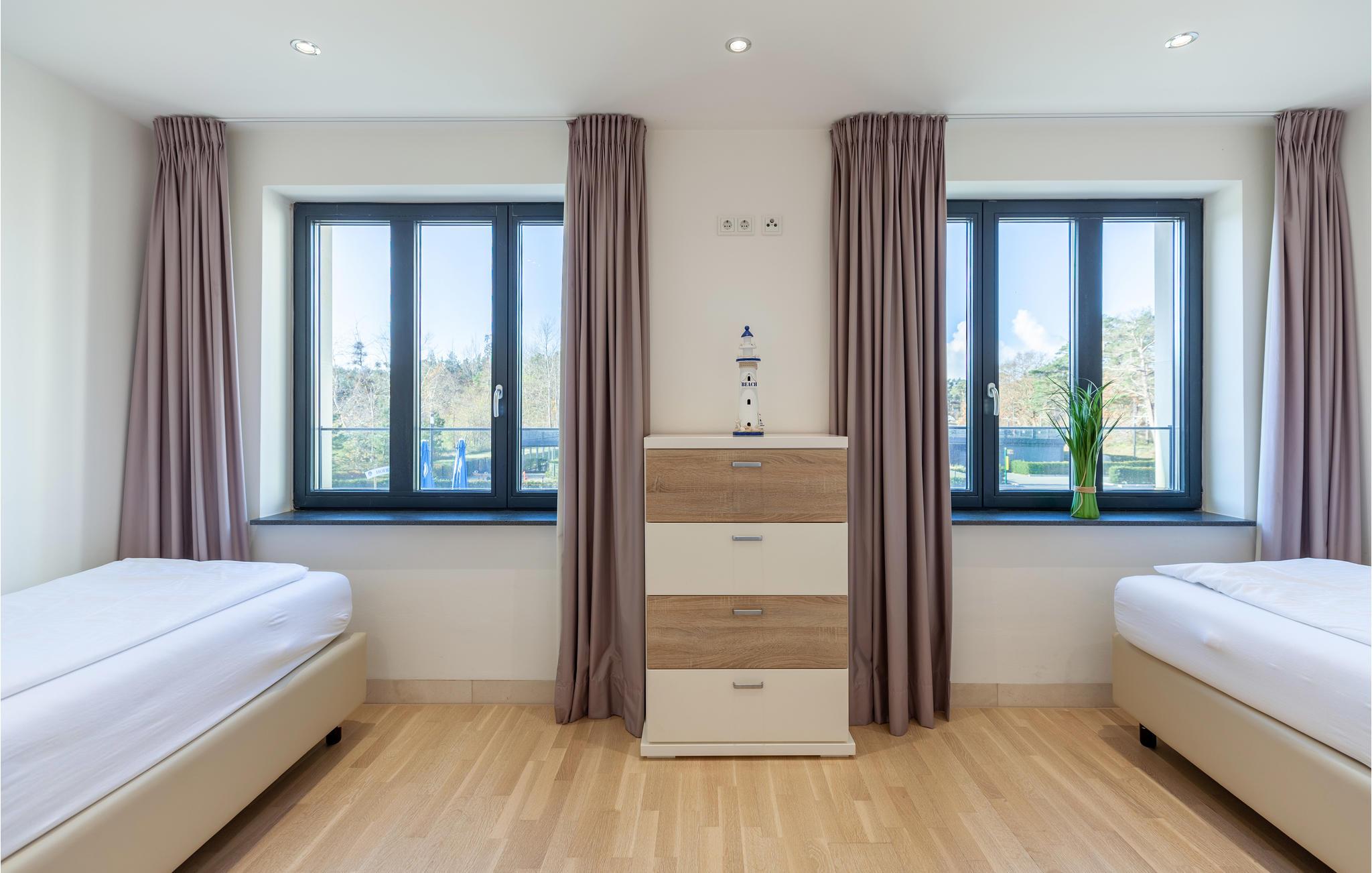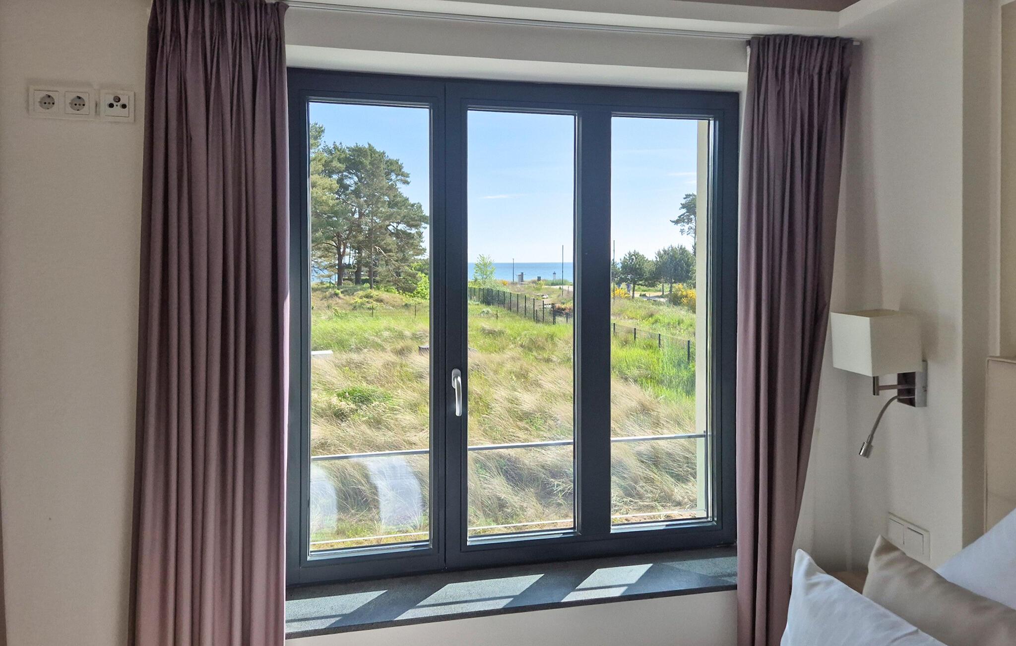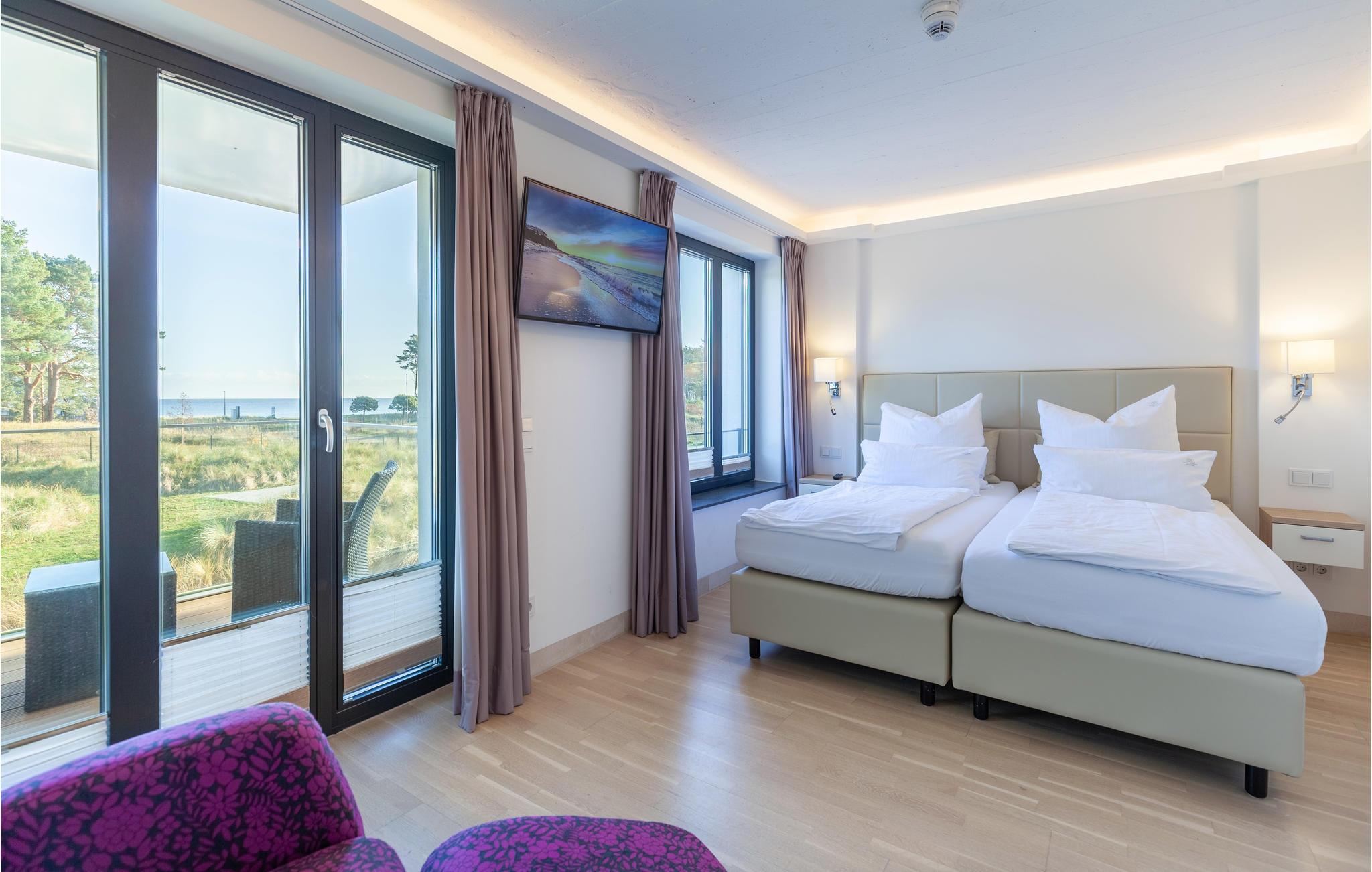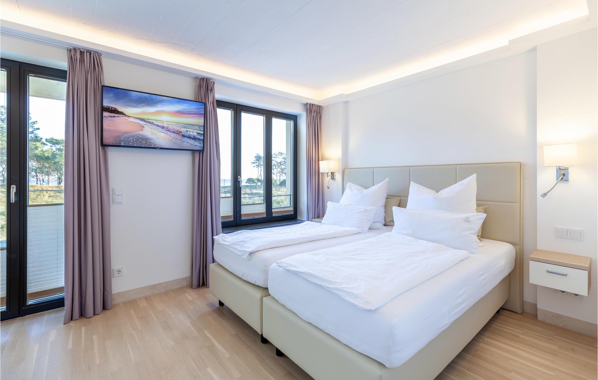 Fra det store soveværelse med eget tv på 1. sal og fra altanen kan I nyde den herlige udsigt over parken og fyrreskoven helt til Østersøen og slappe helt af. I soveværelse 1 med direkte adgang til altanen sørger en stor dobbeltseng (1,80 x 2,00 m) for afslappende nætter, og i soveværelse 2 er der to enkeltsenge. Sofaen i stuen kan blive foldet ud til en komfortabel sovemulighed (1,60 x 2,00 m).