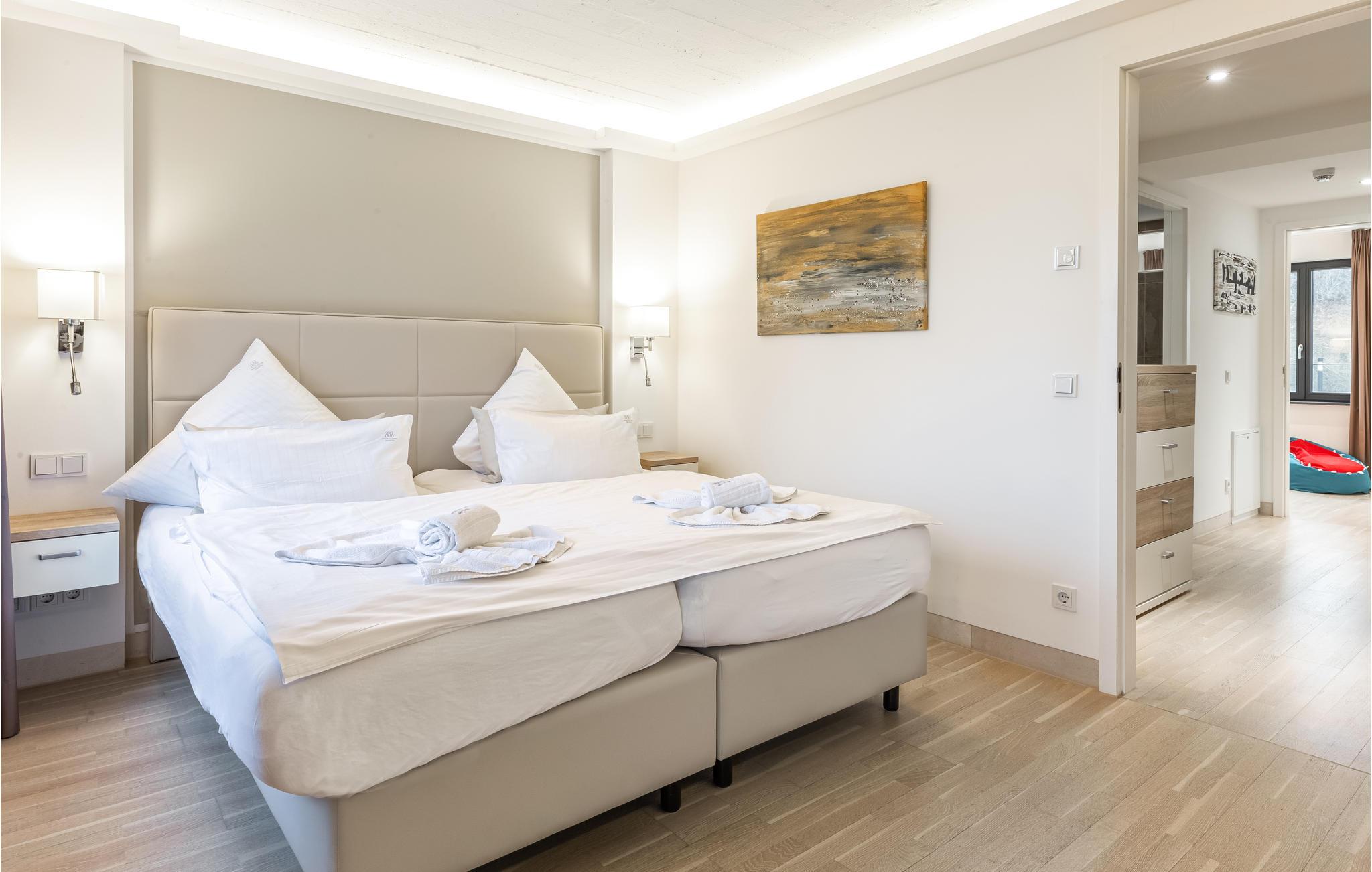 Fra det store soveværelse med eget tv på 1. sal og fra altanen kan I nyde den herlige udsigt over parken og fyrreskoven helt til Østersøen og slappe helt af. Den helt store seng på 2 x 2 meter sørger for dejlig søvn. I det andet soveværelse er der også stort tv og en dobbeltseng (1,60 meter x 2,00 m). Sofaen i stuen kan blive foldet ud til to komfortable sovemuligheder (1,60 x 2,00 m).
