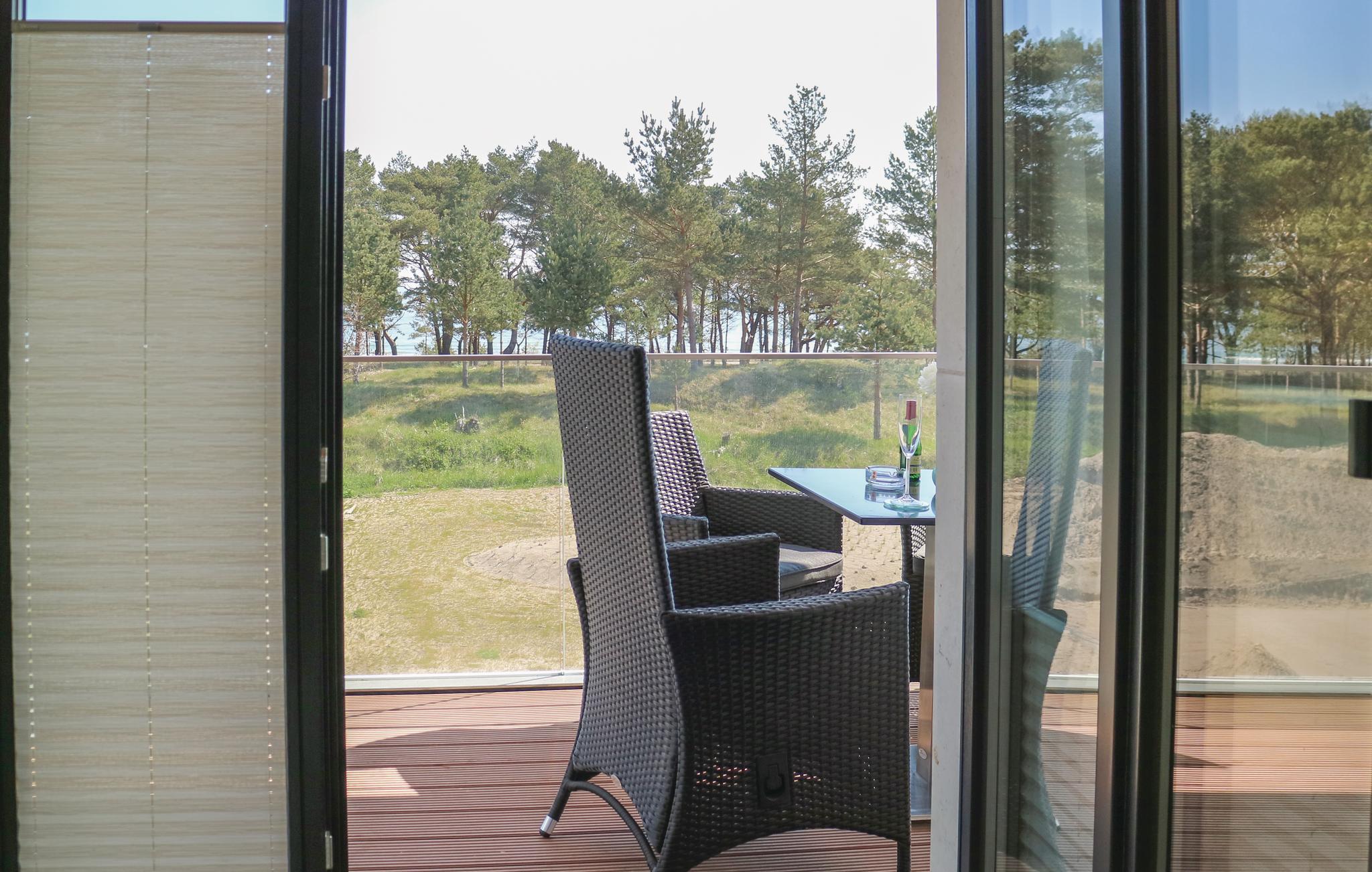 Fra den lyse, åbne stue har I adgang til jeres private, ca. 10 m² store altan med udsigt helt til Østersøen. Sofaen kan foldes ud til to komfortable sovepladser (1,60 x 2,00 m).
