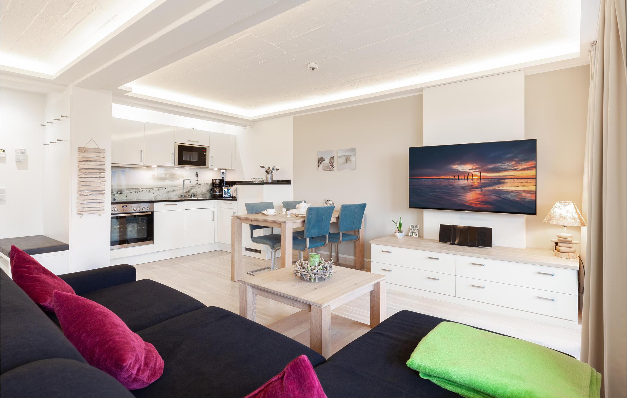 På over 40 m² kan I finde alt, som I har brug for i disse luksuriøst udstyrede lejligheder. Det generøse, åbne stueområde gennemstrømmes af lys fra de store vinduespartier, og I har udsigt over den lille fyrreskov og helt til Østersøens turkisblåt vand. Igennem to store døre træder I ud på den næsten 10 m² store altan med havemøbler af høj kvalitet. Ren afslapning. Der er eget tv i det særskilte soveområde, der er lukket med en moderne skydedør. Sofaen i stuen kan foldes ud til to komfortable sovepladser (1,60 x 2,00 m).