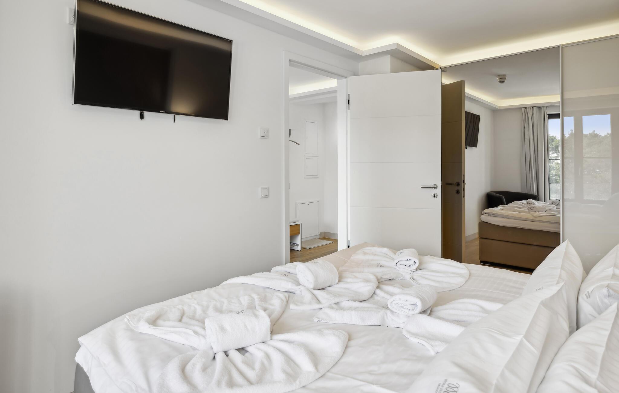 Fra det store soveværelse med eget tv på 1. sal og fra altanen kan I nyde den herlige udsigt over parken og fyrreskoven helt til Østersøen og slappe helt af. Den helt store seng på 2 x 2 meter sørger for dejlig søvn. I det andet soveværelse er der også stort tv og en dobbeltseng (1,60 meter x 2,00 m). Sofaen i stuen kan blive foldet ud til to komfortable sovemuligheder (1,60 x 2,00 m). Huset er udstyret med moderne underholdningselektronik af høj kvalitet: Ud over tv-apparaterne har I også en ipad og et højkvalitets musikanlæg til rådighed.