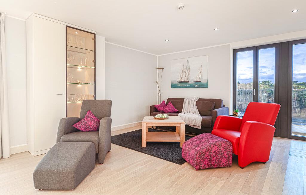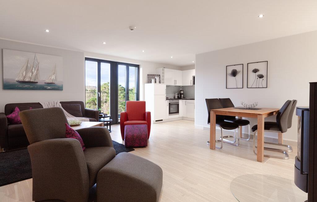 Den store stue med moderne køkkenhjørne er særligt lys. På køligere aftener kan I gøre det behageligt foran den knitrende ild. Den smukke strand og det parklignende udendørsområde Prora Solitaire ligger direkte på den anden side af bygningen.